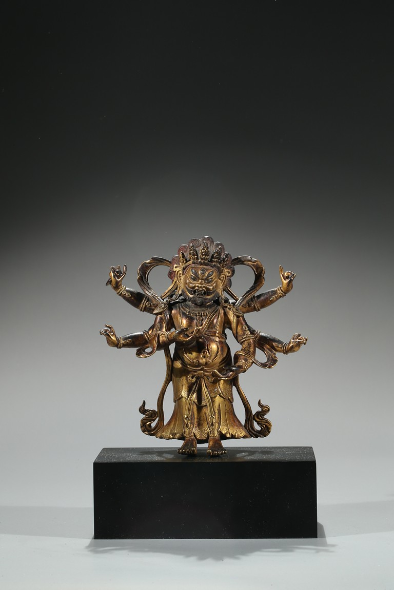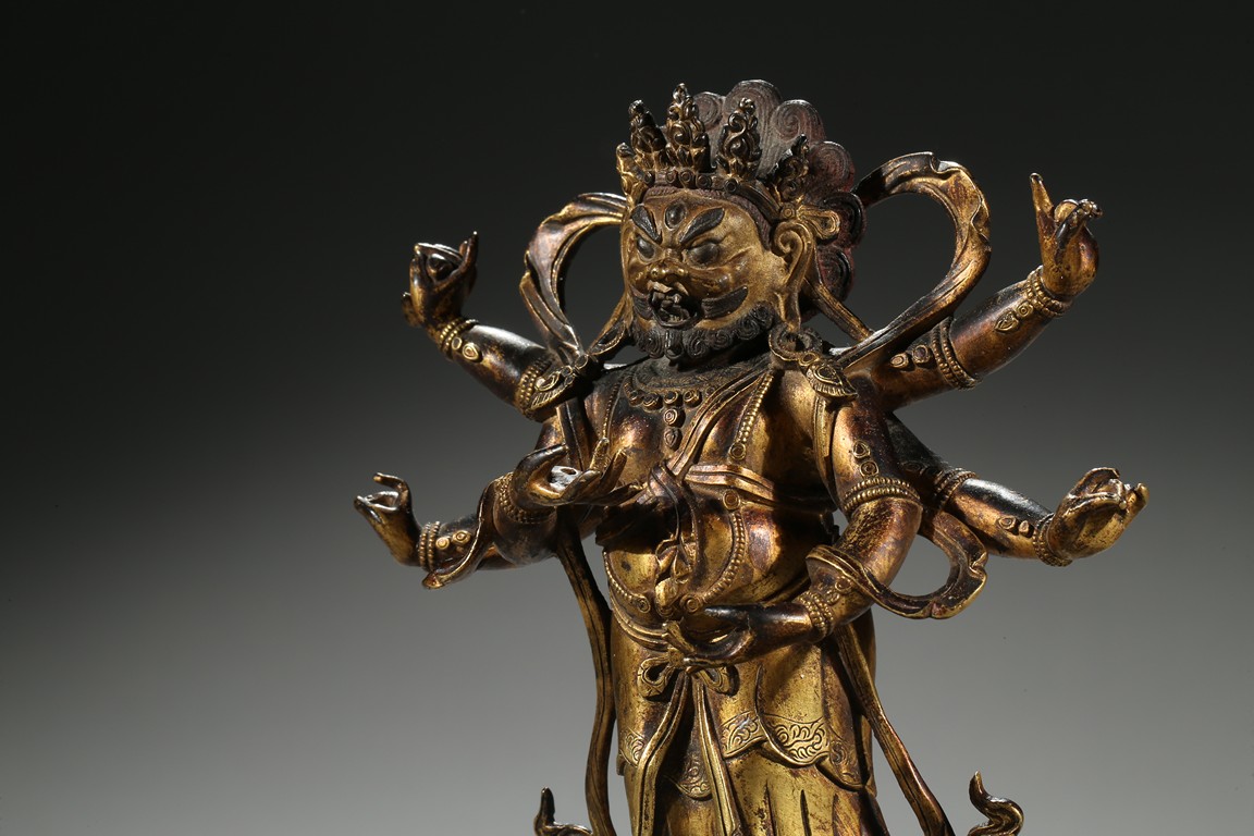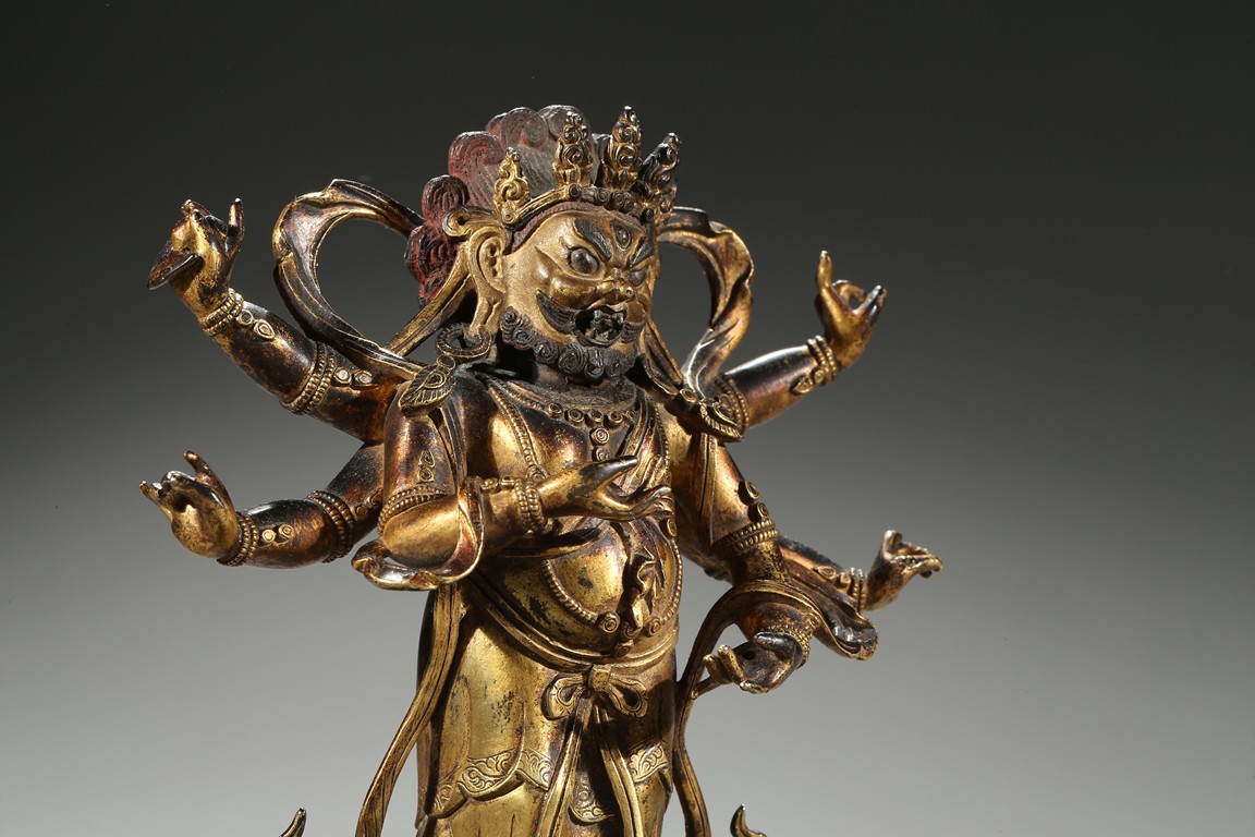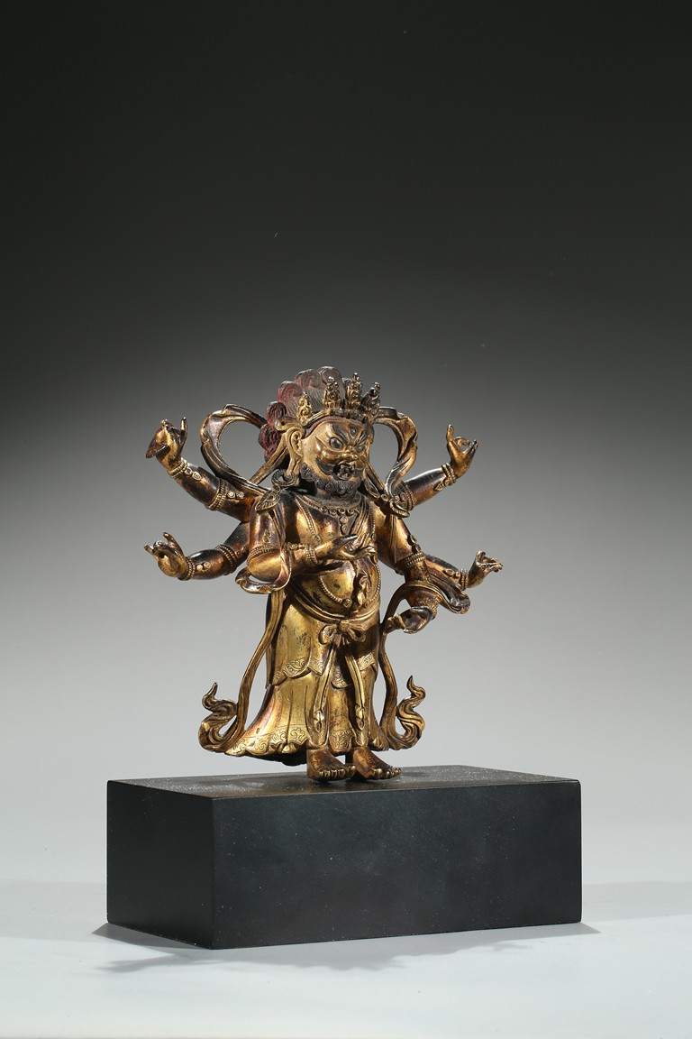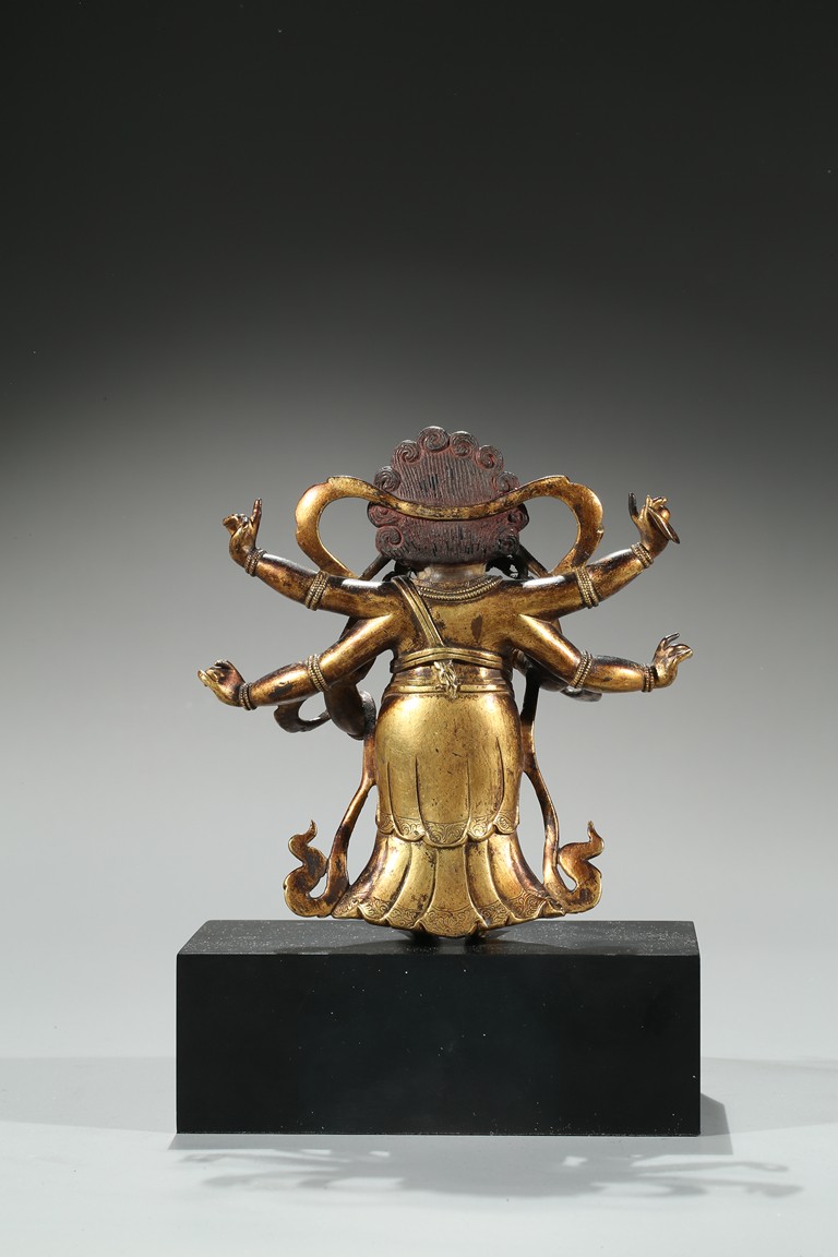 The bodhisattva is shown standing with six radiating arms, wearing loose fitting robe incised with floral scroll on the hems, adorned with beaded necklaces, the face with ferocious expression, the hair painted with red pigments. Qing Dynasty period
