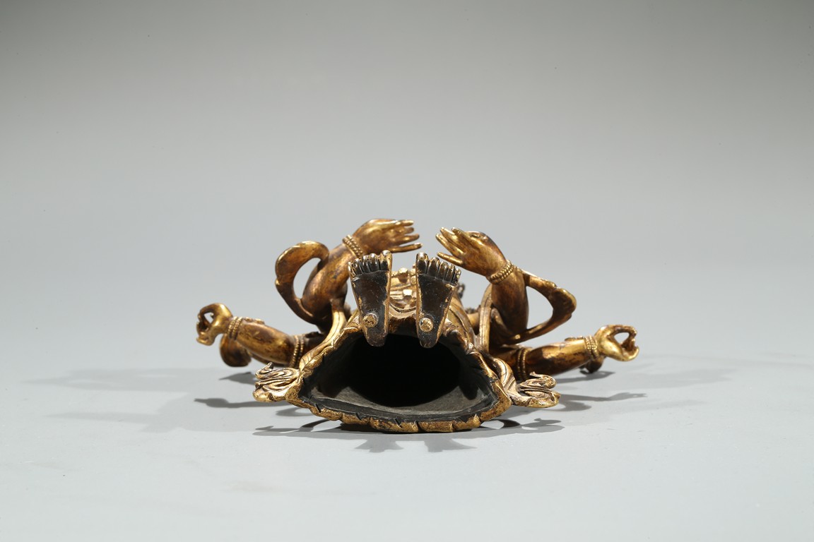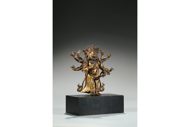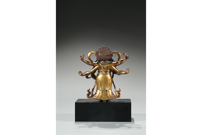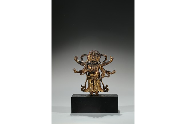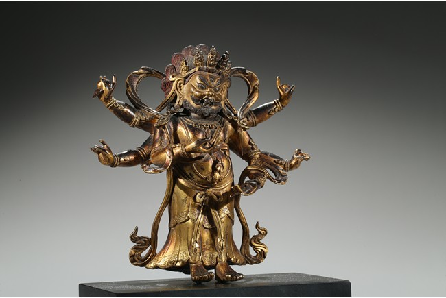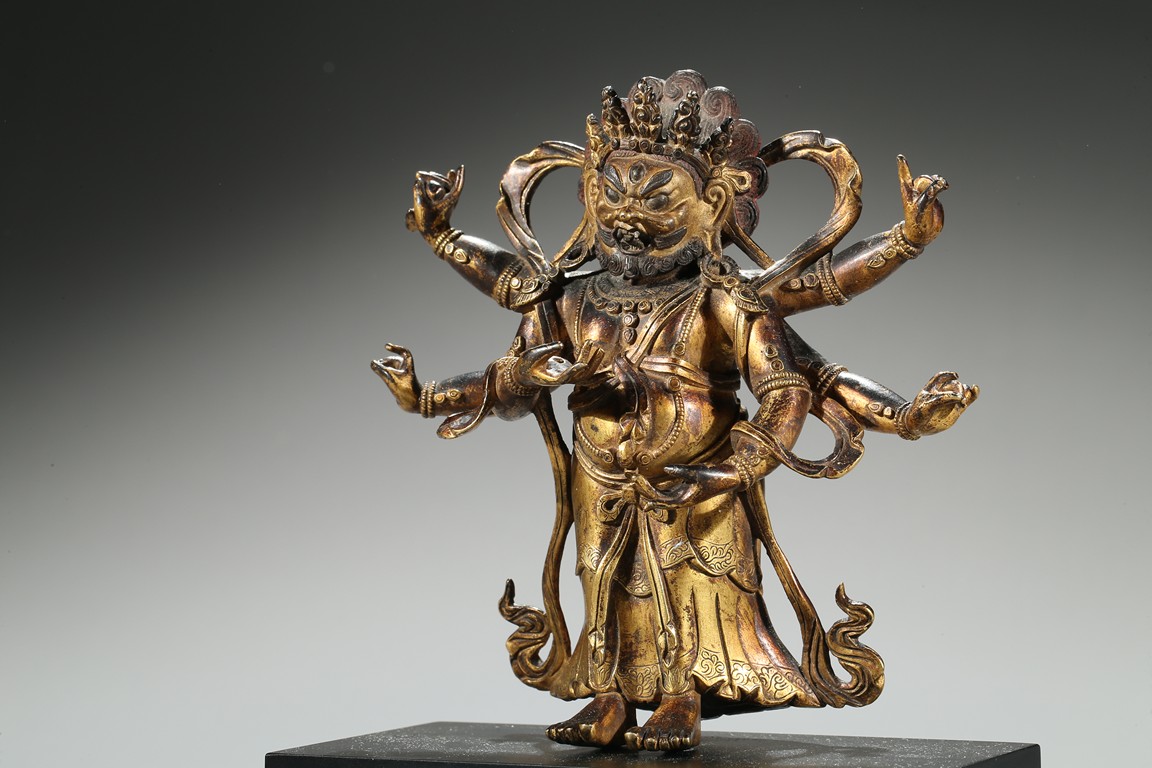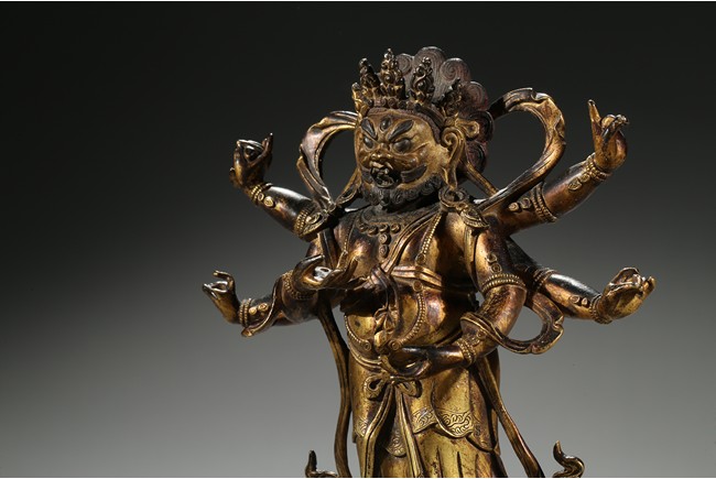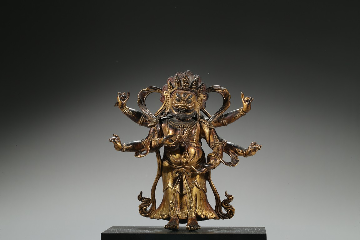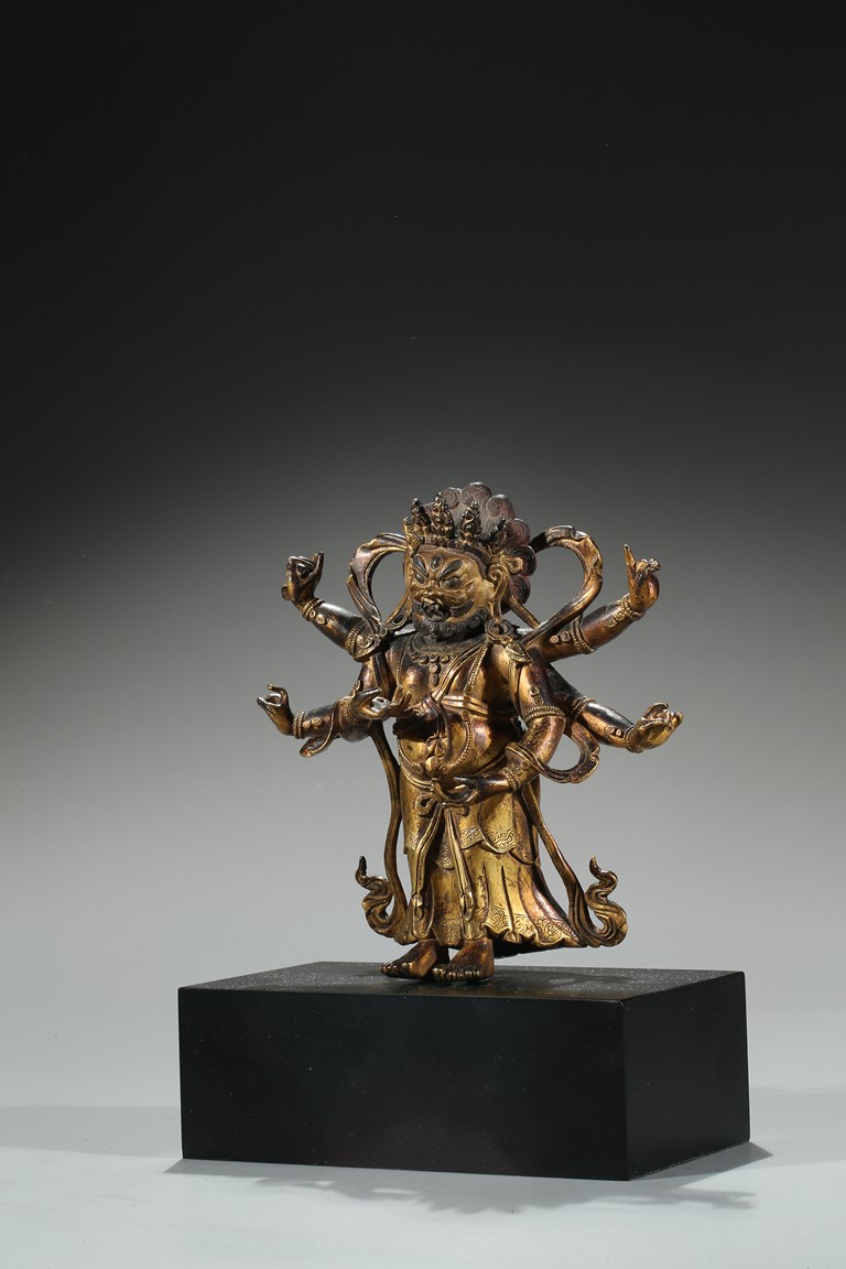 The bodhisattva is shown standing with six radiating arms, wearing loose fitting robe incised with floral scroll on the hems, adorned with beaded necklaces, the face with ferocious expression, the hair painted with red pigments. Qing Dynasty period
