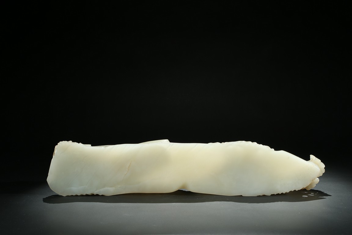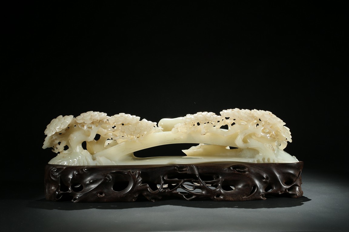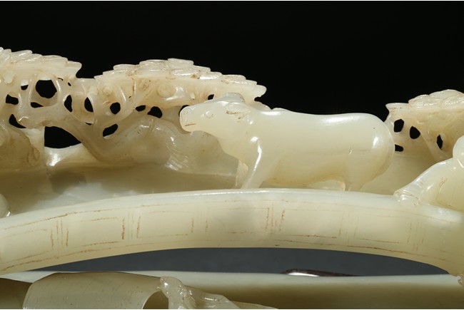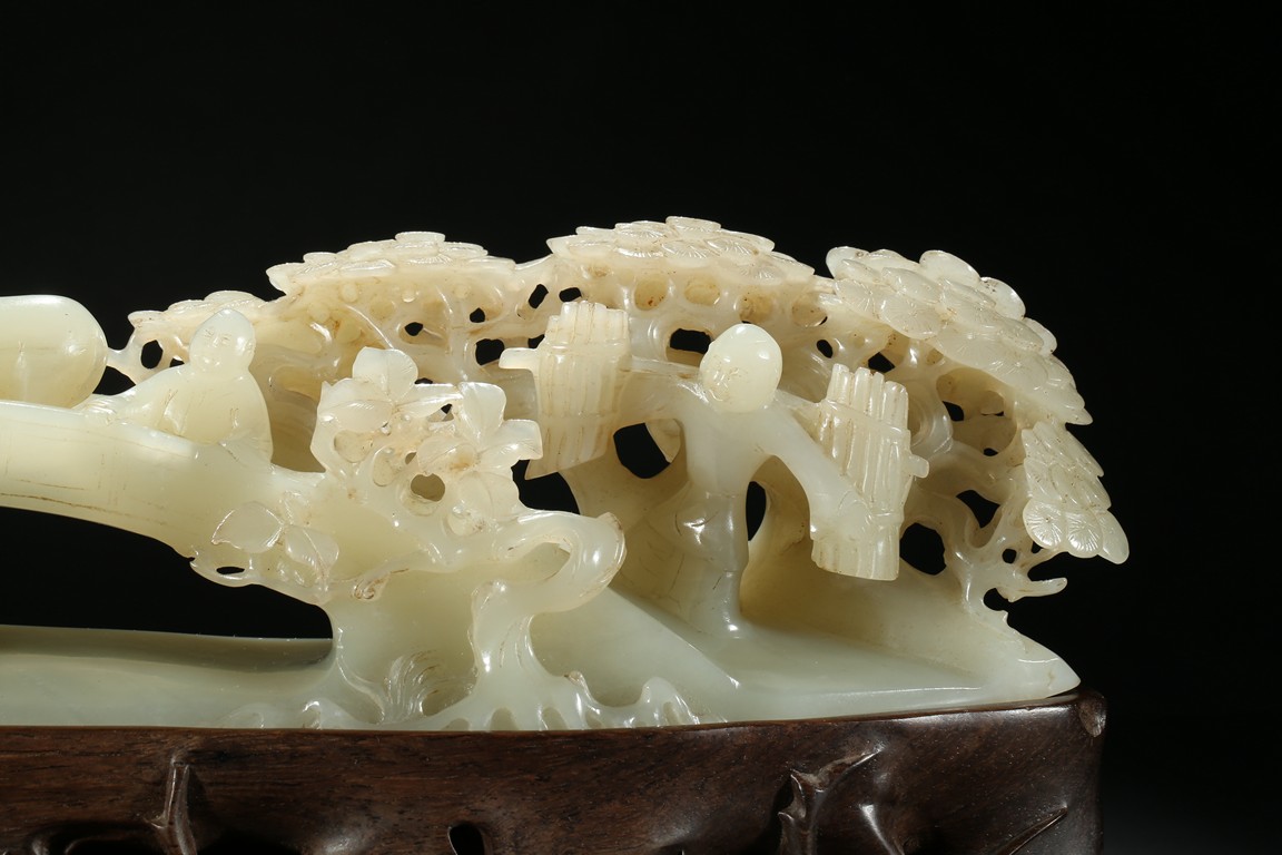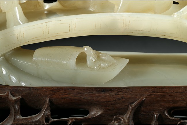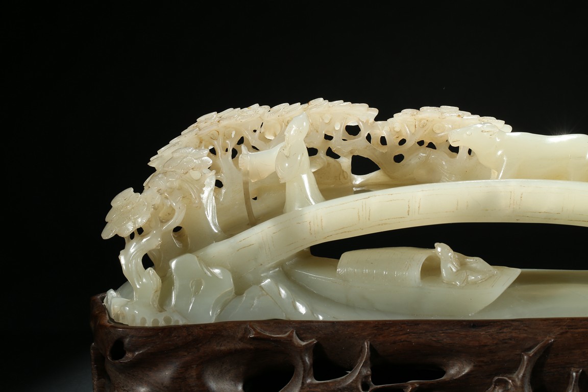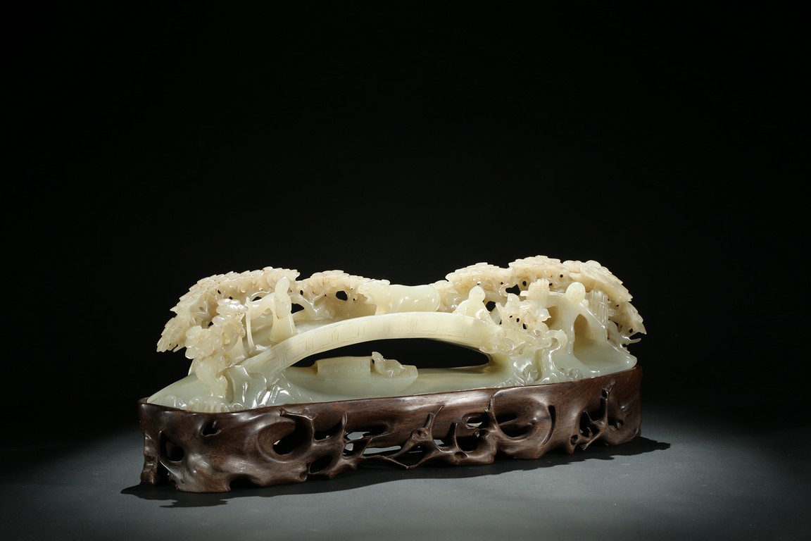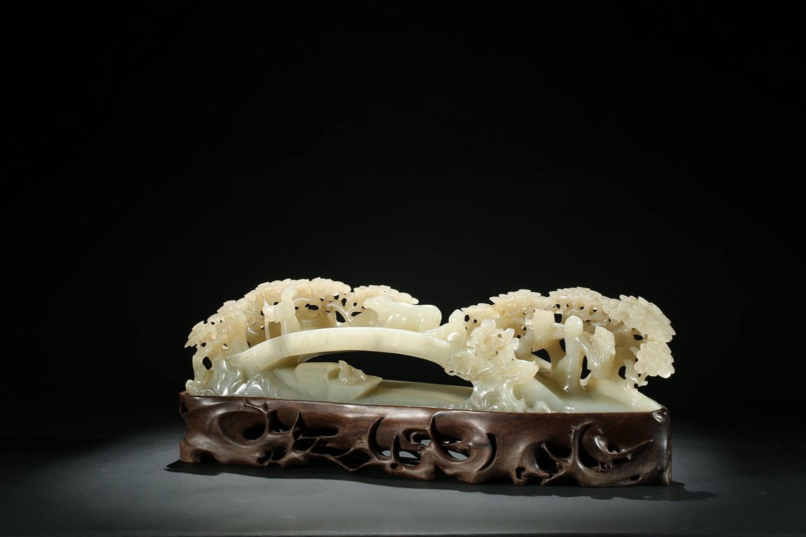 Carved as an arched bridge flanked with pine trees, including an elderly figure descending; a figure with a buffalo; a figure carrying a bucket over shoulder; and a small boat travelling under the bridge. The stone is of semi-translucent even white tone. Accompanied with a wood stand.