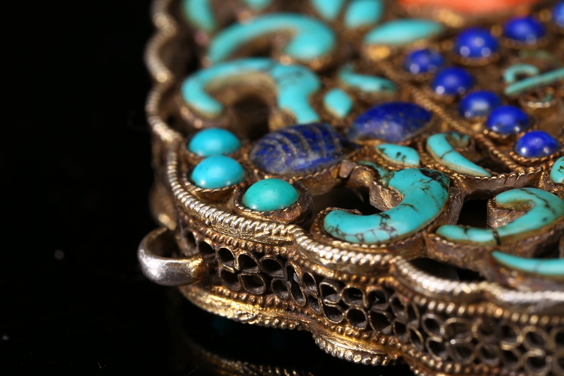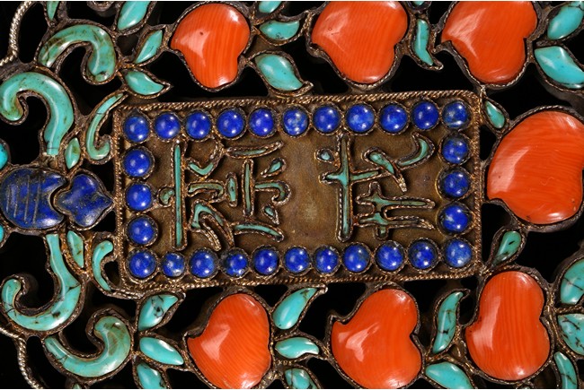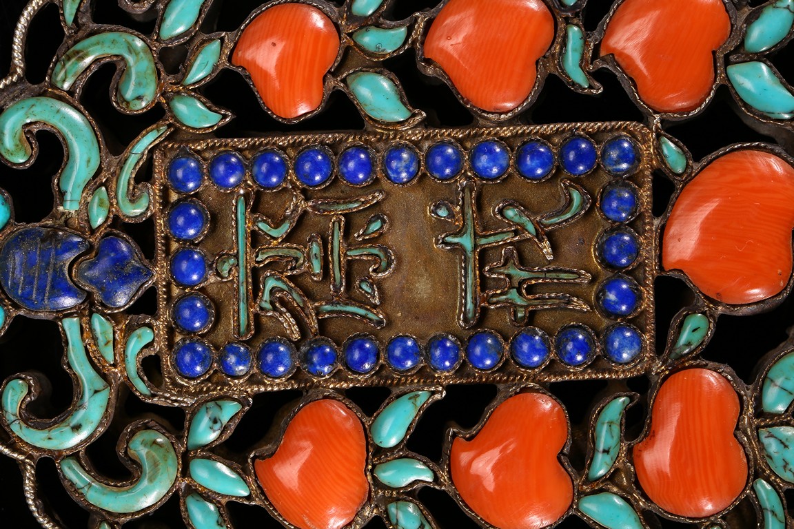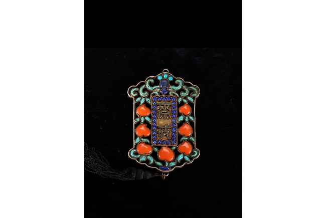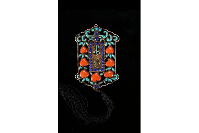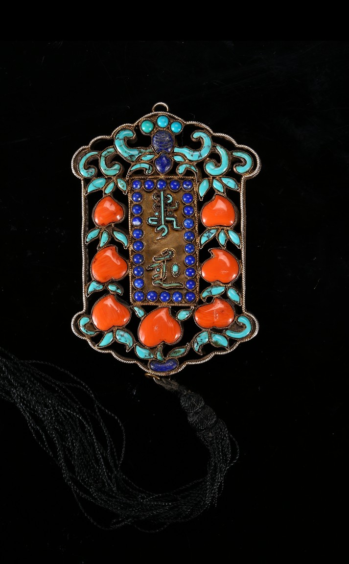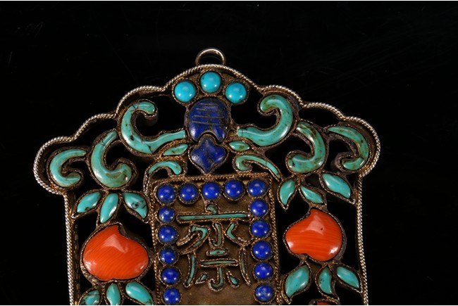 The shaped rectangular pendant inlaid with coral, turquoise, and lapis lazuli to depict a bat and peaches flanking the two character 'Zhai Jie', the reverse with similar decoration flanking two Manchurian characters. Qing Dynasty period.