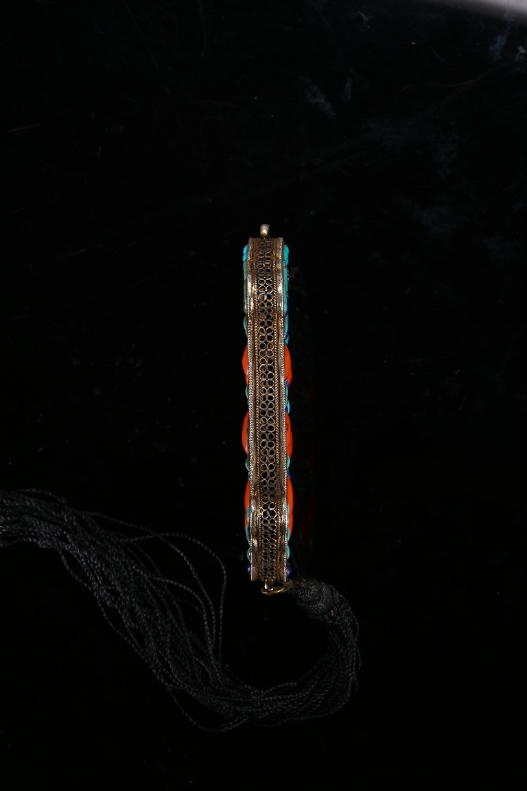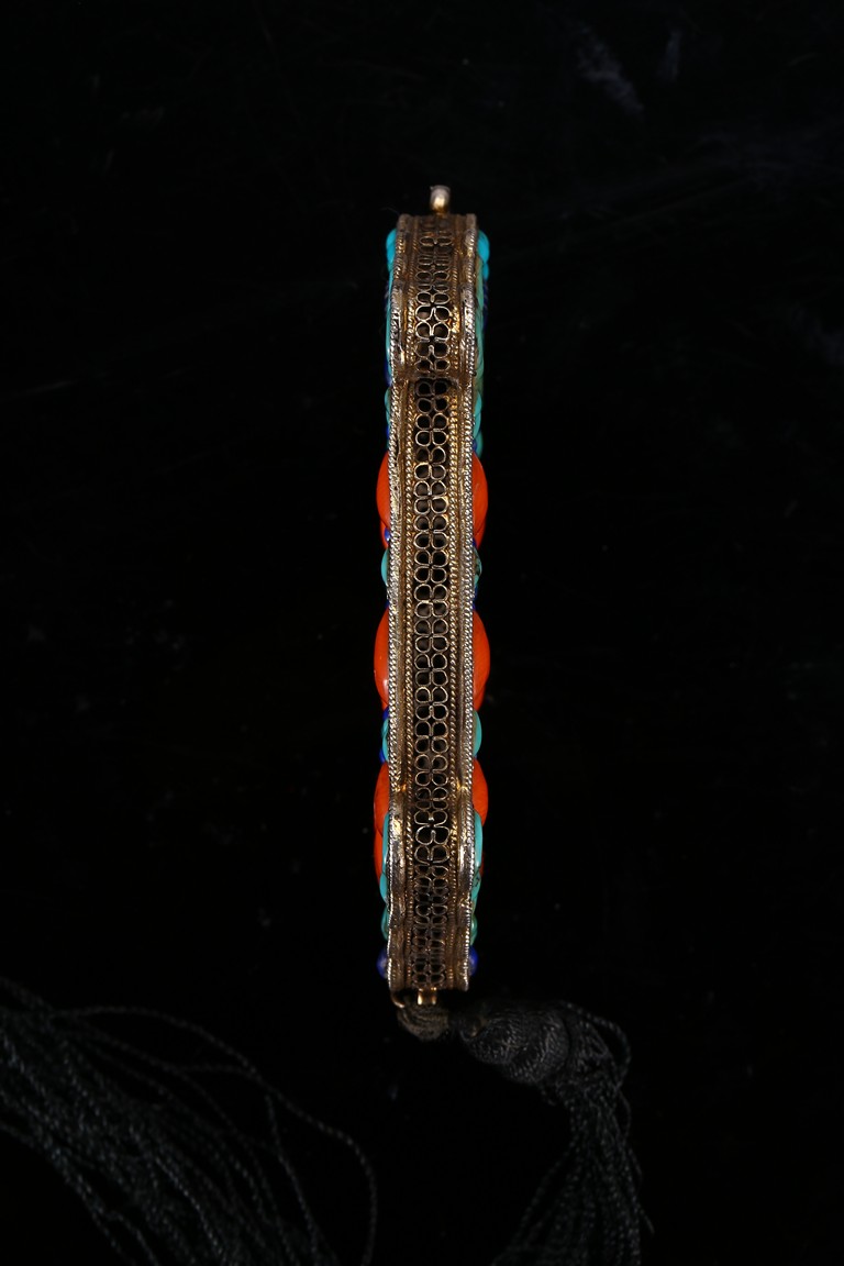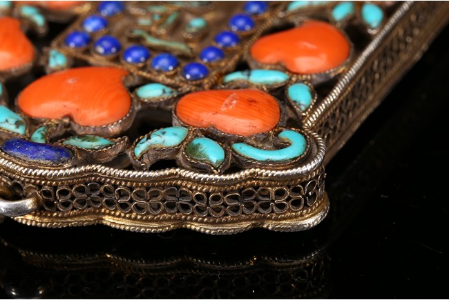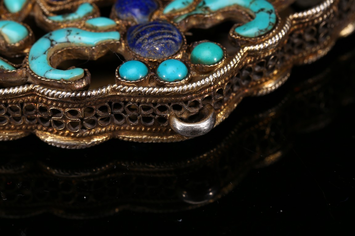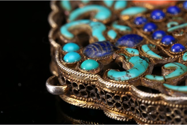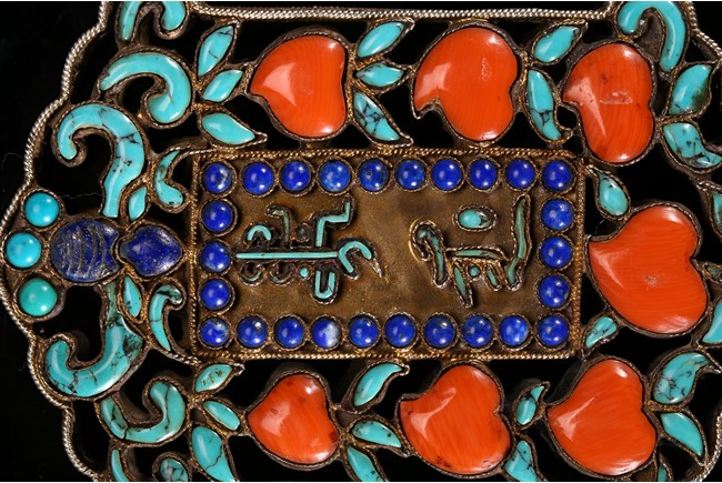 The shaped rectangular pendant inlaid with coral, turquoise, and lapis lazuli to depict a bat and peaches flanking the two character 'Zhai Jie', the reverse with similar decoration flanking two Manchurian characters. Qing Dynasty period.