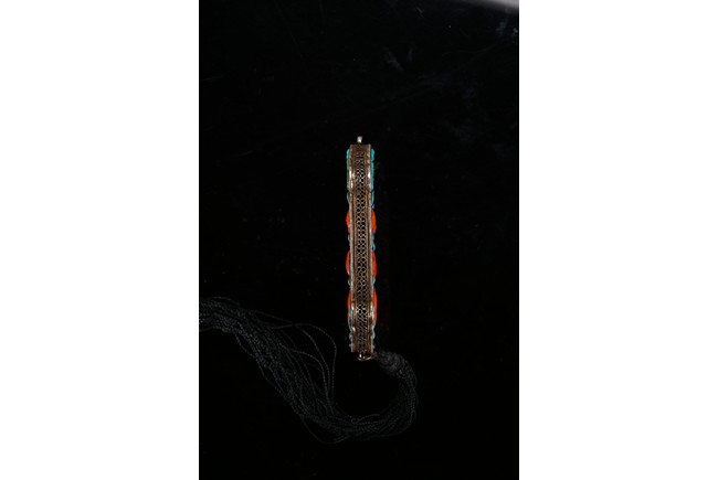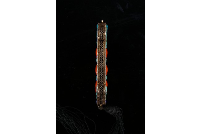 齋戒牌是古代皇帝及文武官員祭祀時掛於身上的警示牌。 《明史禮志》記:“齋者,整齊其內;戒者,禁止其外” 。雍正時期,重新酌定齋戒牌式樣,縮小尺寸,令官員佩於心胸之間,以期簡束身心。此件器物用青金石、綠松石、蜜蠟製作而成。