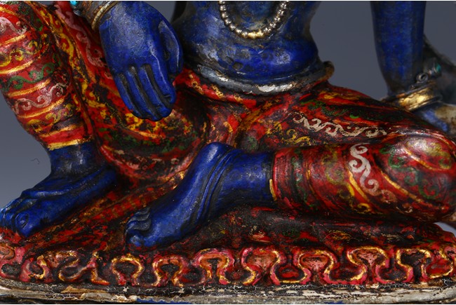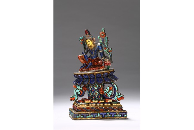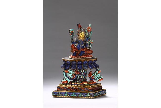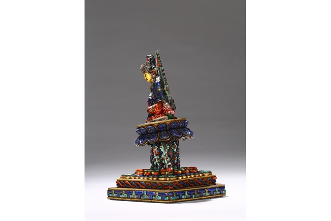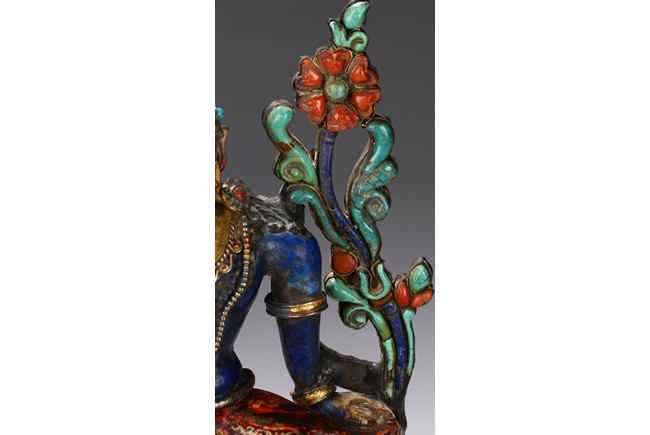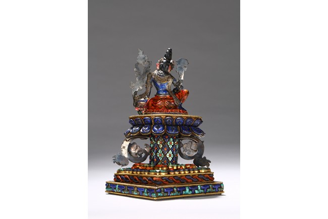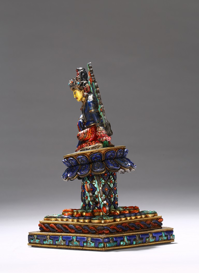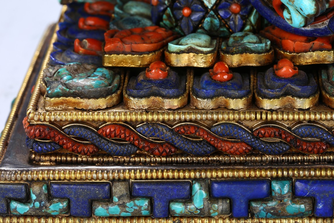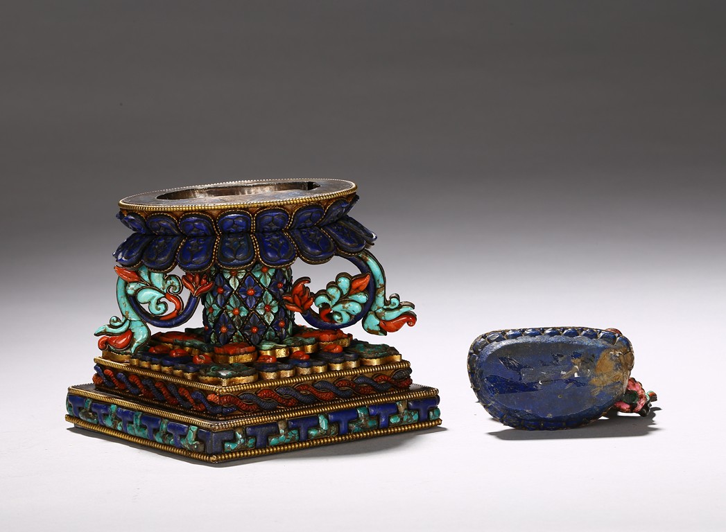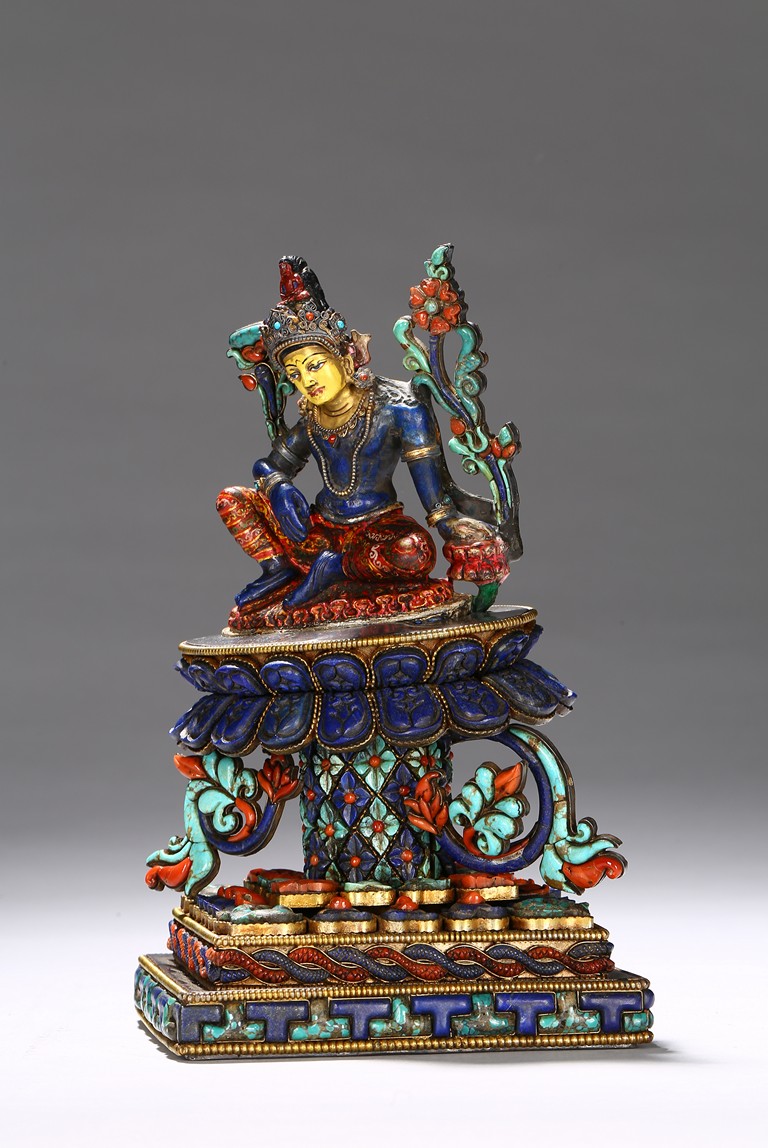 The lapis lazuli stone carved to depict bodhisattva seated with right knee raised, his face gilded and body adorned with beaded necklace, supported on elaborate double gourd lotus stand, and further tiered plinth, all inlaid with numerous turquoise, coral, and other semi-precious gems. 17th century.