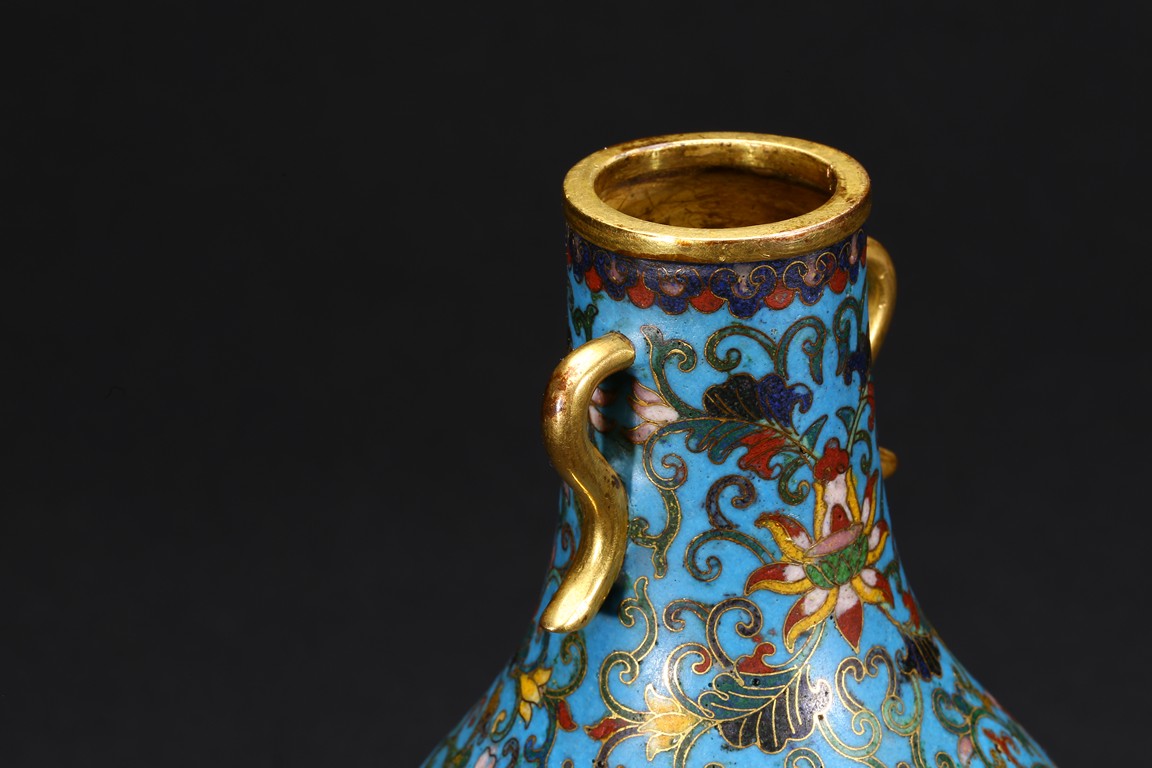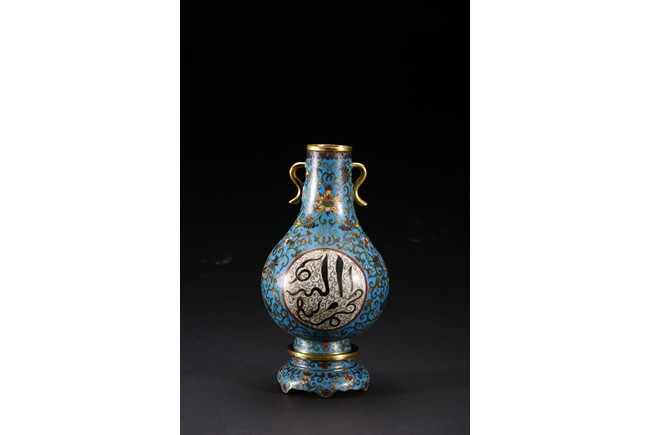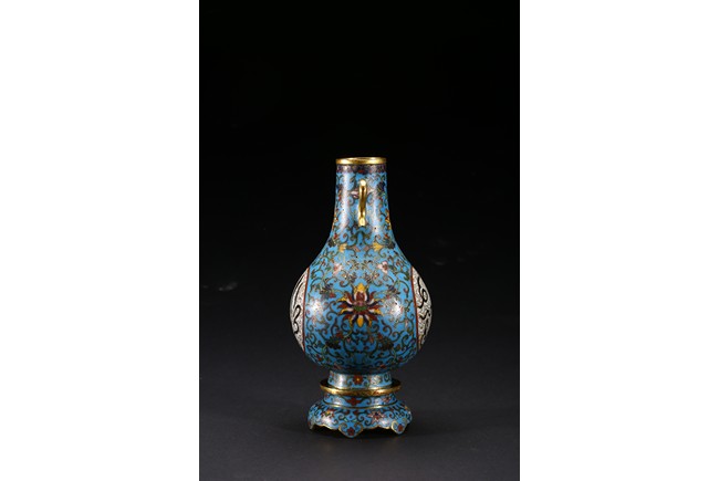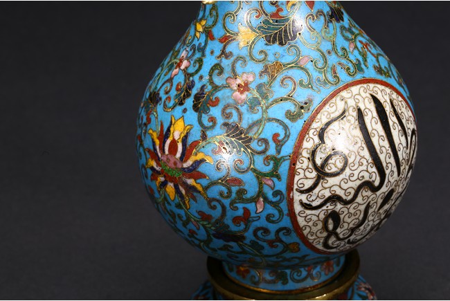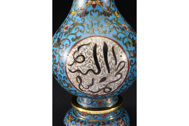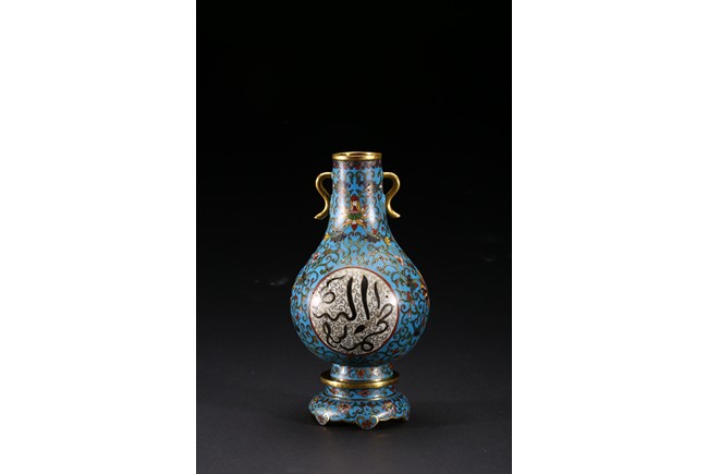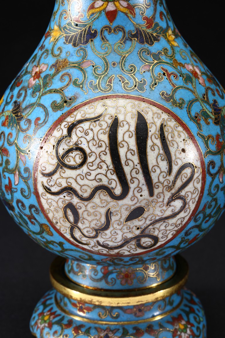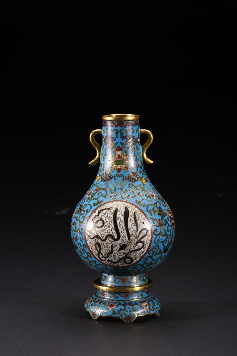 With an ovoid body rising to straight neck, supported on slightly spreading foot, the body decorated with two opposing roundels bearing Arabic inscriptions against scrolled ground, the neck and body enamelled with meandering lotus scrolls flanked by pair of gilt-bronze ruyi-loop handles, base with six character Qianlong mark. Qing Dynasty period.