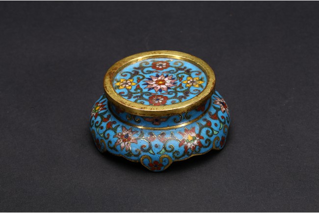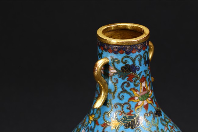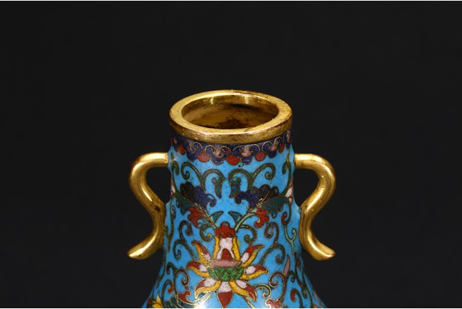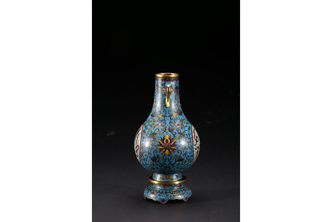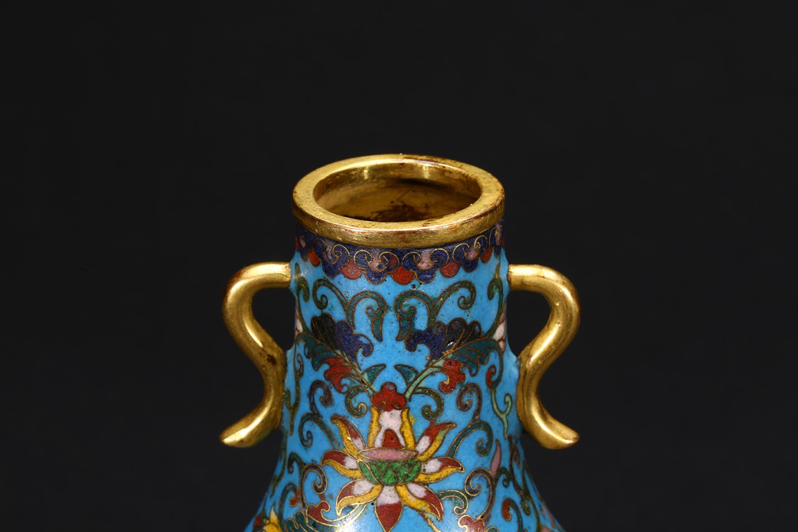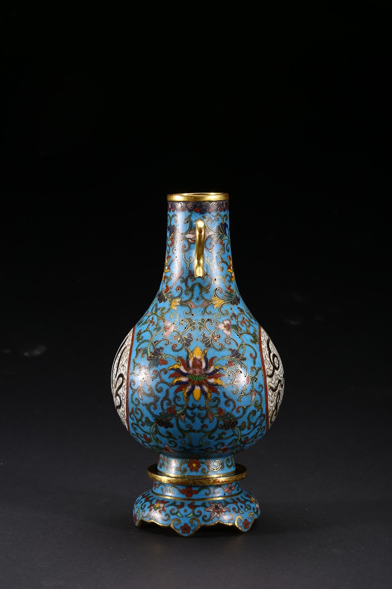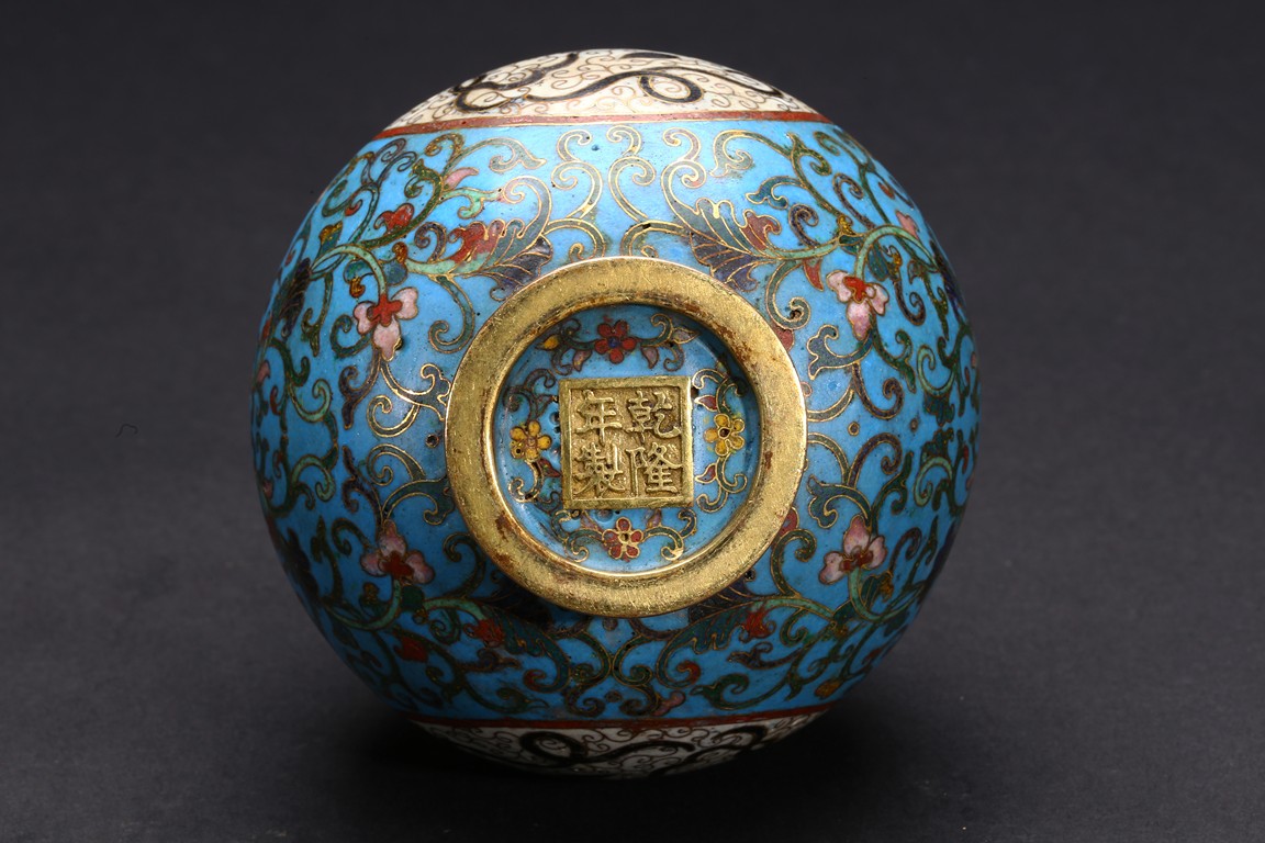 With an ovoid body rising to straight neck, supported on slightly spreading foot, the body decorated with two opposing roundels bearing Arabic inscriptions against scrolled ground, the neck and body enamelled with meandering lotus scrolls flanked by pair of gilt-bronze ruyi-loop handles, base with six character Qianlong mark. Qing Dynasty period.
