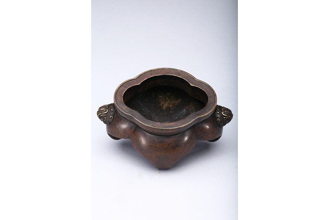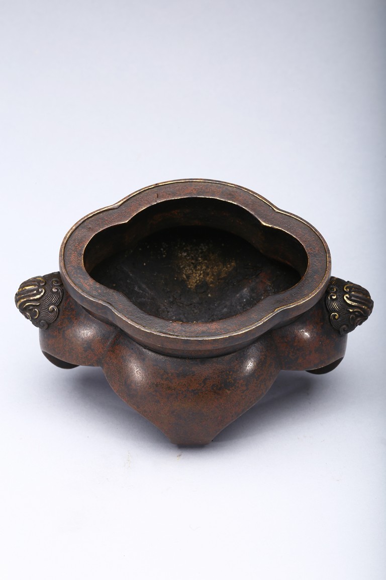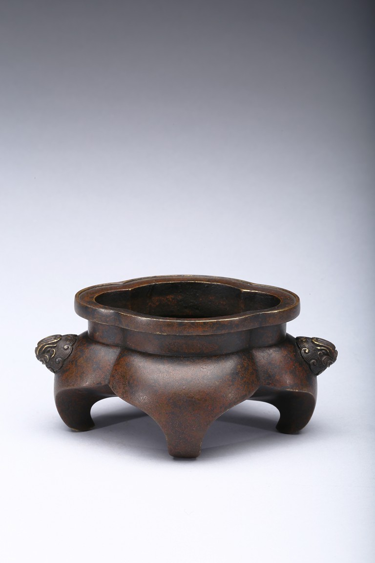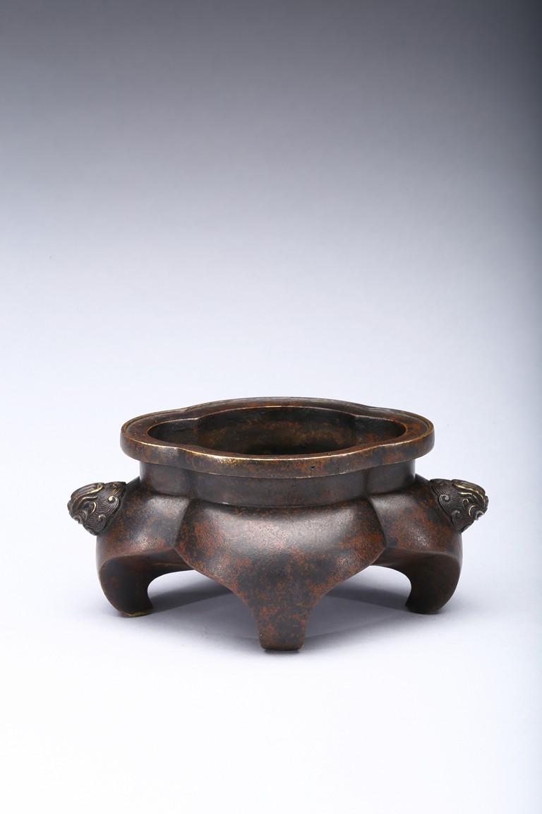 The vessel is supported on four curved feet and is cast with stylised mask handles, with traces of gilt on the feet and base. Early Qing Dynasty period.