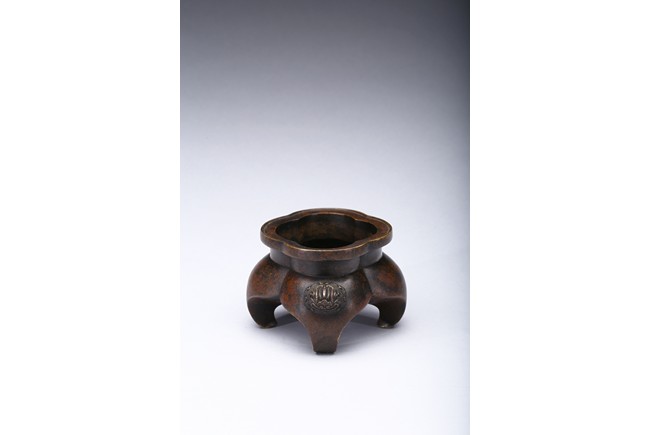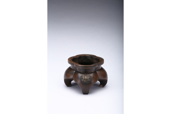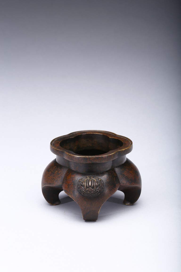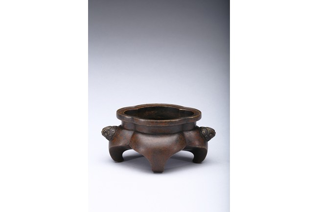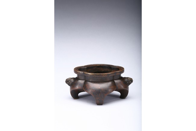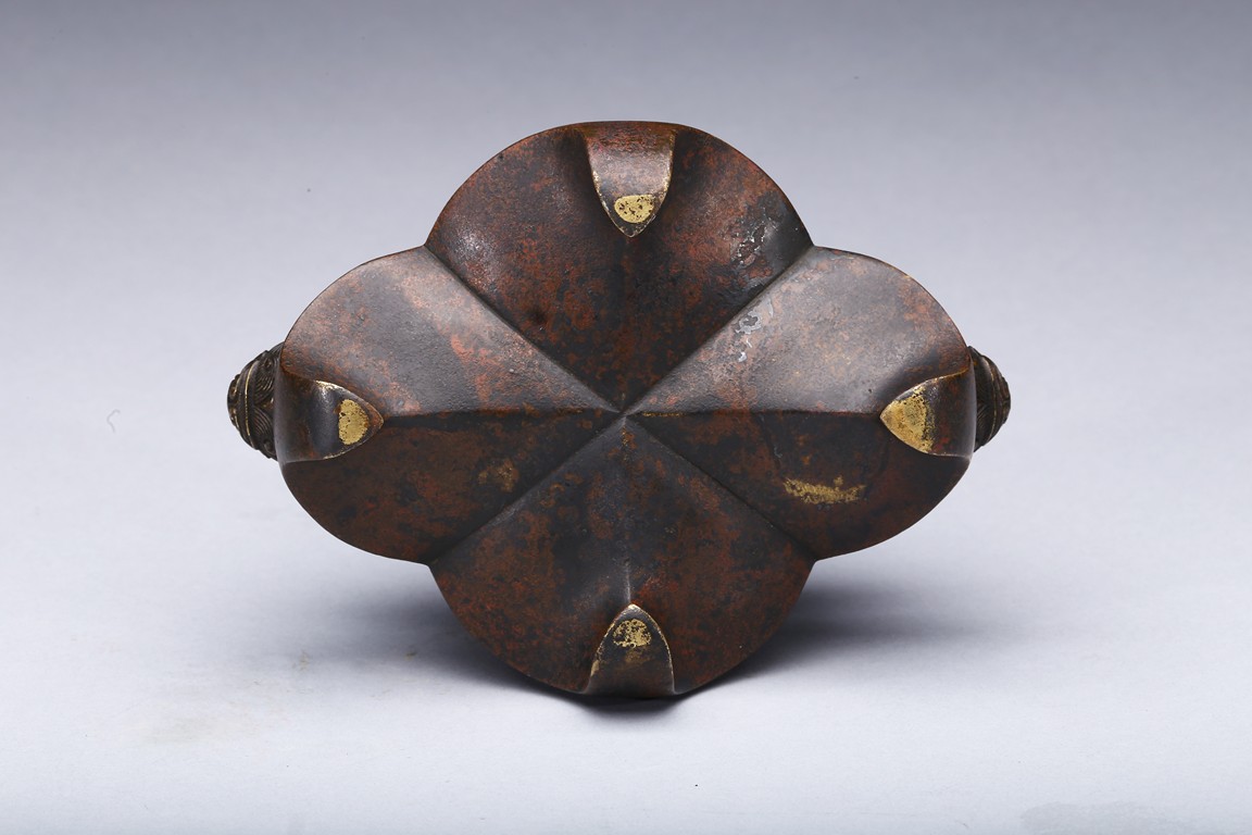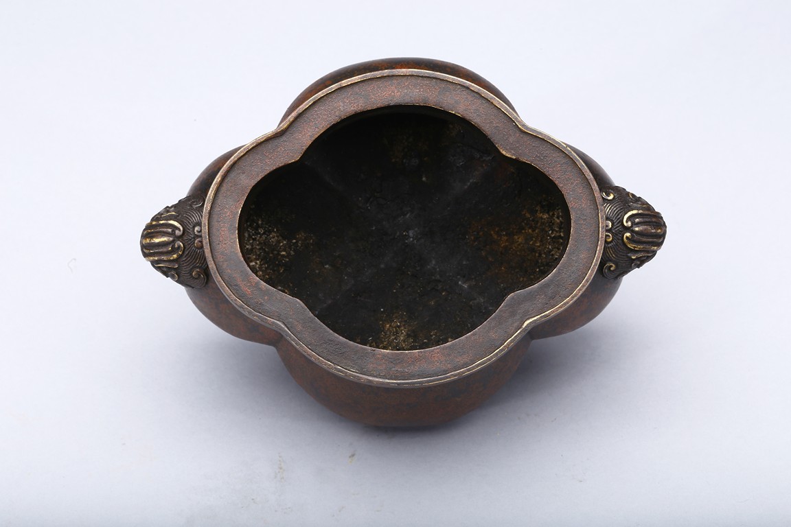 The vessel is supported on four curved feet and is cast with stylised mask handles, with traces of gilt on the feet and base. Early Qing Dynasty period.