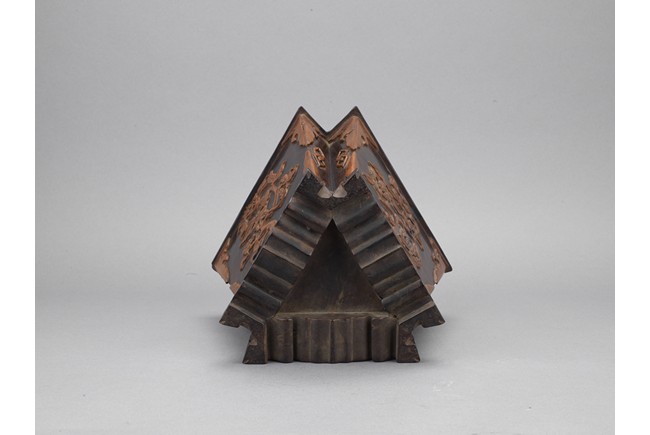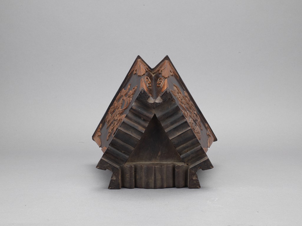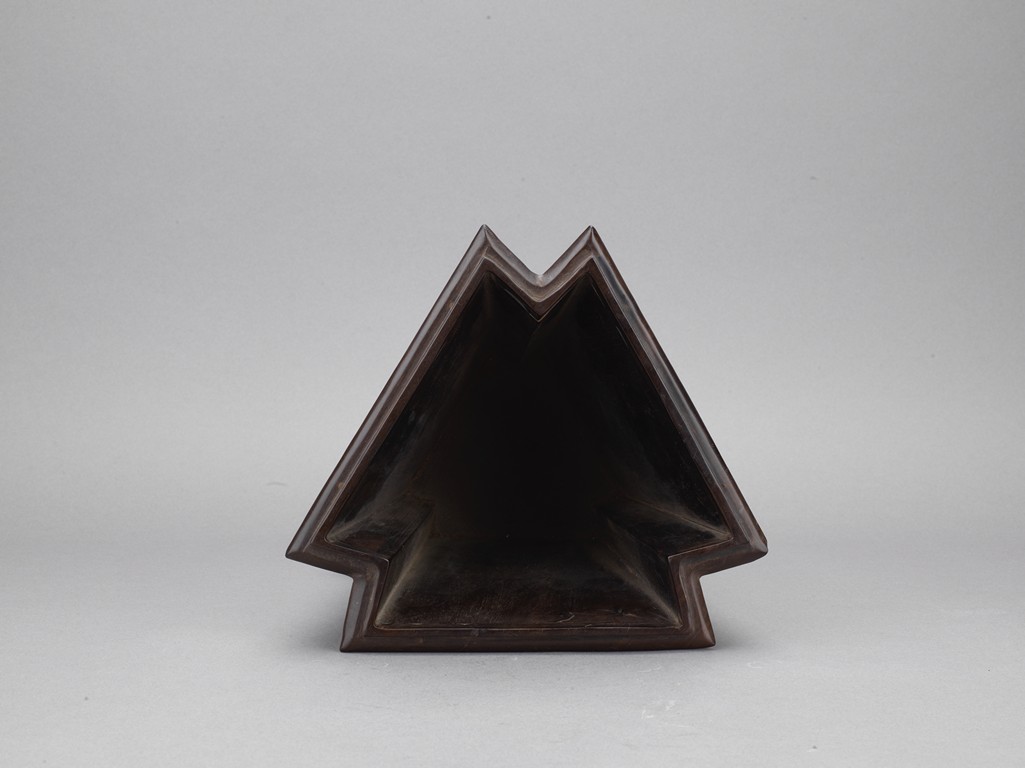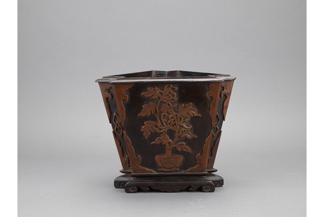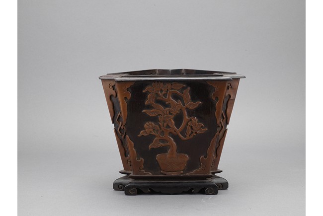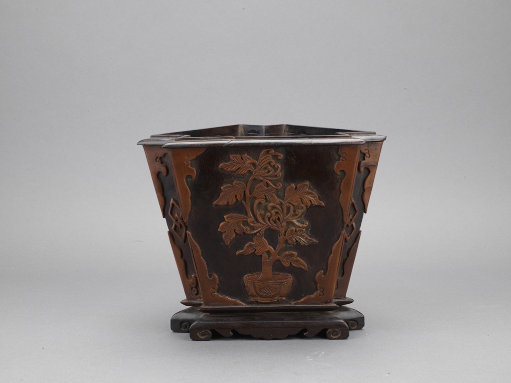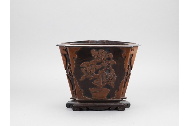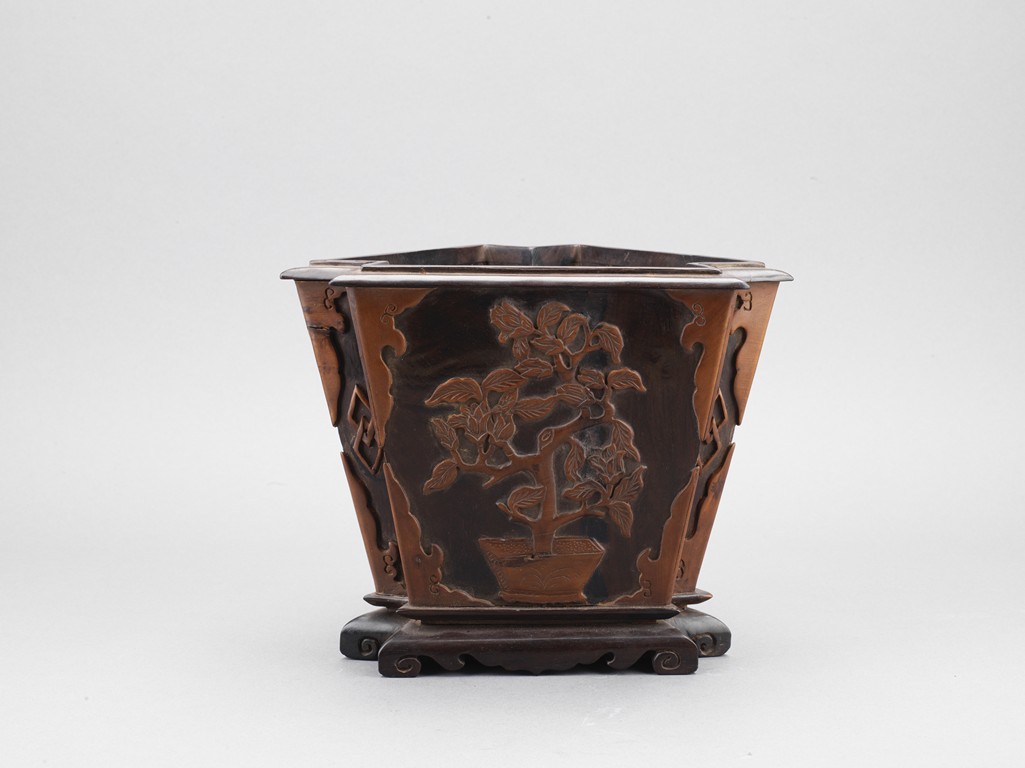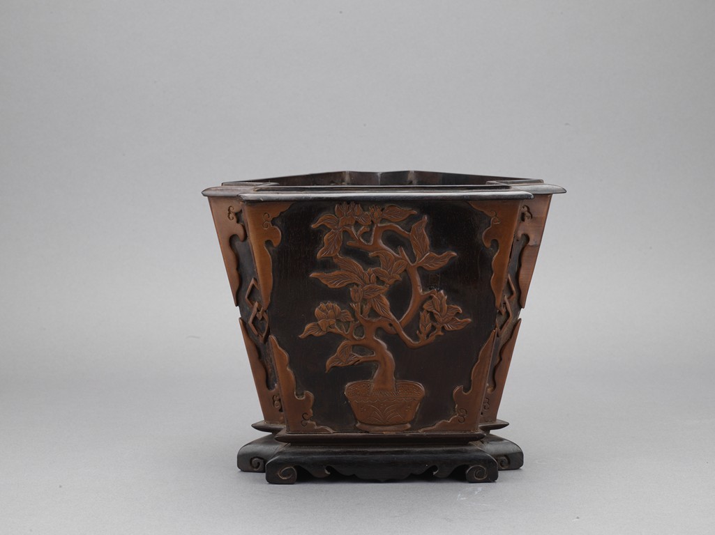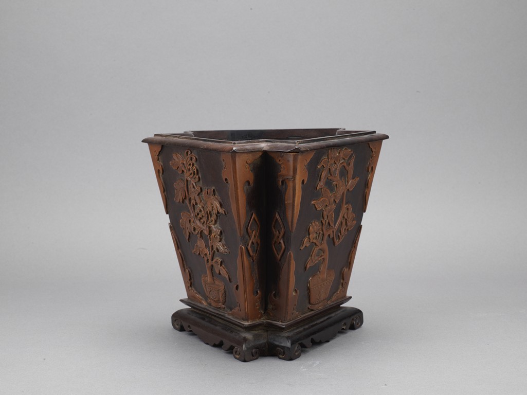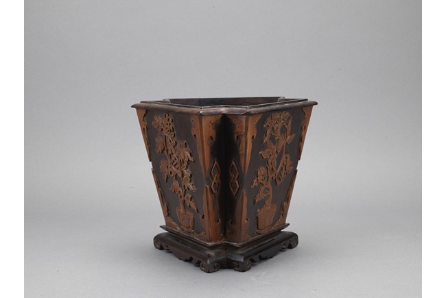 The three sided brushpot well hollowed, with each side inlaid in huangyangmu in shallow relief with flower decoration. Qing Dynasty period.