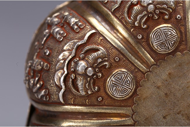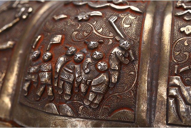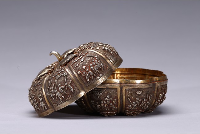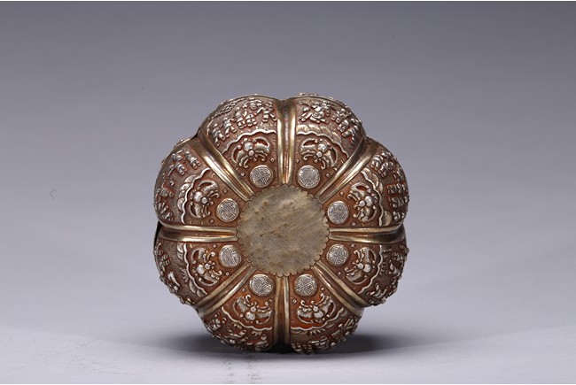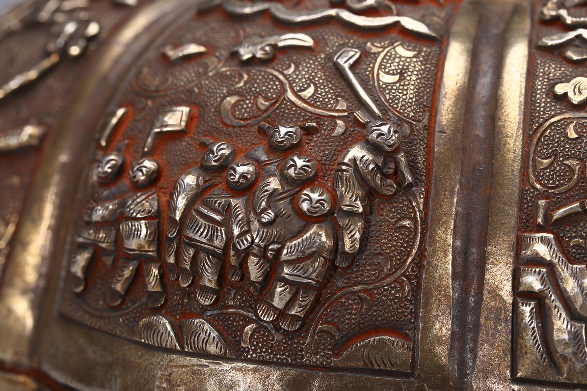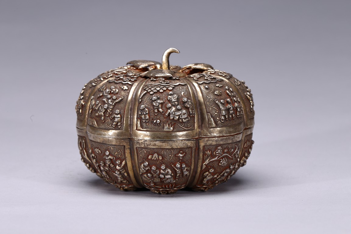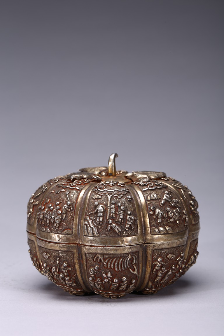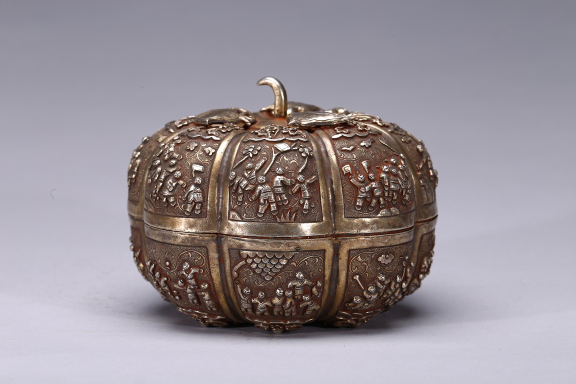 Modelled in the form of pumpkin with eight lobes, the exterior moulded in repousse in each section depicting boys engaging in various leisurely activities above a bat above shou medallion, the cover top modelled with leaves and stem as finial. Qing Dynasty period.