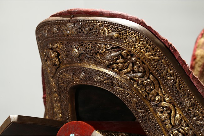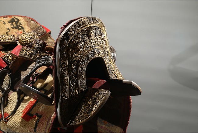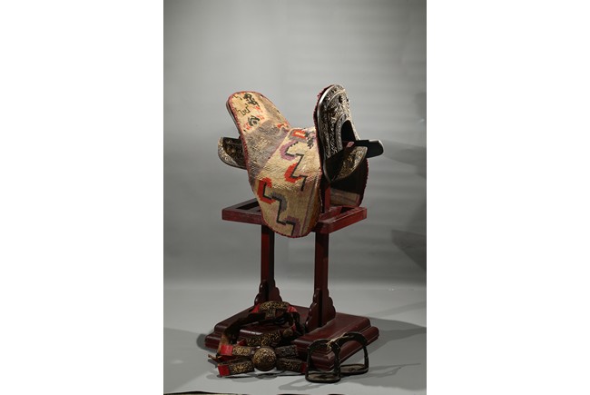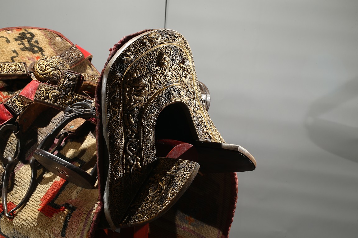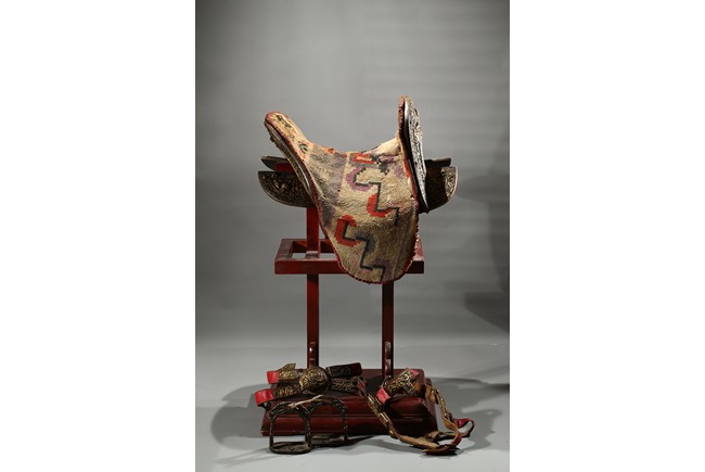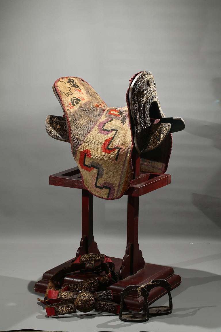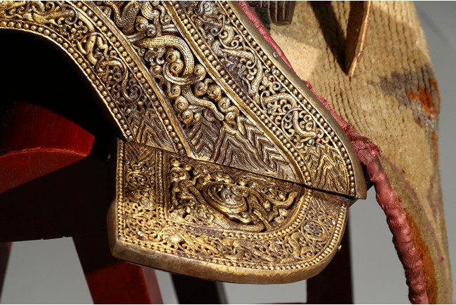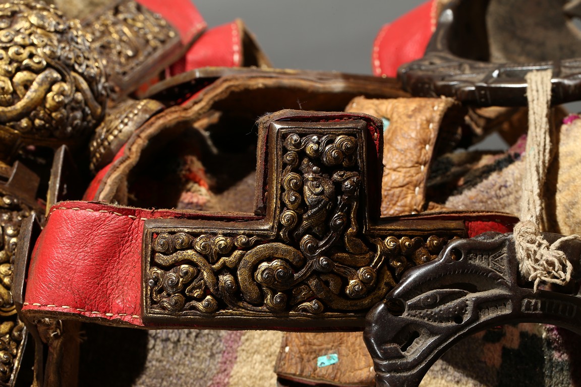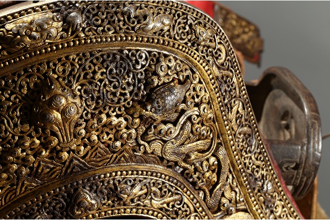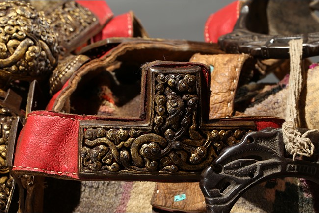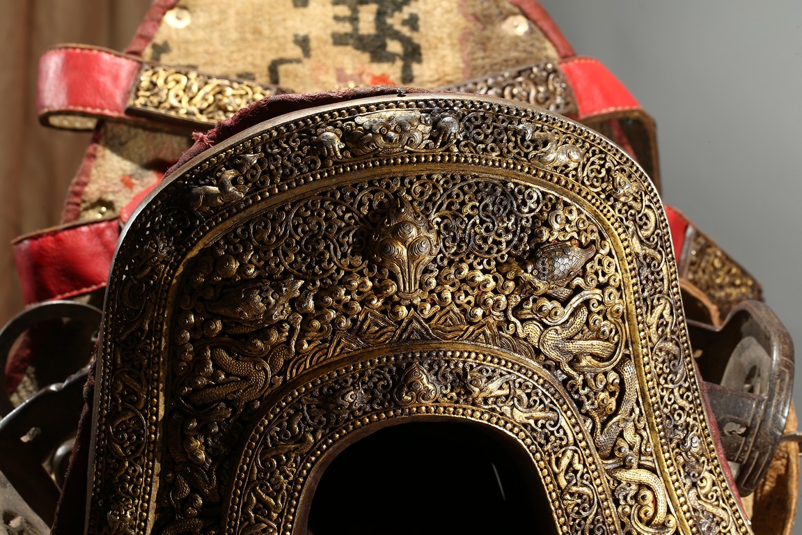 Tibetan. The horse saddle is covered on top with cloth, the front depicts mythical birds, beasts, and dragons surrounding beast mask amidst vine and ocean wave patterns in gilt silver, the back depicts two flying dragons and two mythical beasts confronting a sacred flaming flower amidst similar patterns, accompanied with straps and two buckles. Qing Dynasty period.