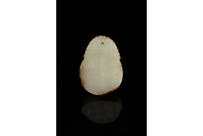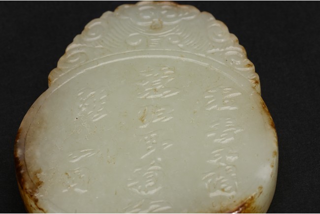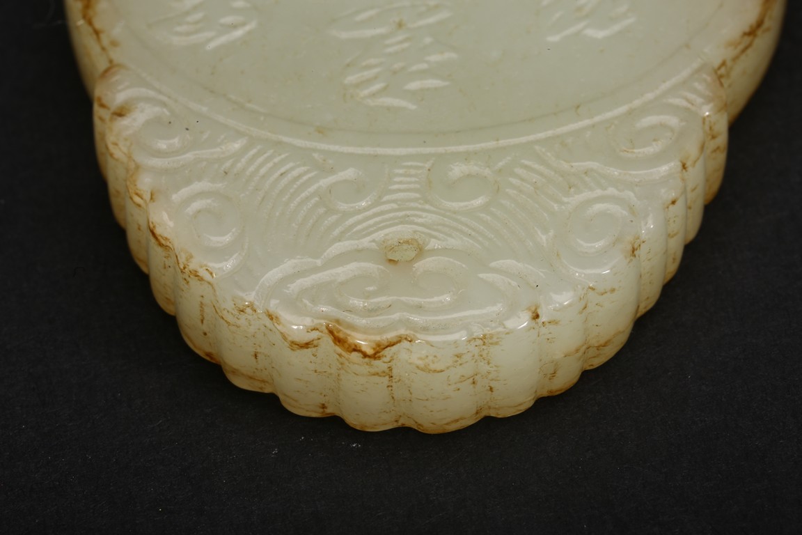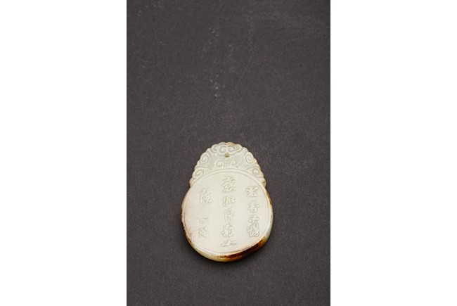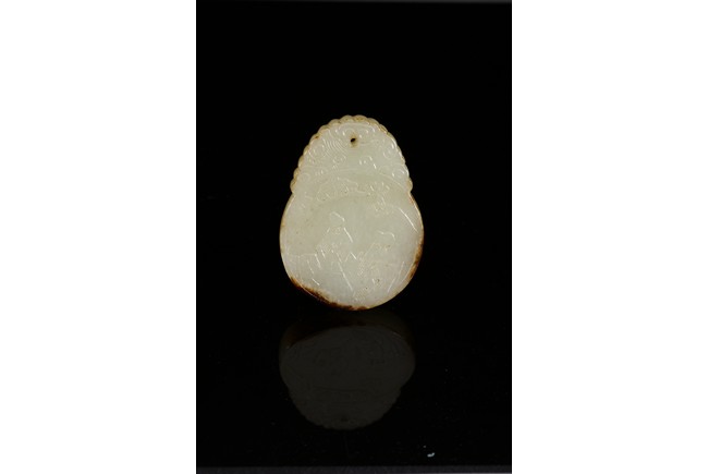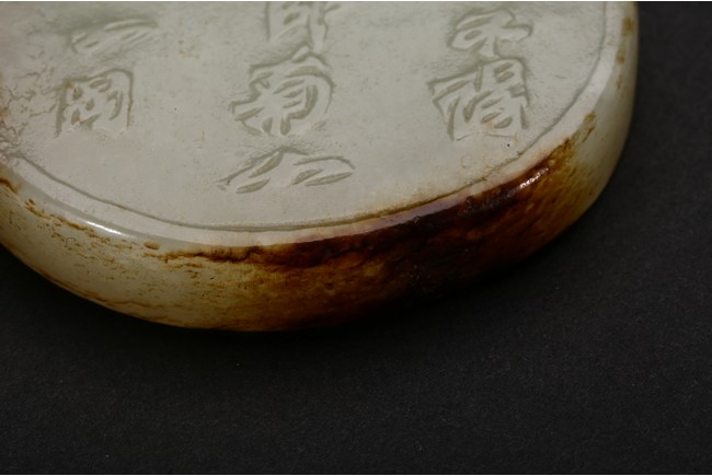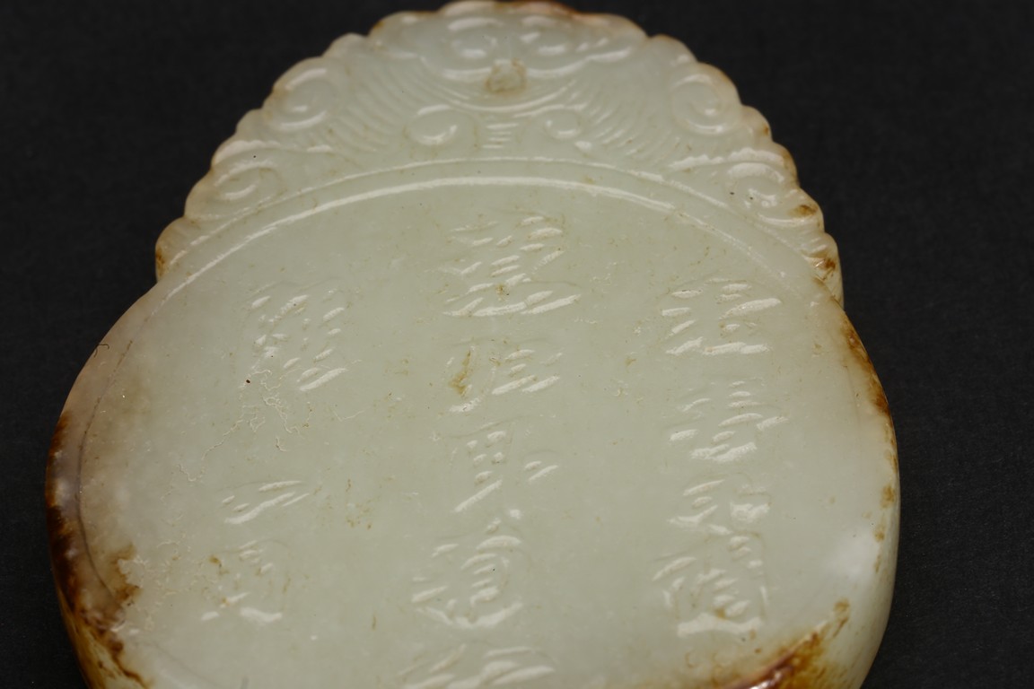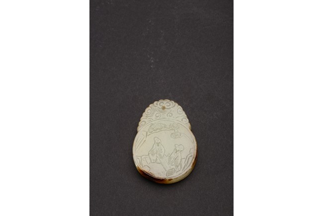 Of flattened circular form, carved in low relief to one side depicting two scholars sitting under pine tree, the reverse with inscription. Qing Dynasty period.