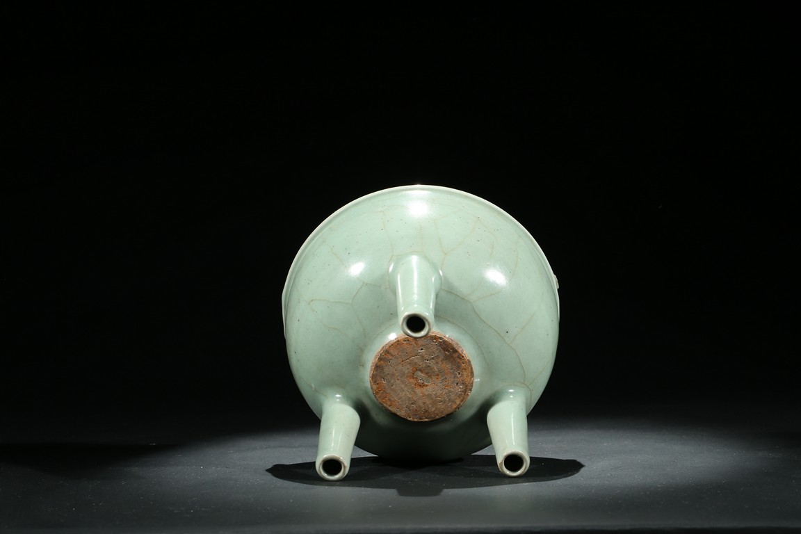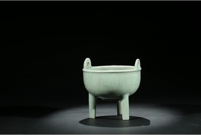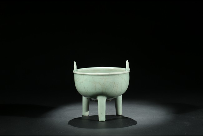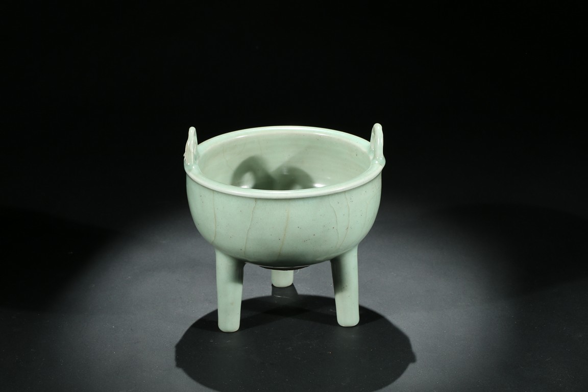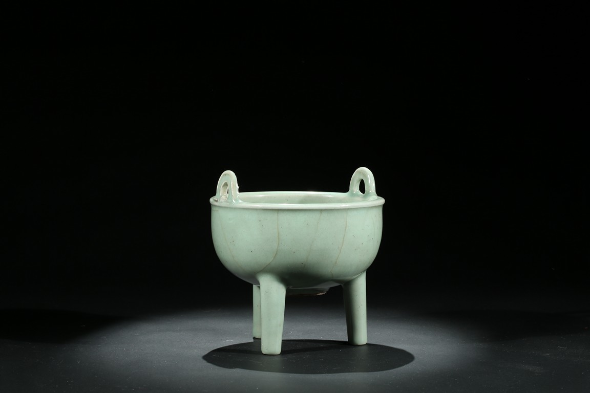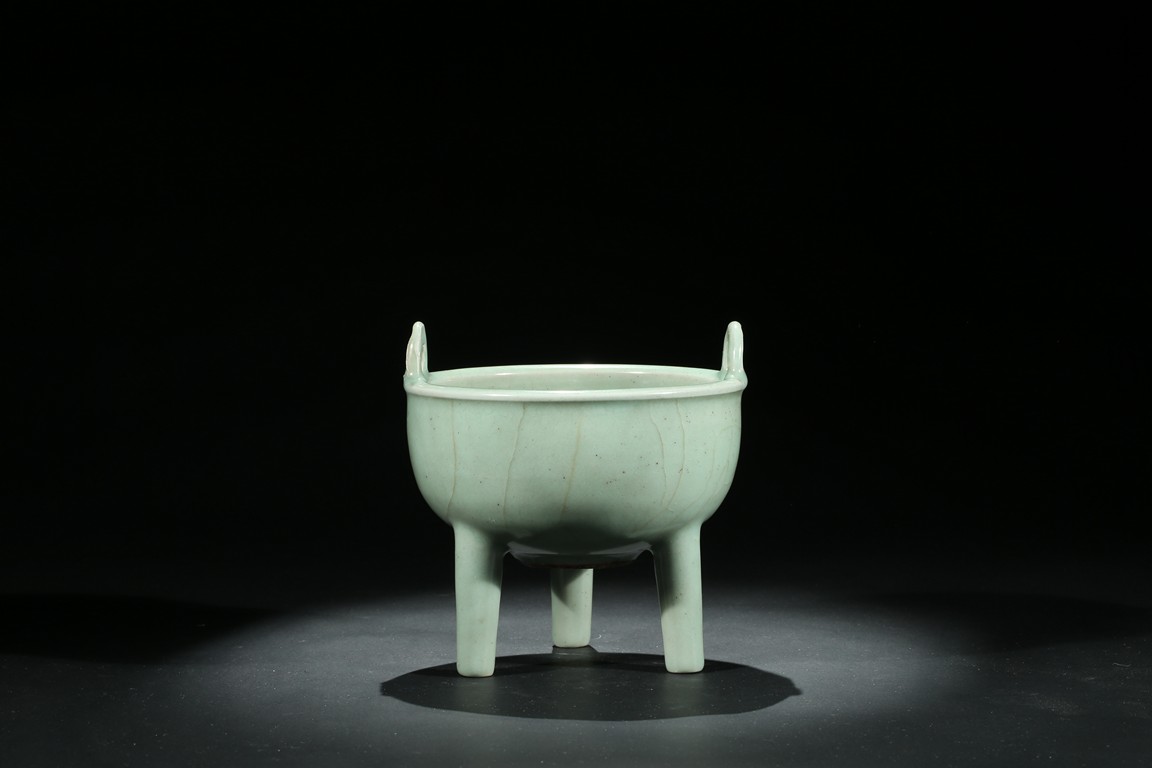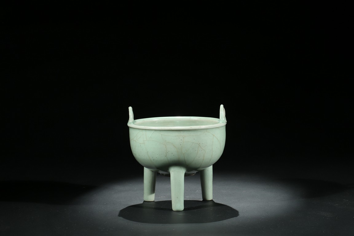 此件爐爐方唇口,口部有扁圓形雙立耳,下部有蔥管狀足。胎體較厚,通體均施天青色釉,色澤較深,器外有葉脈狀不規則碎紋開片。釉面開片是因為釉與胎的收縮率不一致,冷卻時形成一種釉裂胎不裂的現象,古代工匠巧妙地利用錯落有致的開片,順其自然,形成一種妙趣天成的裝飾釉。錯落的葉脈狀不規則碎紋開片使單一色釉增添了裝飾層次和起伏變化,更具韻律感。此器造型莊重,趣味高雅,輕於紋飾,追求的是單純的質料美和純淨的釉色美,色調淡雅含蓄,清逸脫俗。