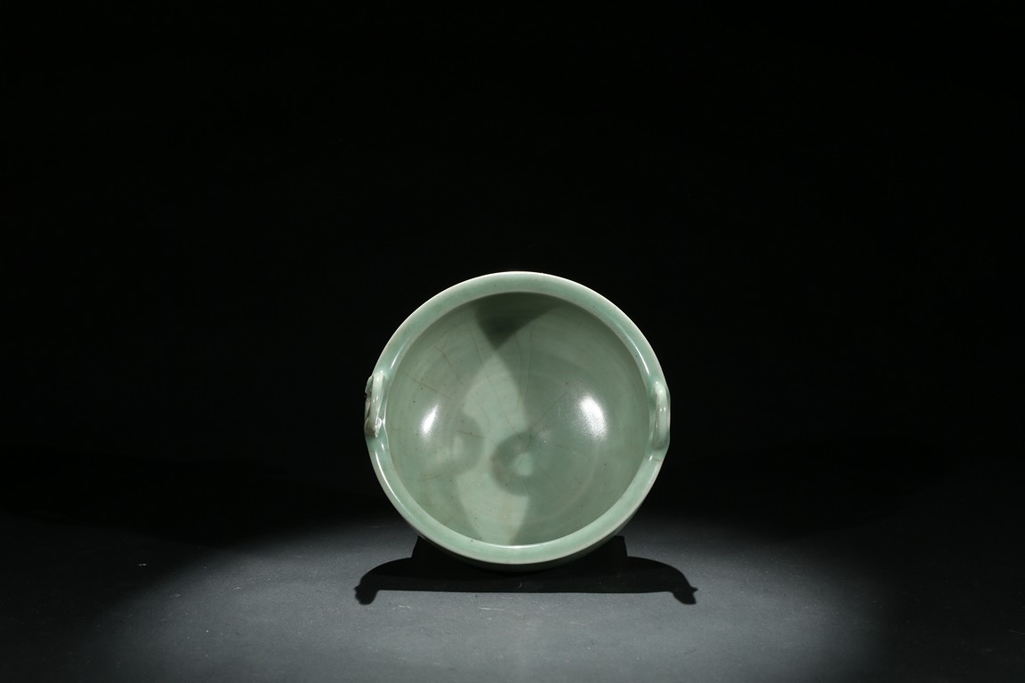 Of globular form, flanked by two loop handles supported on three conical feet, covered overall with in celadon glaze with russet crackle patterns. Ming Dynasty period.