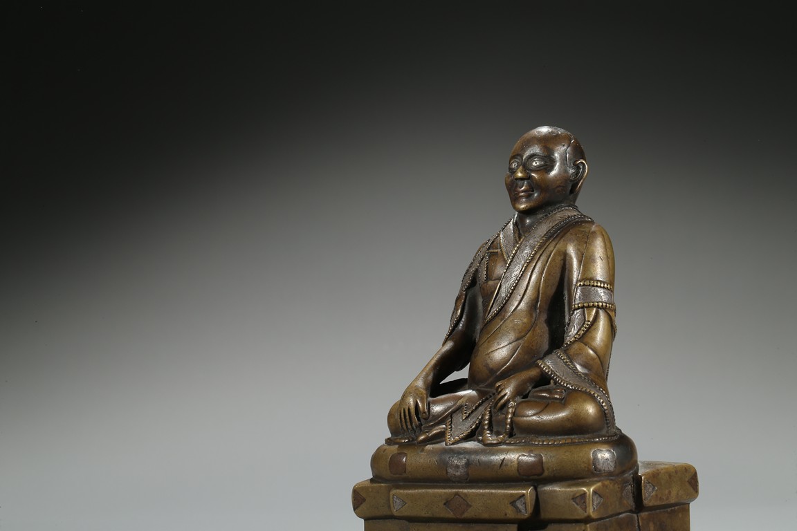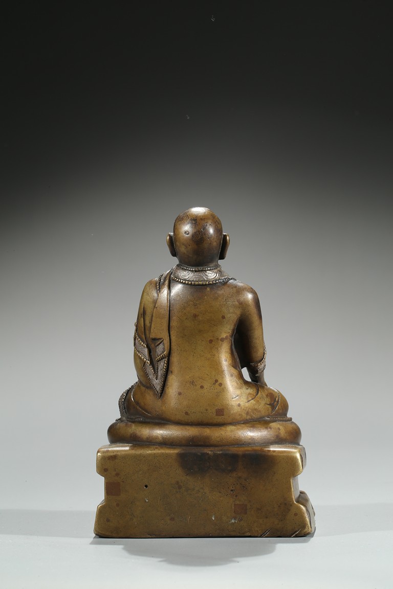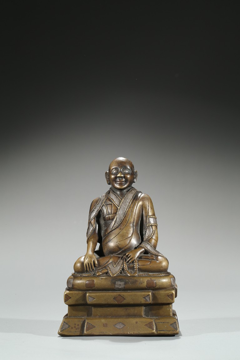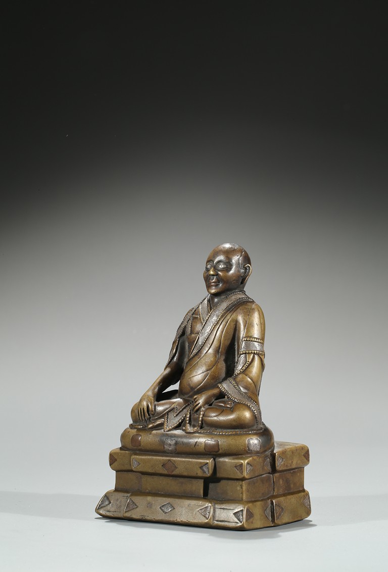 Seated in Dhyanasana with right hand in bhumisparsha mutra, wearing voluminous monastic robe, facial features well defined beneath the bare head, eyes inlaid in silver, all supported cushions inlaid with bronze and silver. 16th century.