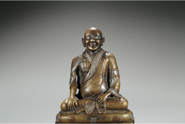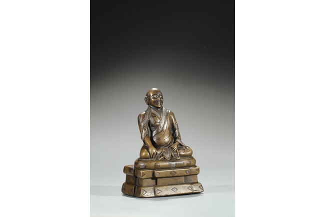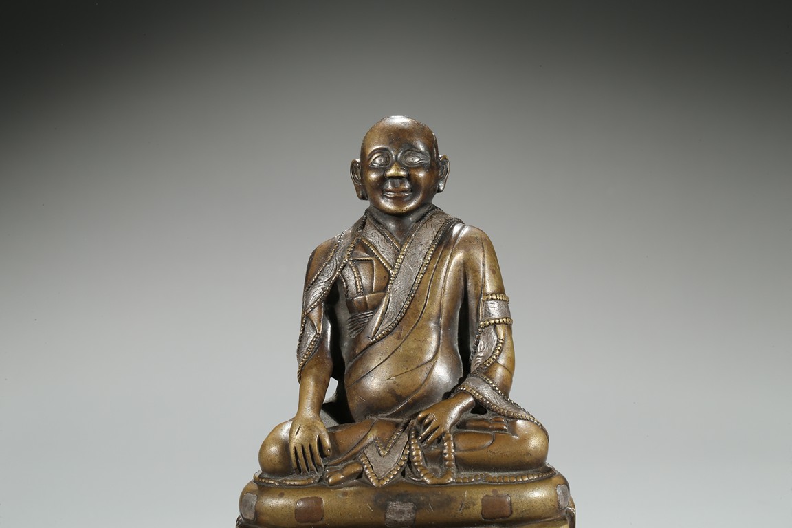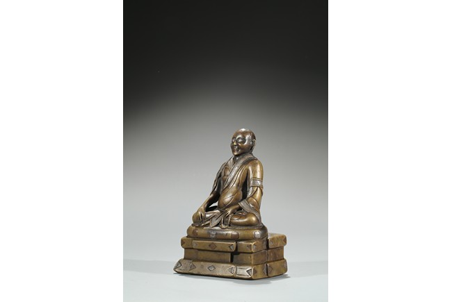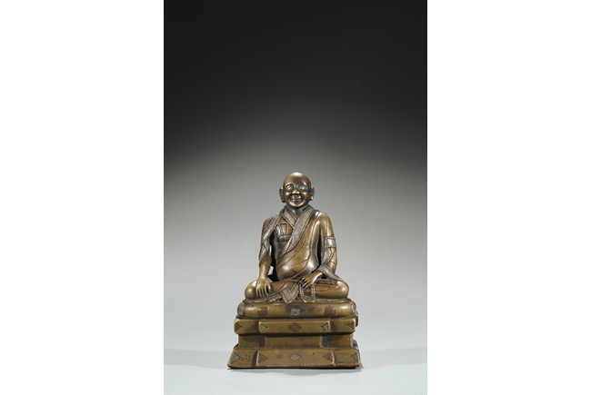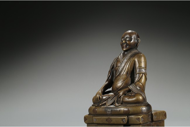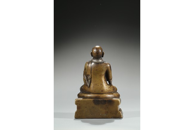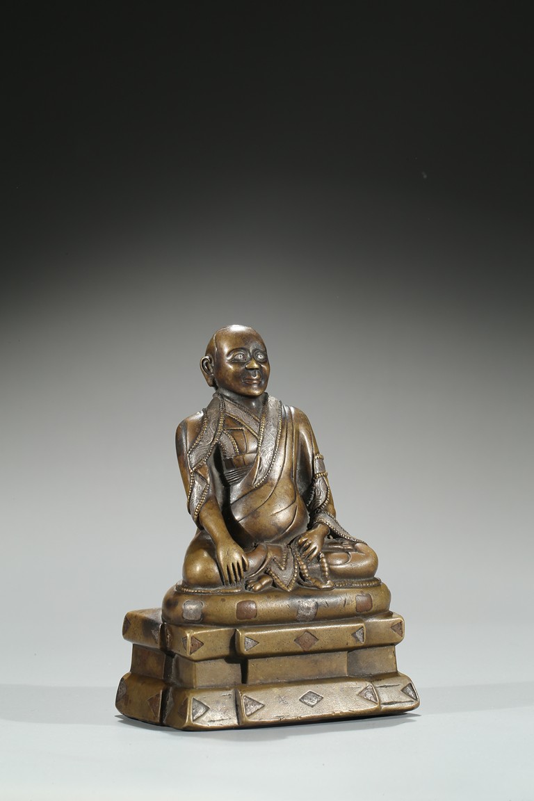 Seated in Dhyanasana with right hand in bhumisparsha mutra, wearing voluminous monastic robe, facial features well defined beneath the bare head, eyes inlaid in silver, all supported cushions inlaid with bronze and silver. 16th century.