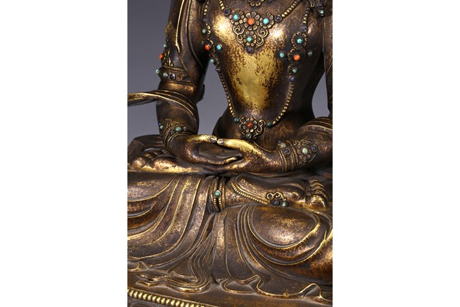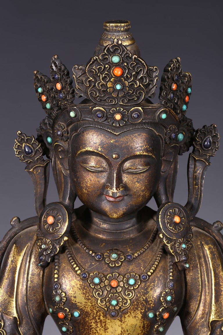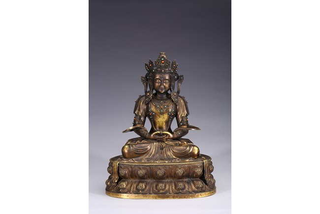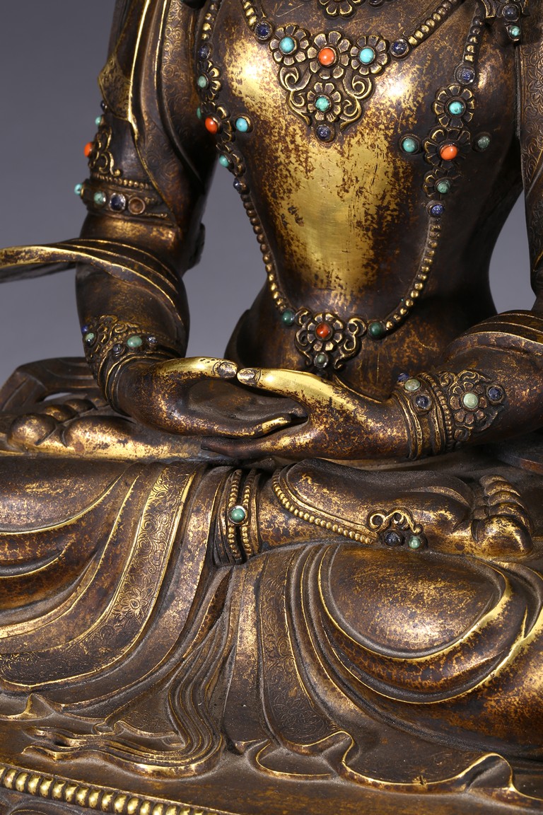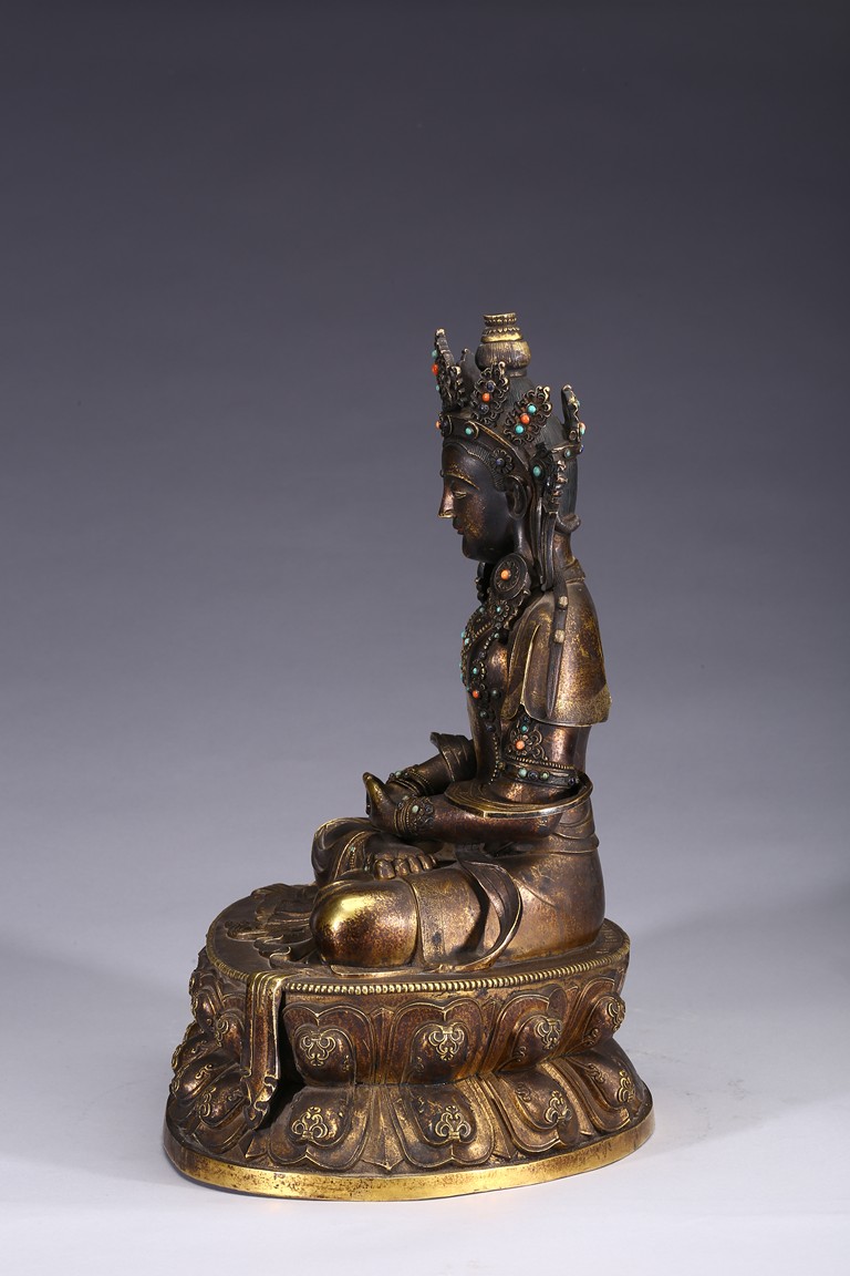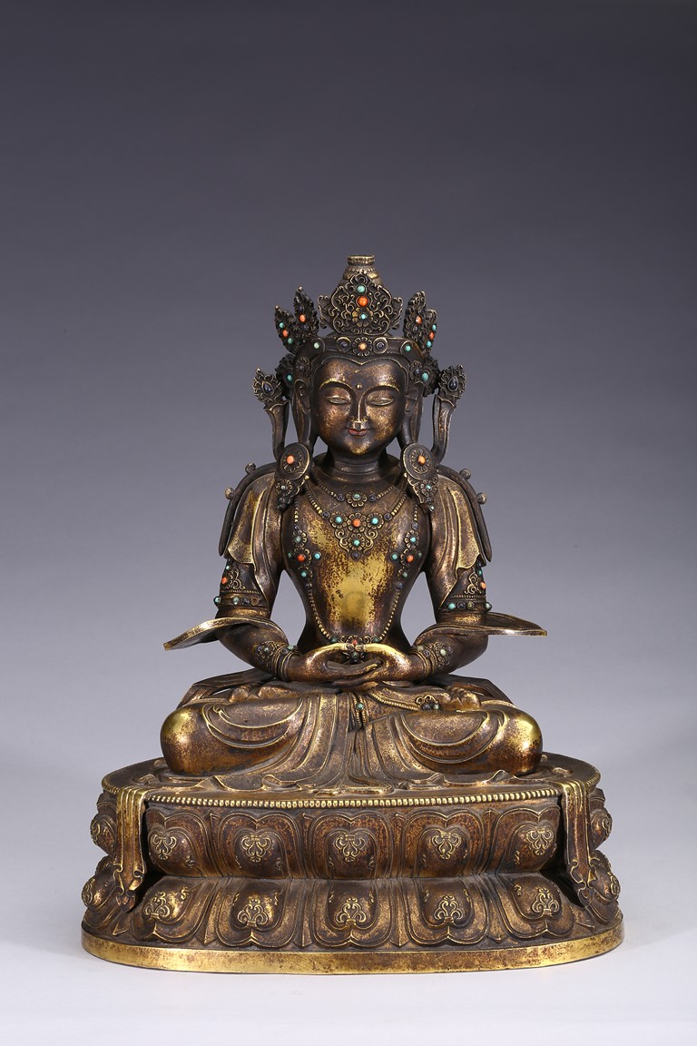 這尊銅像應是康熙時期宮中所造無量壽佛之一。面相慈和,施禪定印,全跏趺坐於蓮台上。戴枝葉繁密的寶冠,綴圓形花瓣狀精緻寶冠,束髮繒帶在耳後飄起,托珠為飾,胸前飾三重項鍊,珠粒精圓勻稱,手鐲、臂釧、腳鐲均精工細作,堪稱完美。所有的花飾部分均嵌各色珠石,衣緣裙邊均有細密刻花裝飾,更彰顯其華麗。
