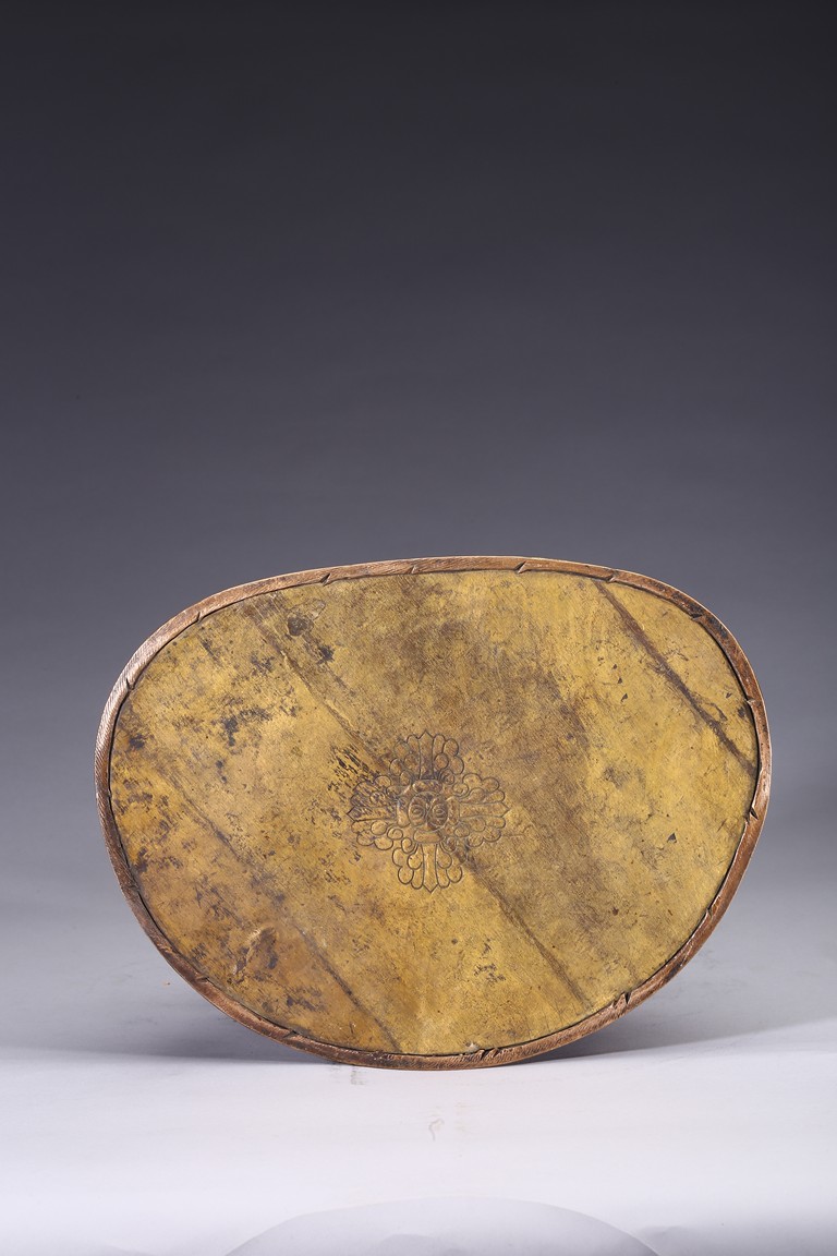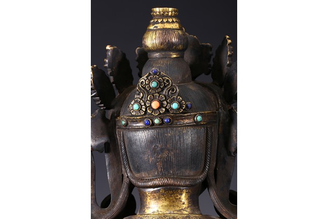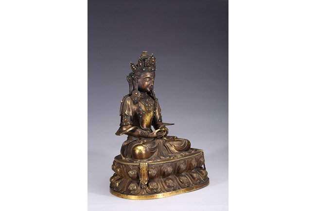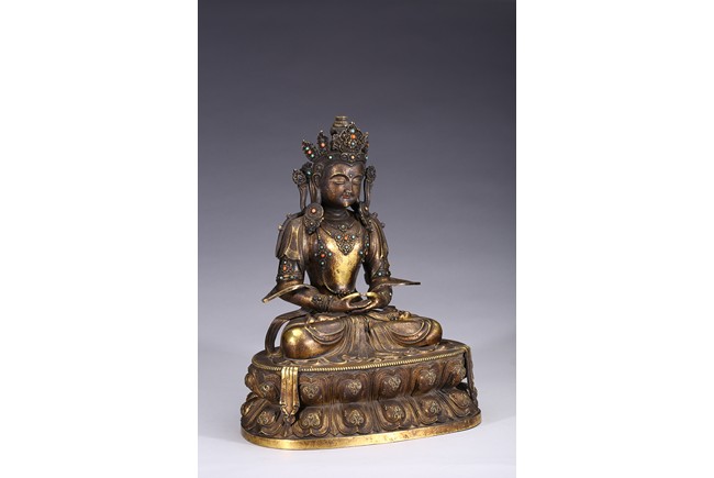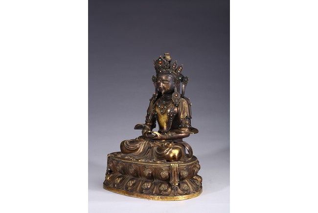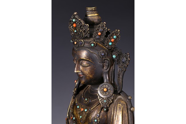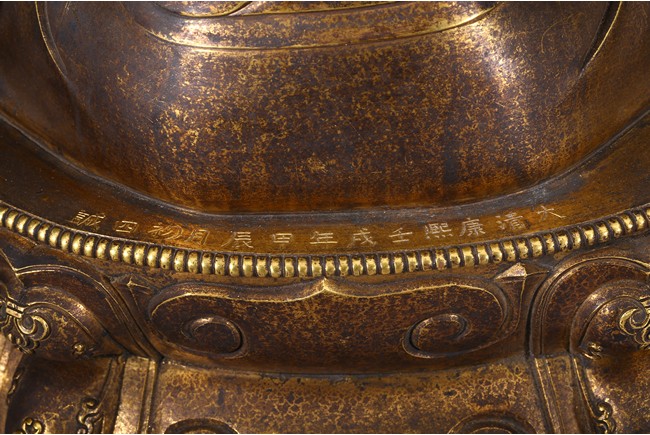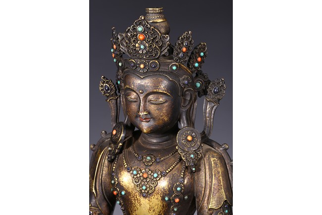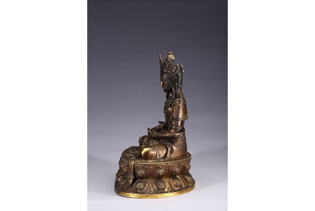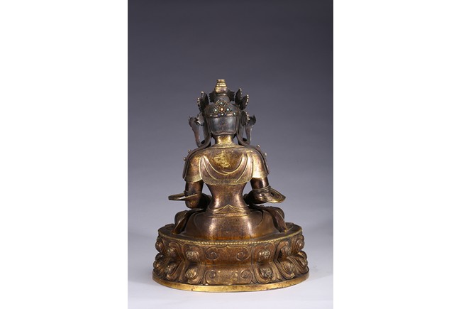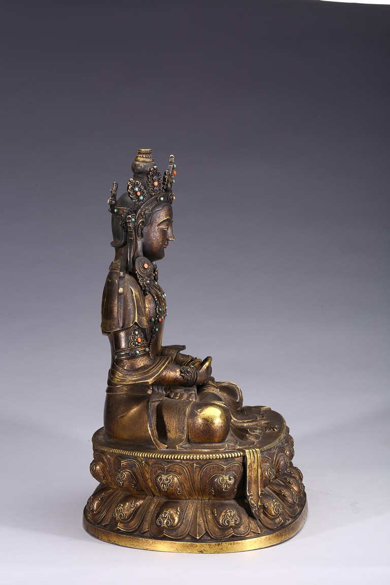 這尊銅像應是康熙時期宮中所造無量壽佛之一。面相慈和,施禪定印,全跏趺坐於蓮台上。戴枝葉繁密的寶冠,綴圓形花瓣狀精緻寶冠,束髮繒帶在耳後飄起,托珠為飾,胸前飾三重項鍊,珠粒精圓勻稱,手鐲、臂釧、腳鐲均精工細作,堪稱完美。所有的花飾部分均嵌各色珠石,衣緣裙邊均有細密刻花裝飾,更彰顯其華麗。