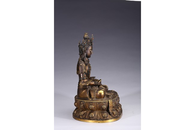 Cast seated in dhyanasana on a double lotus base, the hands folded in dhyana mudra, dressed in a dhoti and draped over by a shawl, embellished with beaded coral and turquoise beads, the face with meditative expression, the hair piled up into a high chignon under an elaborate headdress, the reverse inscribed with inscription dating to the year of 1682, possibly later inscribed. Qing Dynasty period.