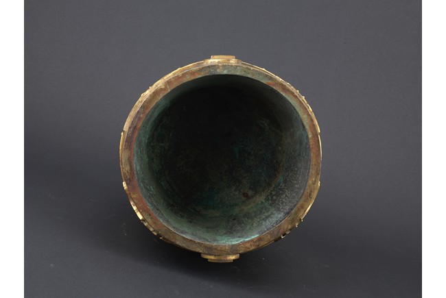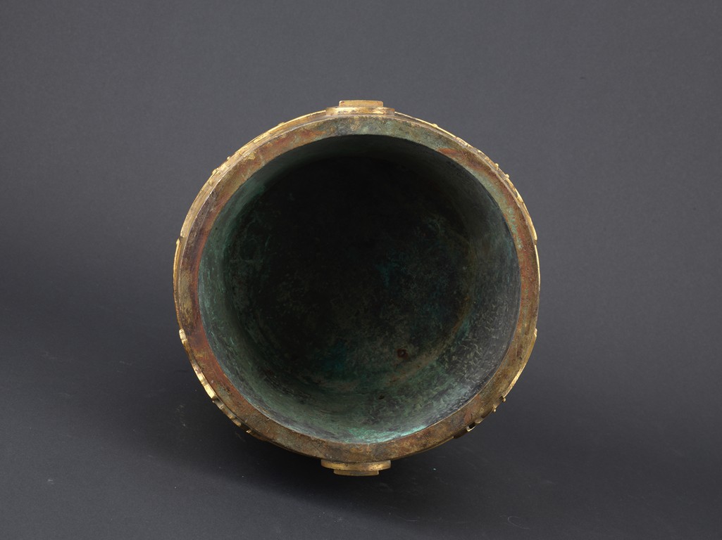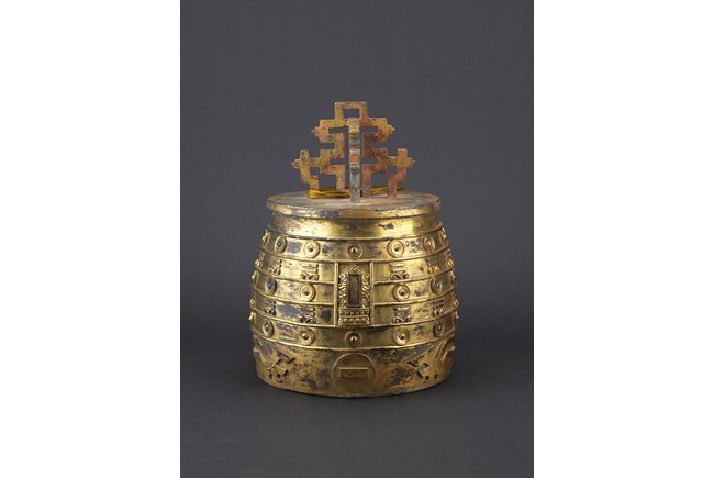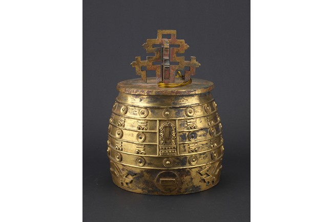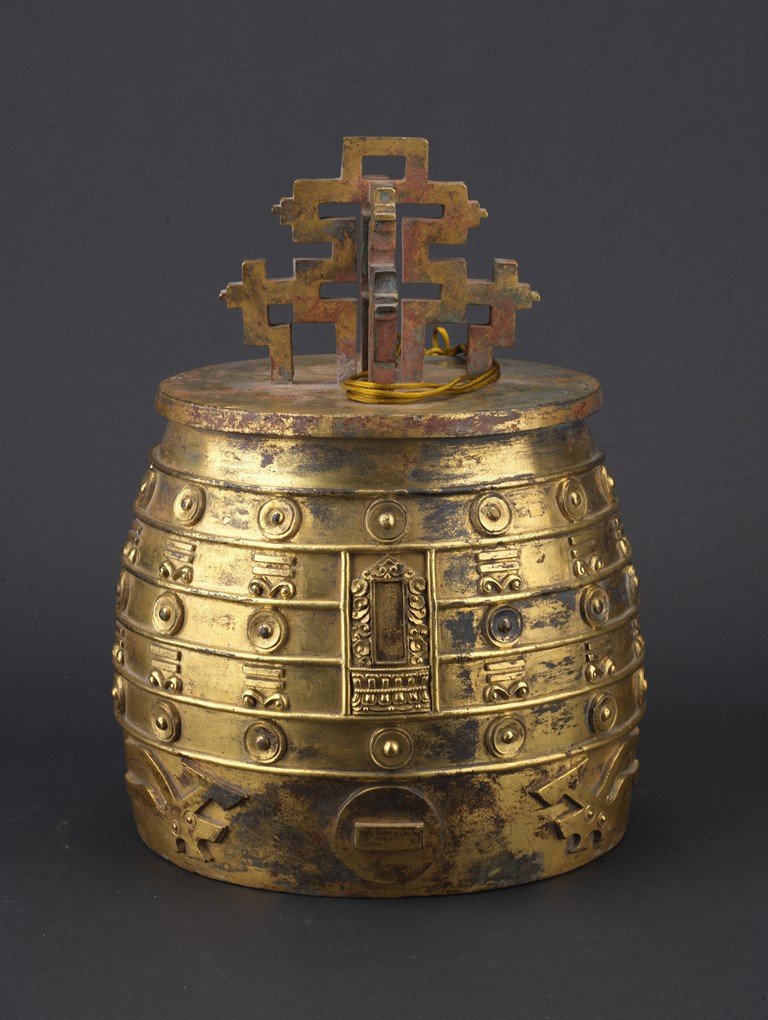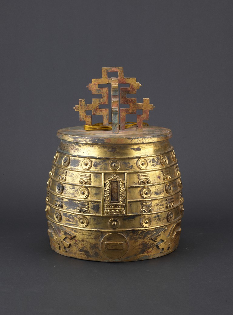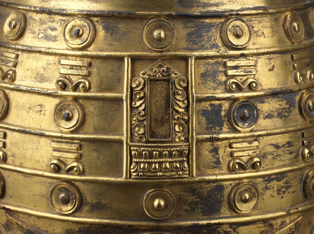此編鐘通體鎏金,以失蠟法鑄造,器形呈圓酒桶狀態,中空,腰腹稍寬,下口平齊。鐘身前後分鑄“八卦紋”一組,正面蓮瓣台座上施“大清乾隆十年制”。器身的八卦紋和款識俐落分明,構成一饒富幾何風格的圖飾。整體金光輝映,乃乾隆時期巔峰之作。