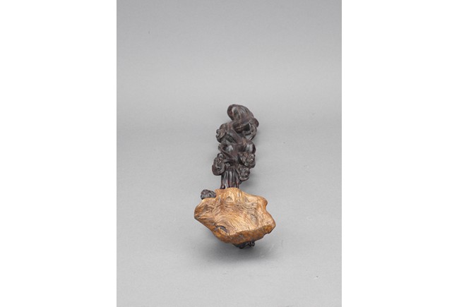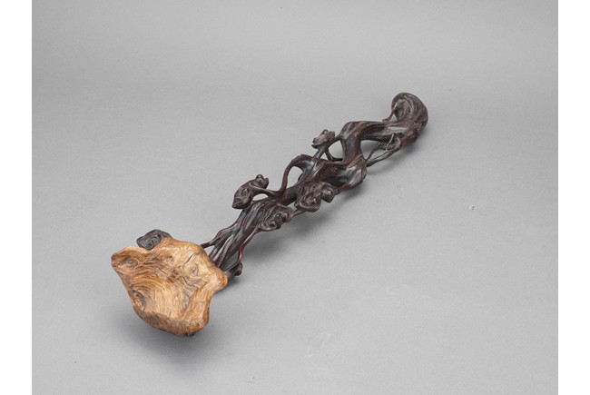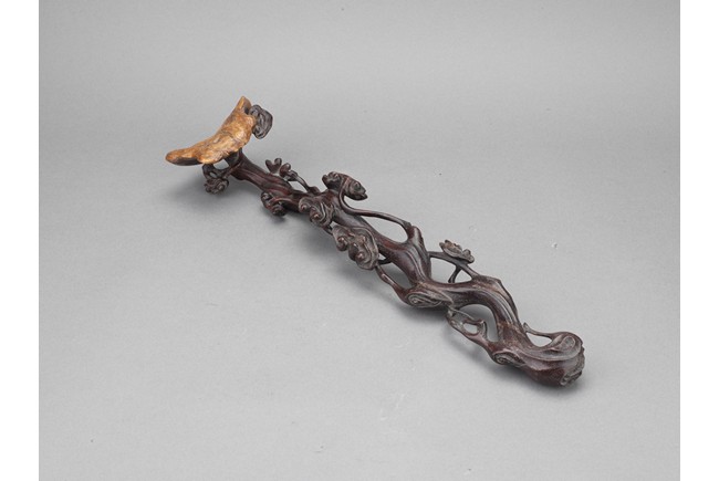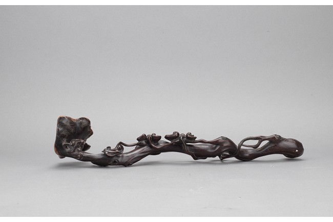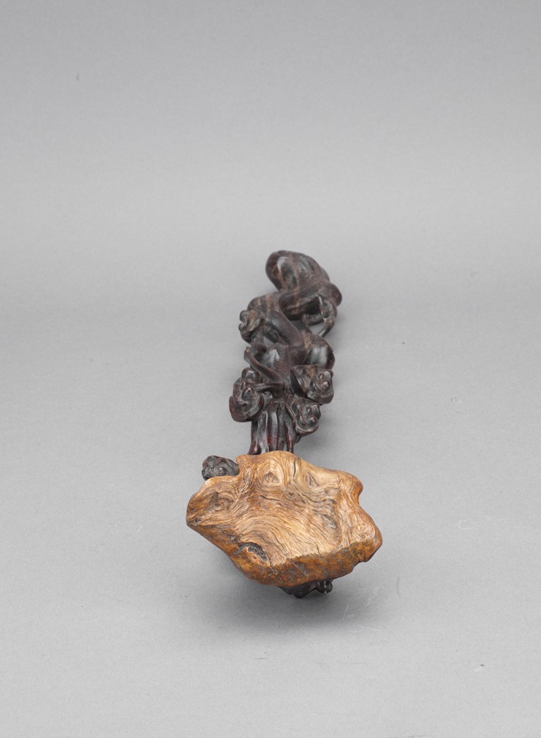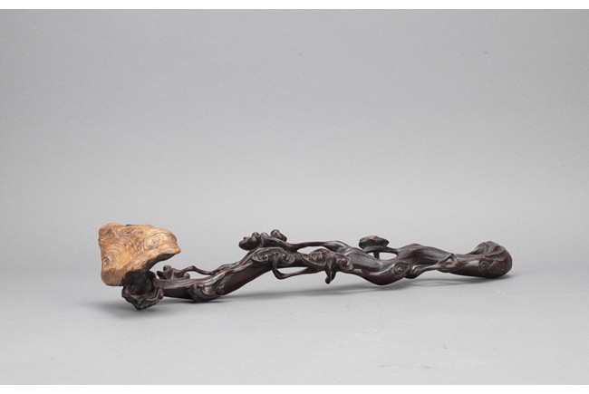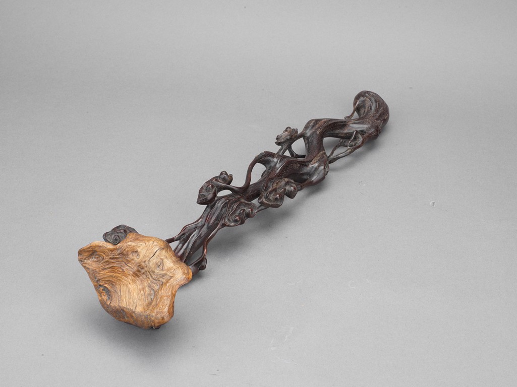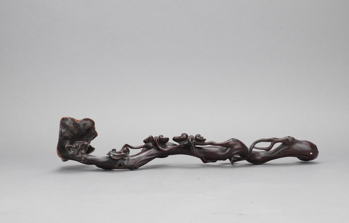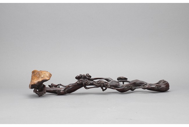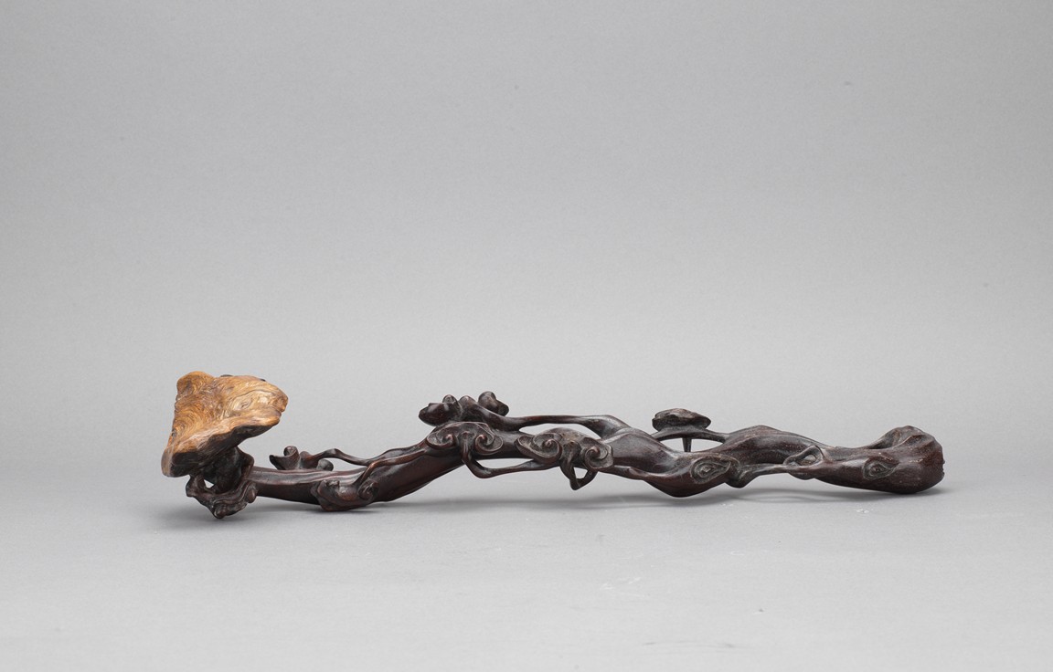 Naturalistically carved out of a zitan branch with smaller lingzhi branches in high relief to the scepter handle. Qing Dynasty period.