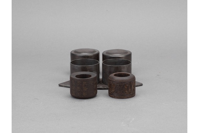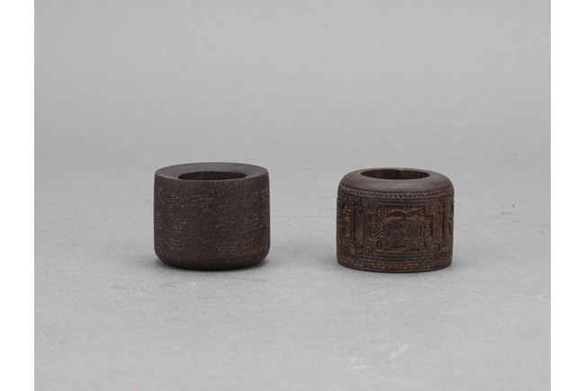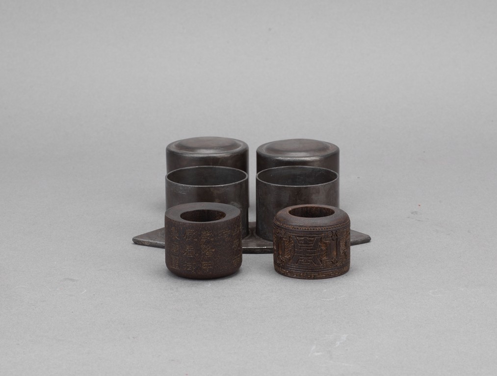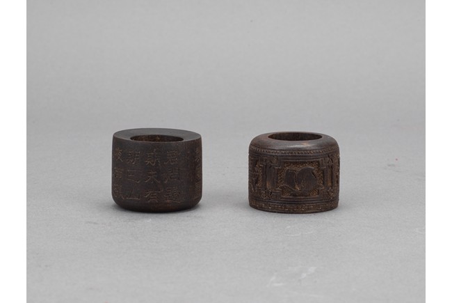 Each cylindrical archer's ring incised with poetic inscription, the wood is of characteristic aroma.