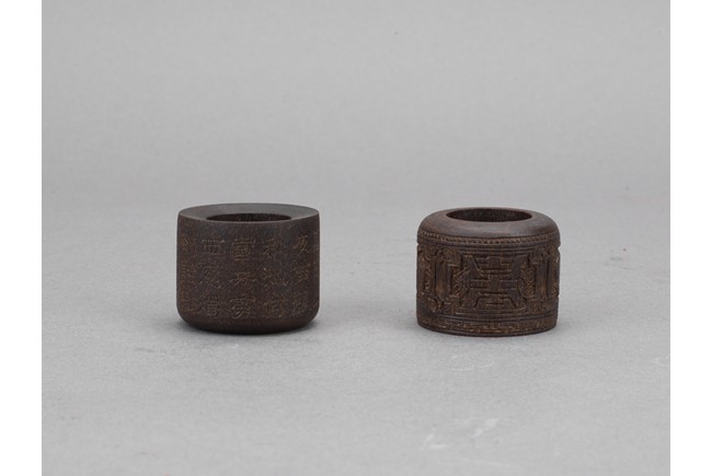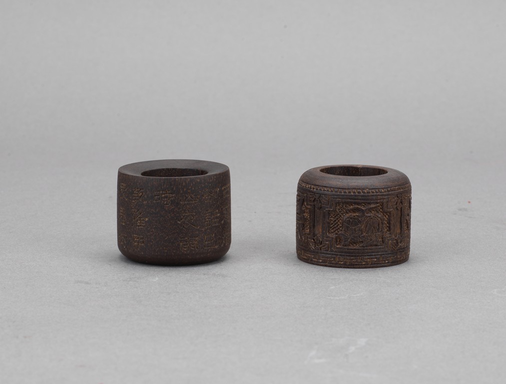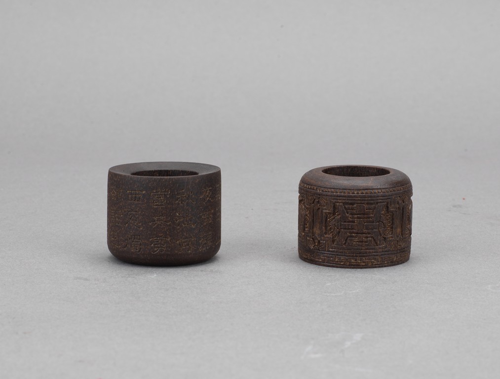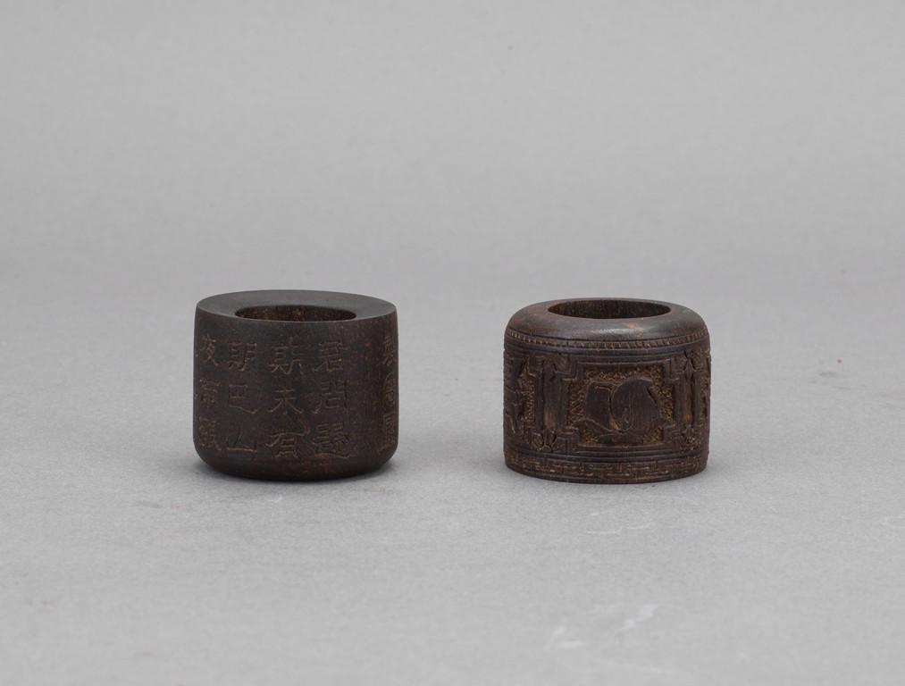 A PAIR OF CHENGXIANGMU ARCHER'S RINGS 沉香木詩文扳指一對 配盒