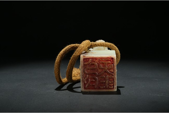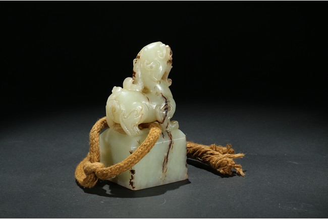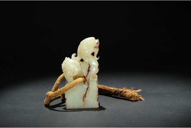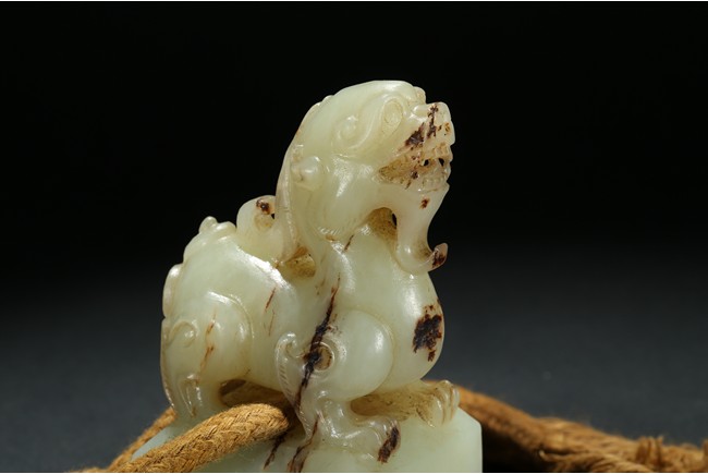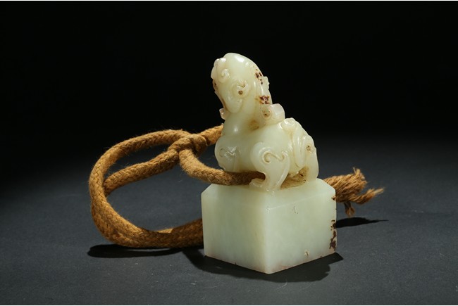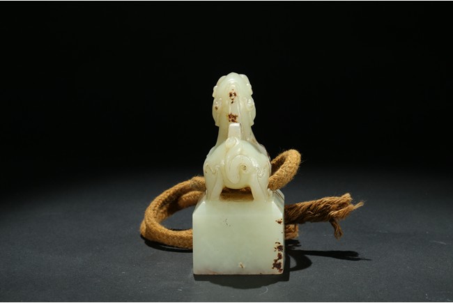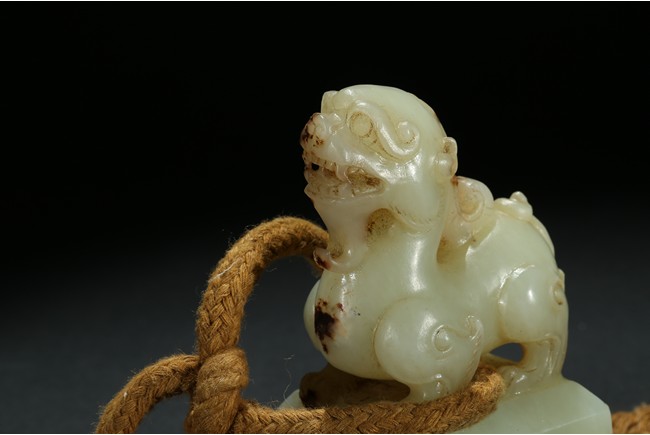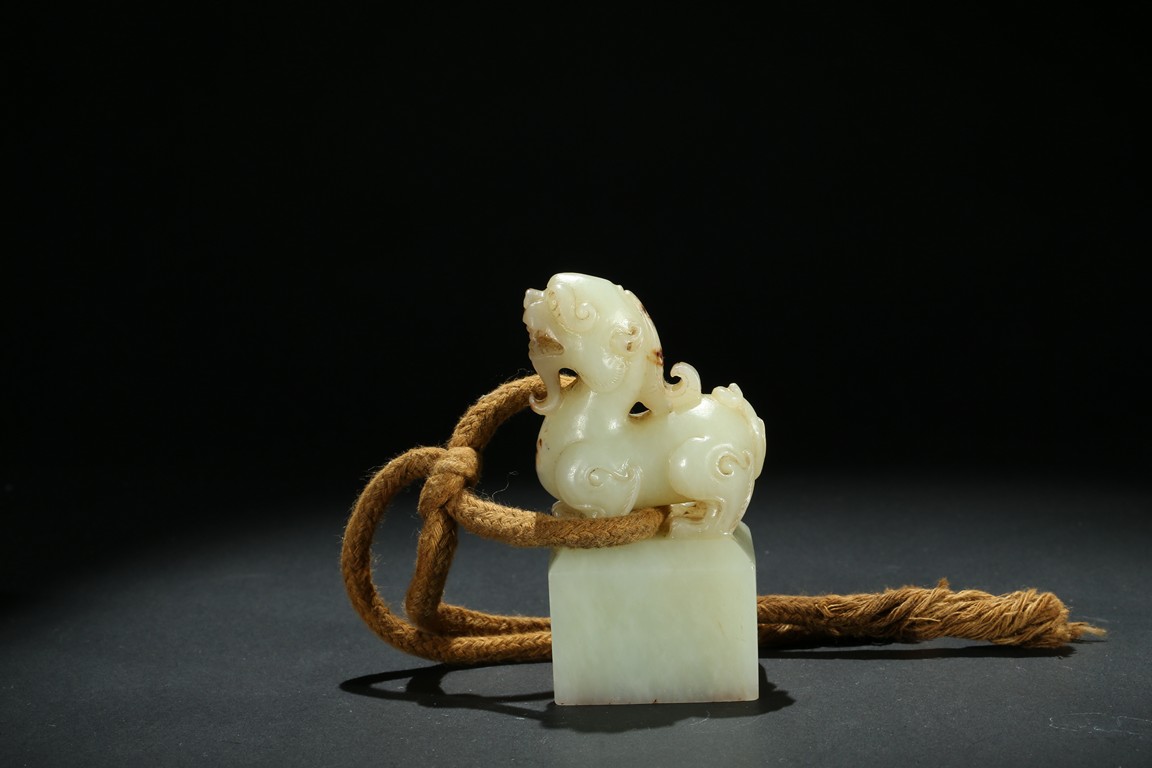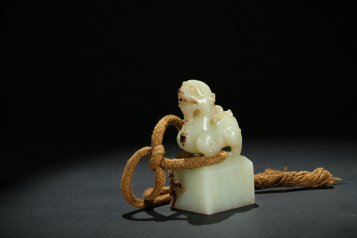 Of square section, surmounted with a foursquare standing mythical beast, the seal face carved with four character. Qing Dynasty period.