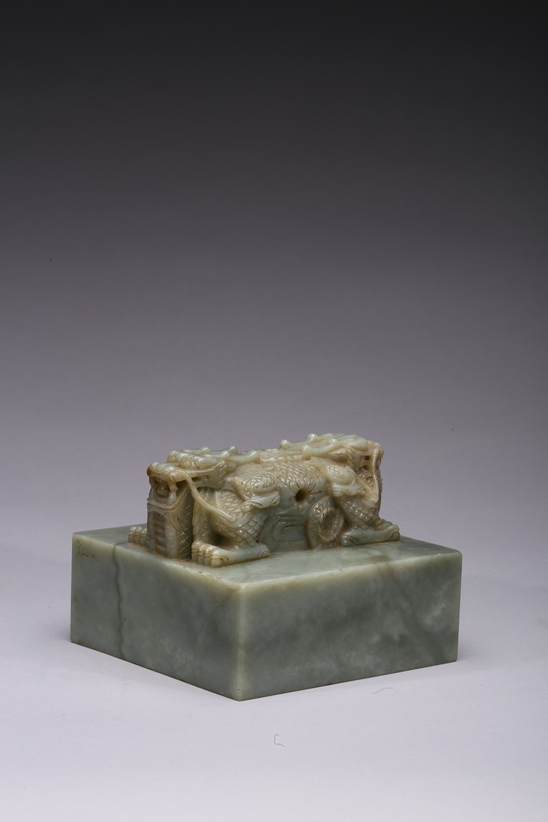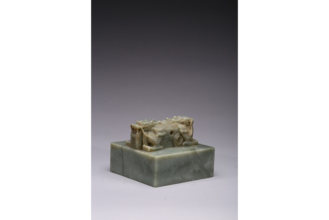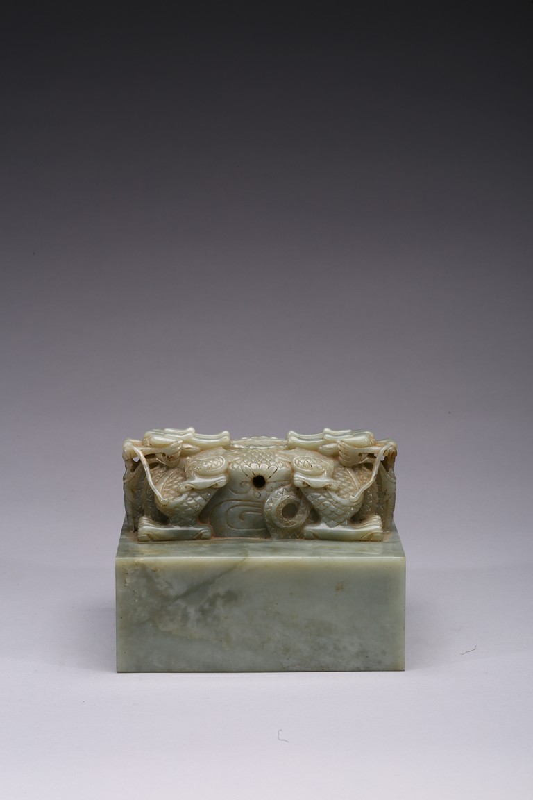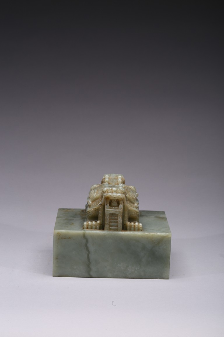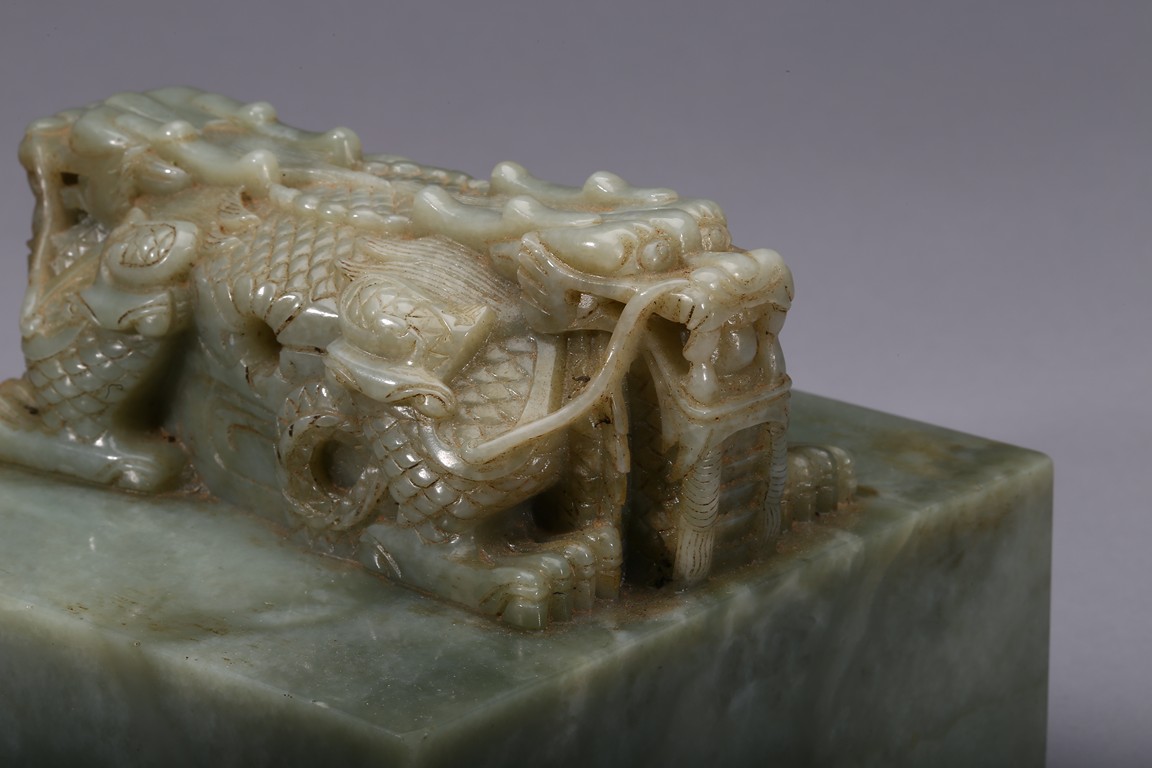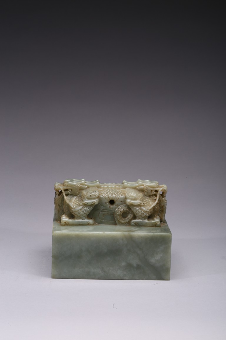 此印章玉質細膩溫潤,採用整塊青玉雕琢而成,通體青白色,包漿厚重古樸,印面為長方形,交龍鈕,即鈕左右兩邊均見龍首,雙身相連。底部刻有印文,運筆硬朗遒勁,頗見厚實穩健之氣象,獨有一番古拙蒼勁的金石韻味。
