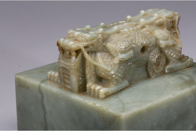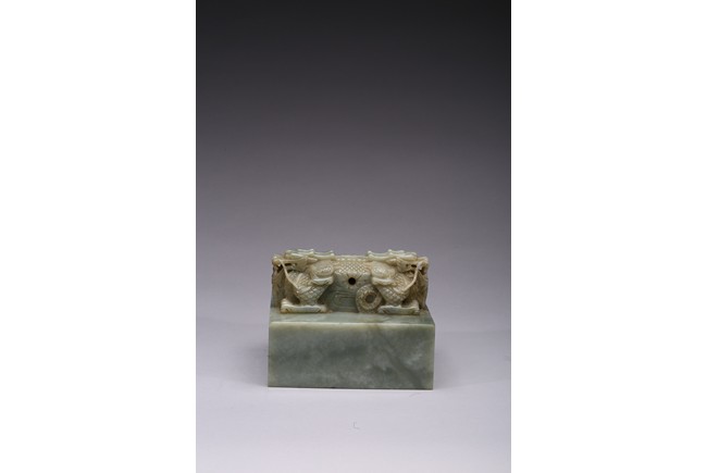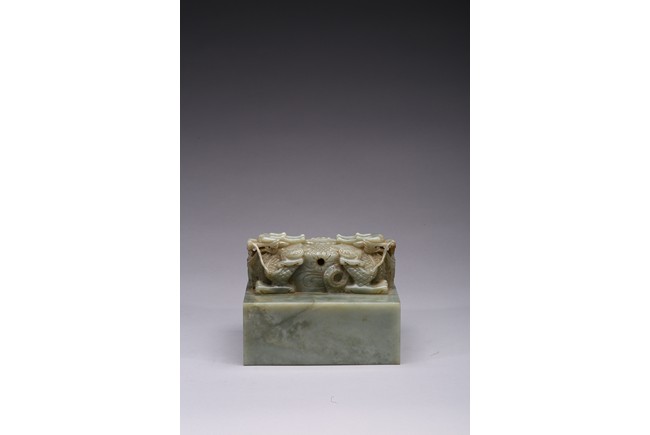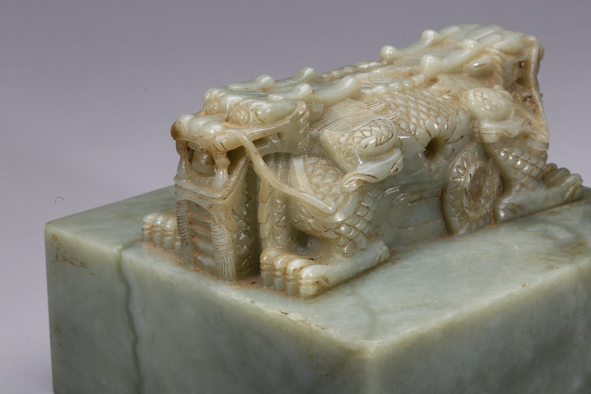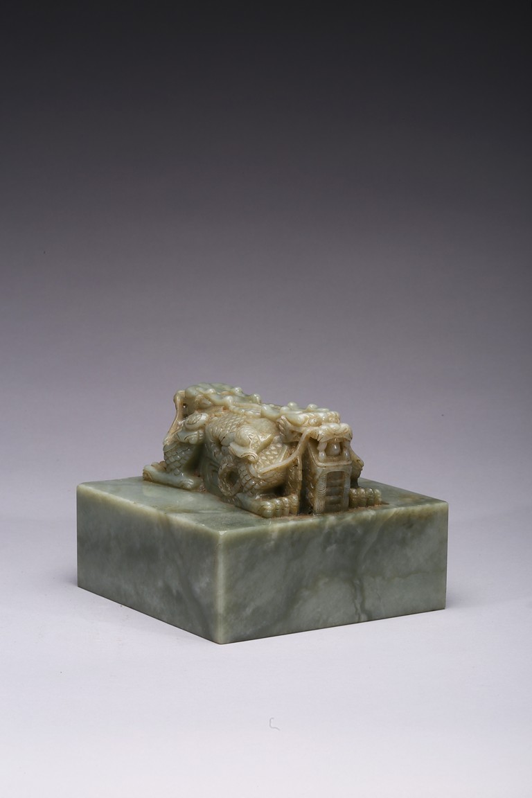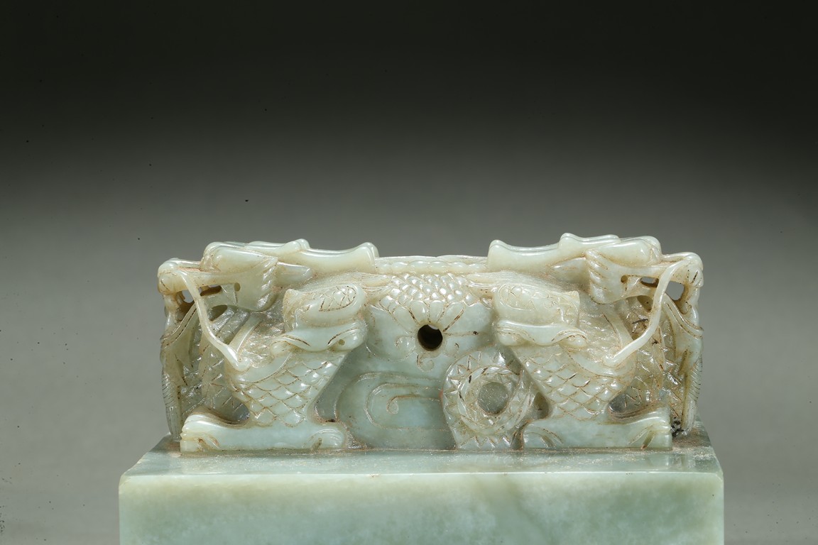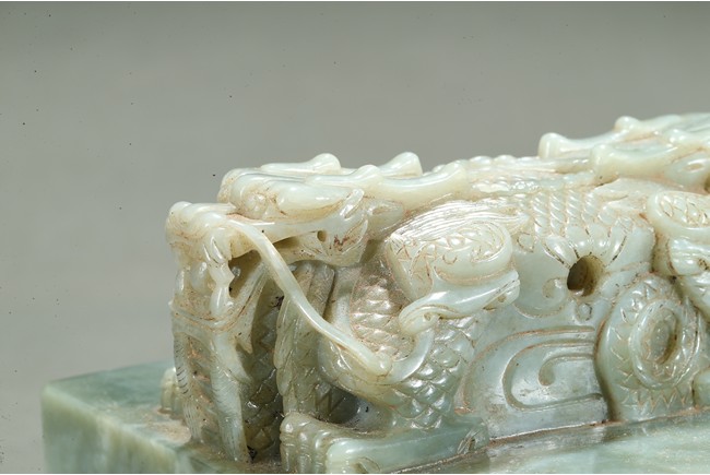 此印章玉質細膩溫潤,採用整塊青玉雕琢而成,通體青白色,包漿厚重古樸,印面為長方形,交龍鈕,即鈕左右兩邊均見龍首,雙身相連。底部刻有印文,運筆硬朗遒勁,頗見厚實穩健之氣象,獨有一番古拙蒼勁的金石韻味。