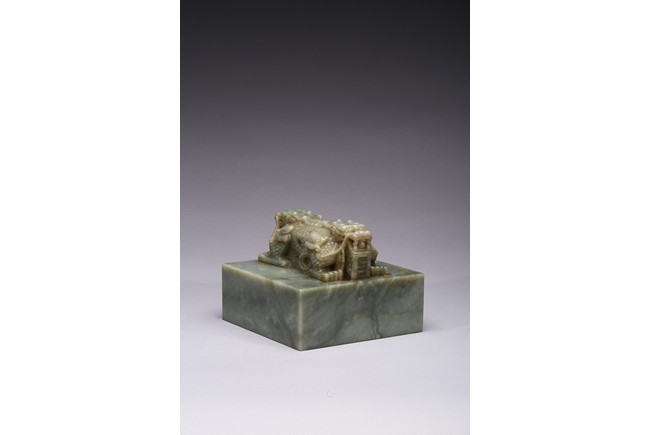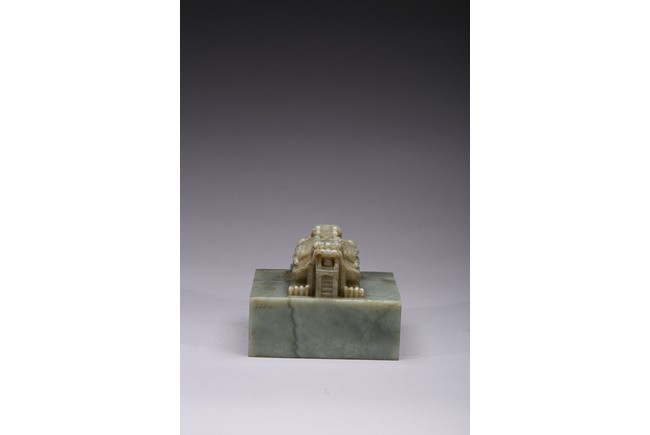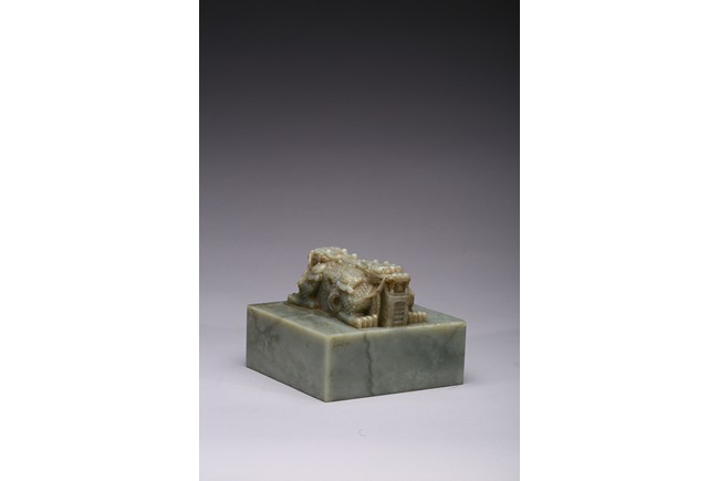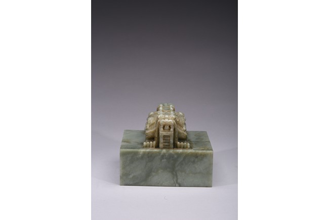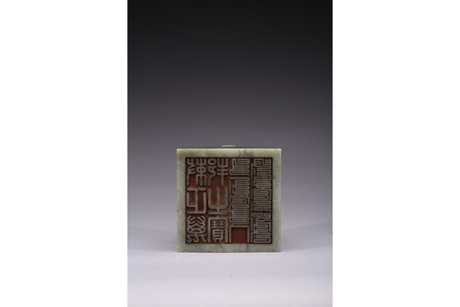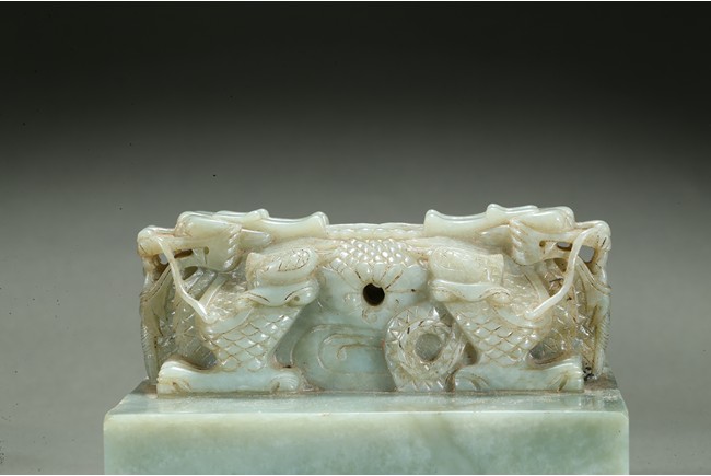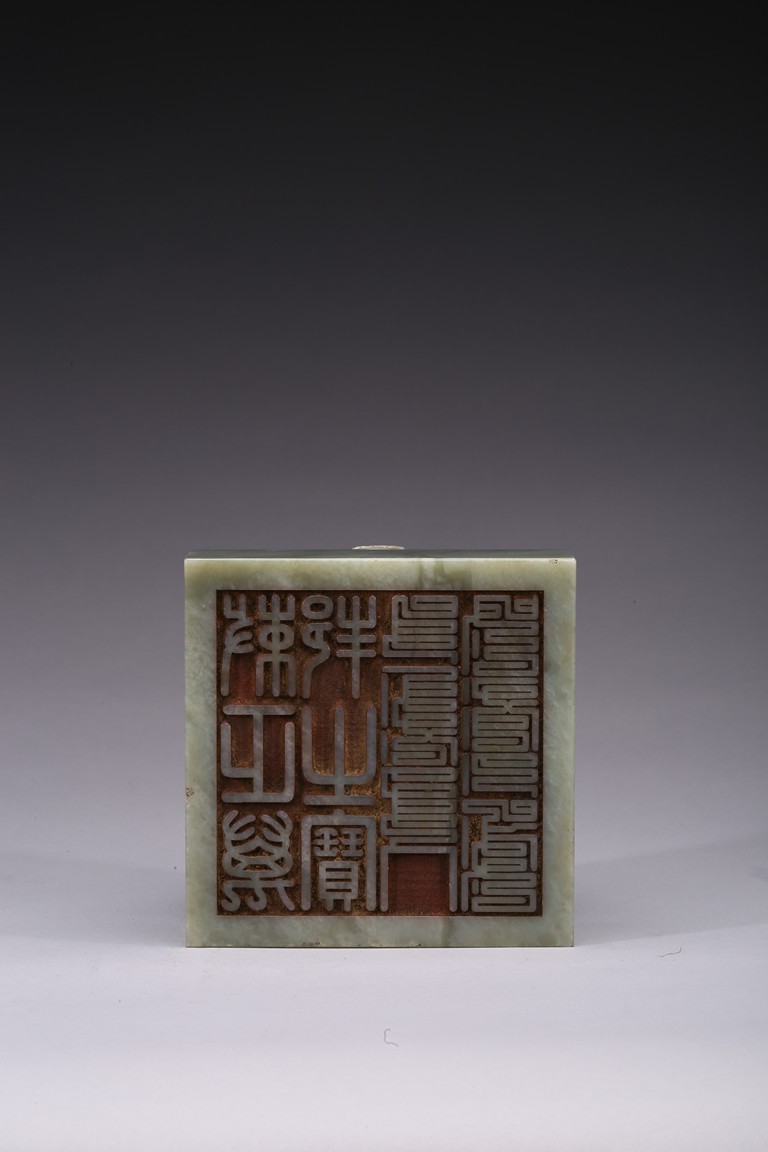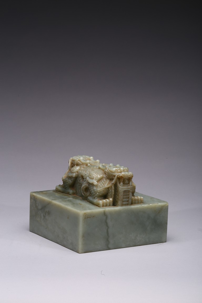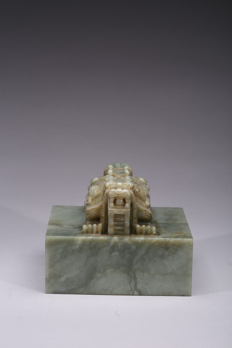 此印章玉質細膩溫潤,採用整塊青玉雕琢而成,通體青白色,包漿厚重古樸,印面為長方形,交龍鈕,即鈕左右兩邊均見龍首,雙身相連。底部刻有印文,運筆硬朗遒勁,頗見厚實穩健之氣象,獨有一番古拙蒼勁的金石韻味。