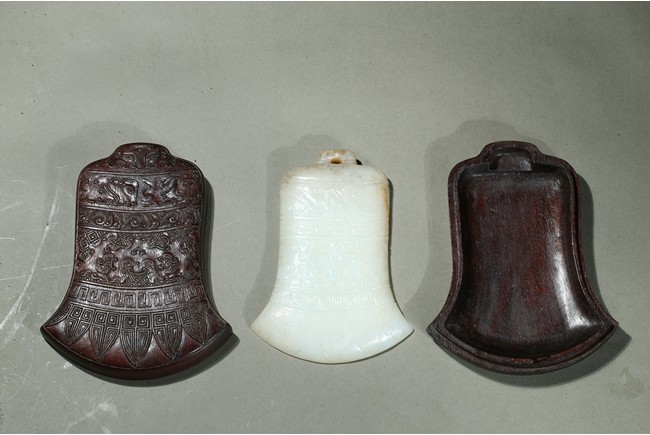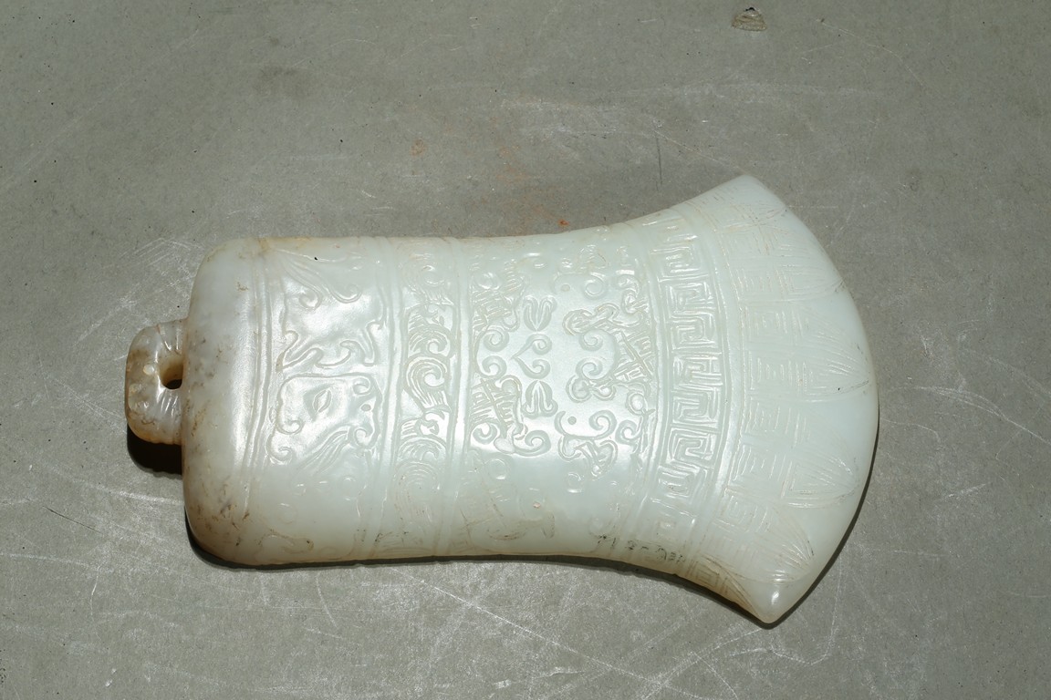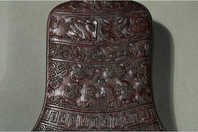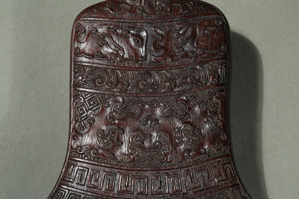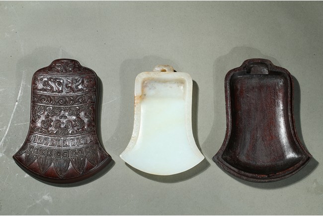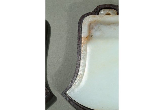 The fan-shaped inkstone with key-fret pattern to the rim, surmounted with a small loop to the top, the reverse carved in shallow relief with archaistic pattern, all fitted in a carved zitan box and cover. Qing Dynasty period.