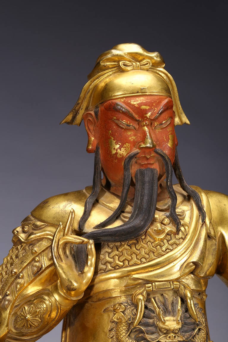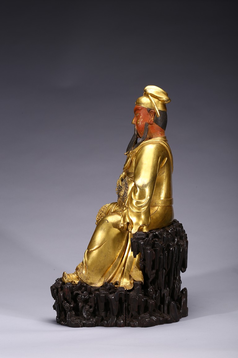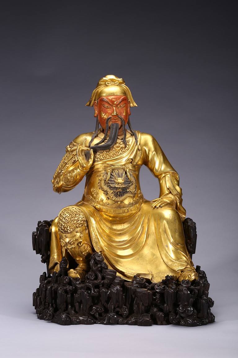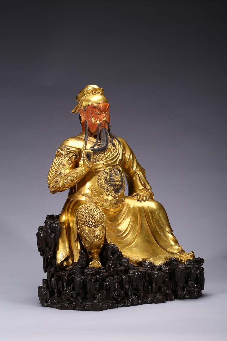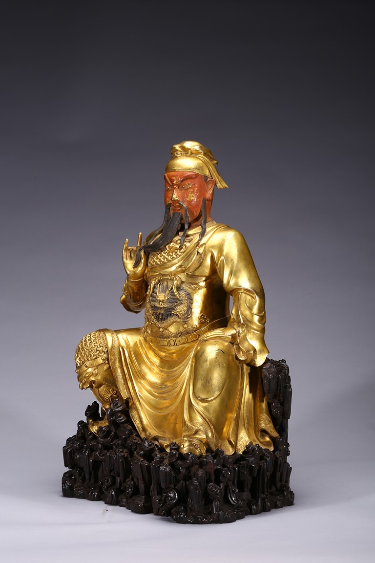 銅製關羽坐像,頭帶武生巾,面容威嚴,美髯長飄,身著甲胄。右手捋髯,左手撫膝,足登雲靴,整件造像,氣宇軒昂,大氣磅礴,雙目炯炯有神,通身鎏金,金色醇厚,在民間關公不僅被視作忠義的象徵,而且被奉為武財神而廣受尊崇。配有紅木底座。