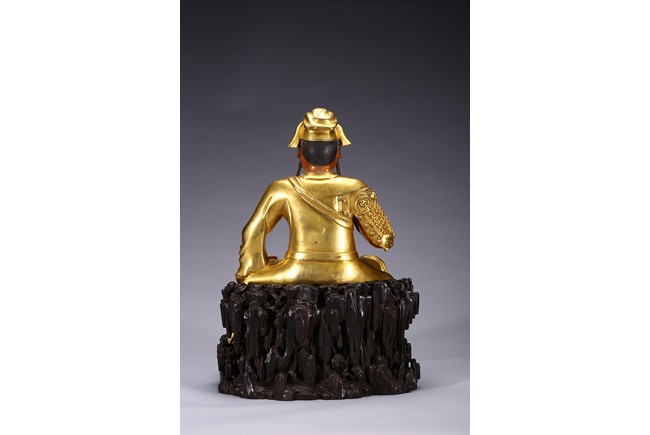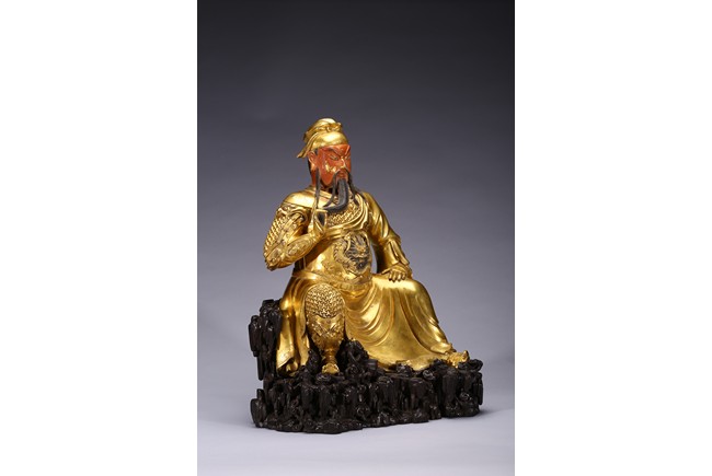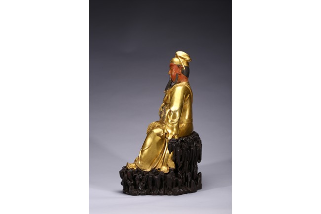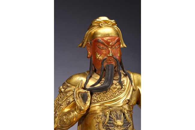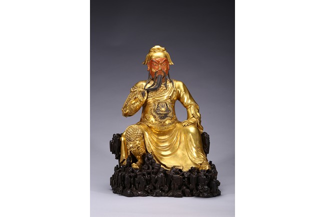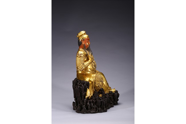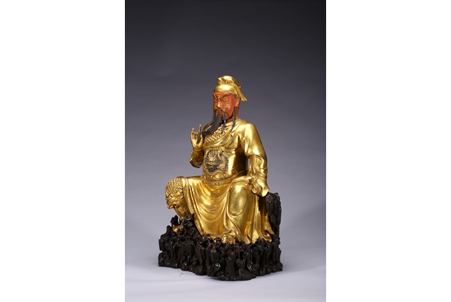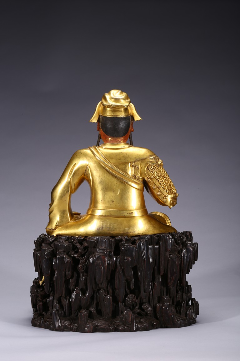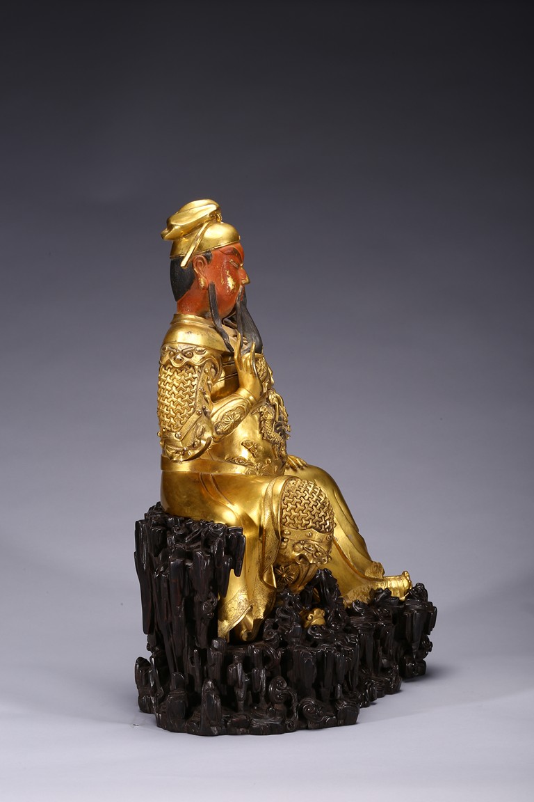 銅製關羽坐像,頭帶武生巾,面容威嚴,美髯長飄,身著甲胄。右手捋髯,左手撫膝,足登雲靴,整件造像,氣宇軒昂,大氣磅礴,雙目炯炯有神,通身鎏金,金色醇厚,在民間關公不僅被視作忠義的象徵,而且被奉為武財神而廣受尊崇。配有紅木底座。