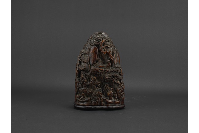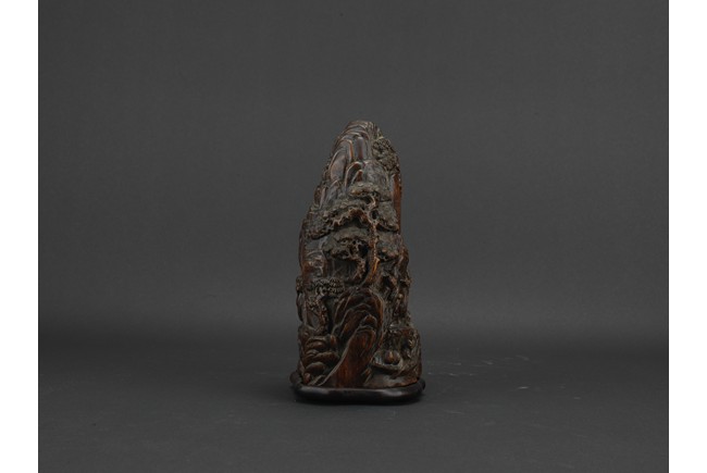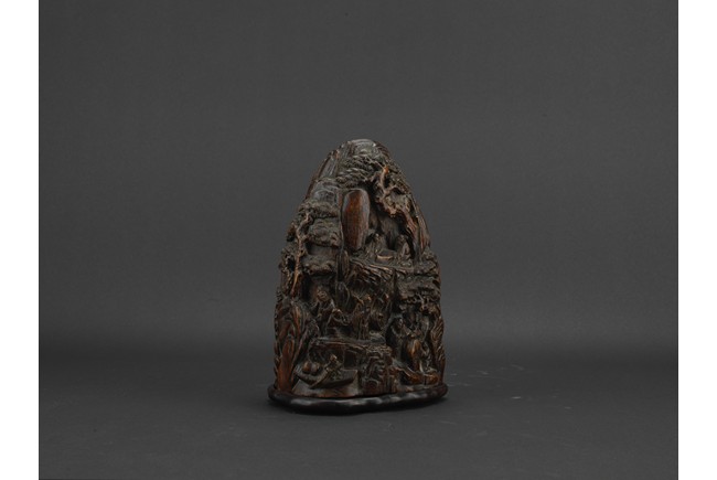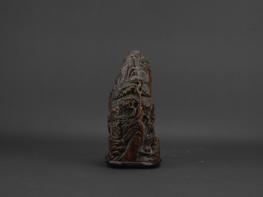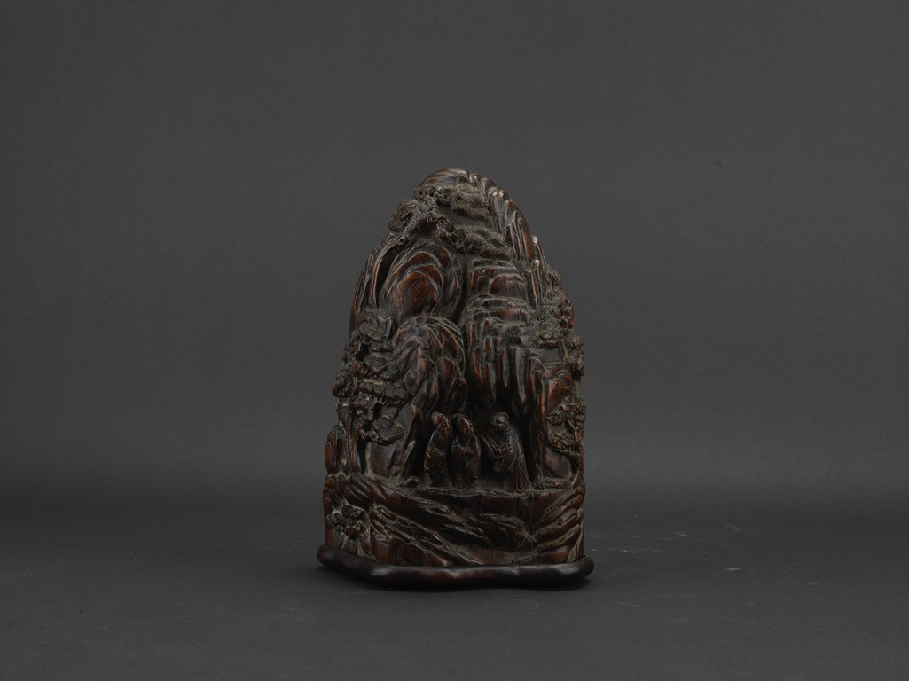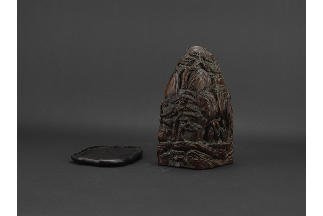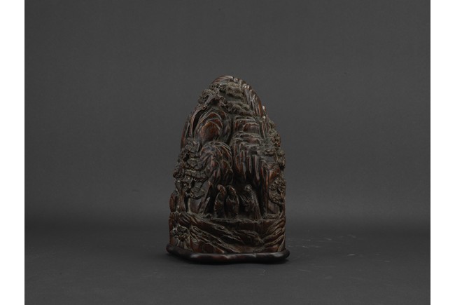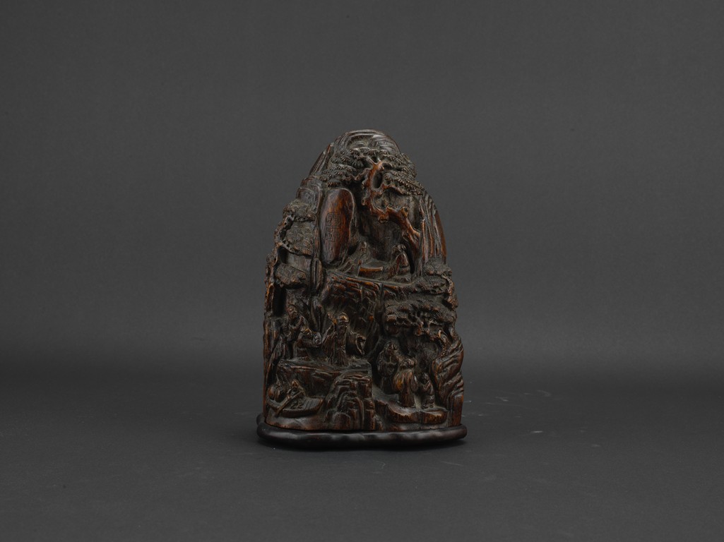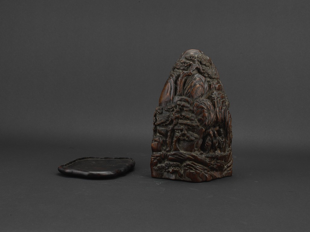 Boulder carved with elderly figures engaging in scholarly activities in a mountain setting, wood with characteristic aroma, fitted in stand. Qing Dynasty period.