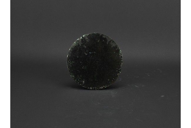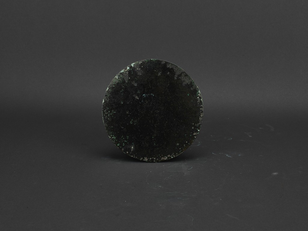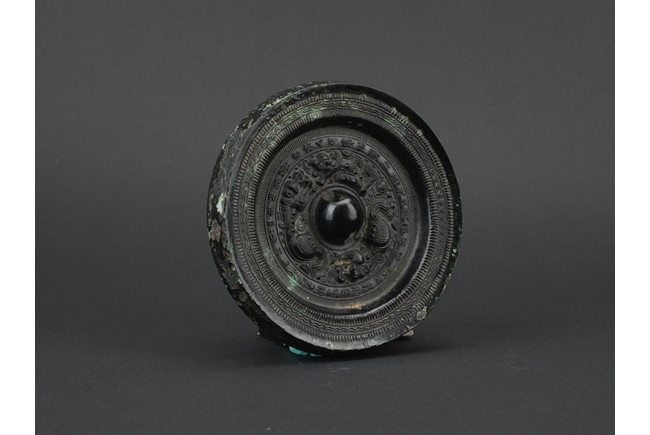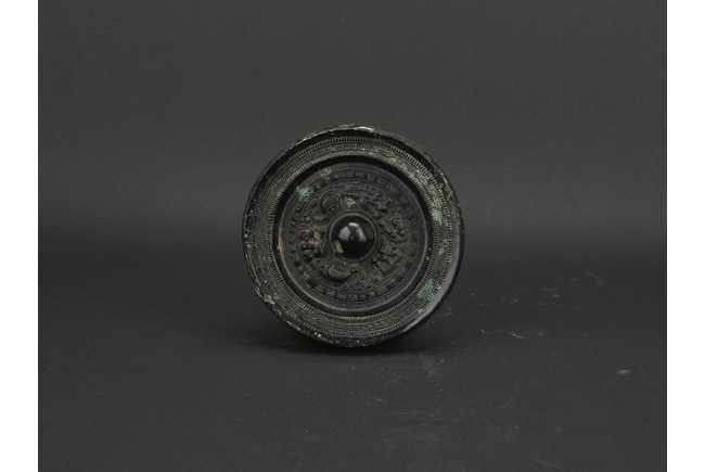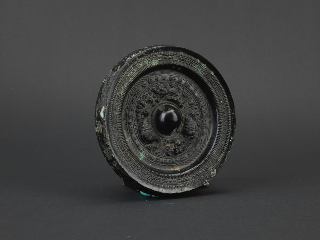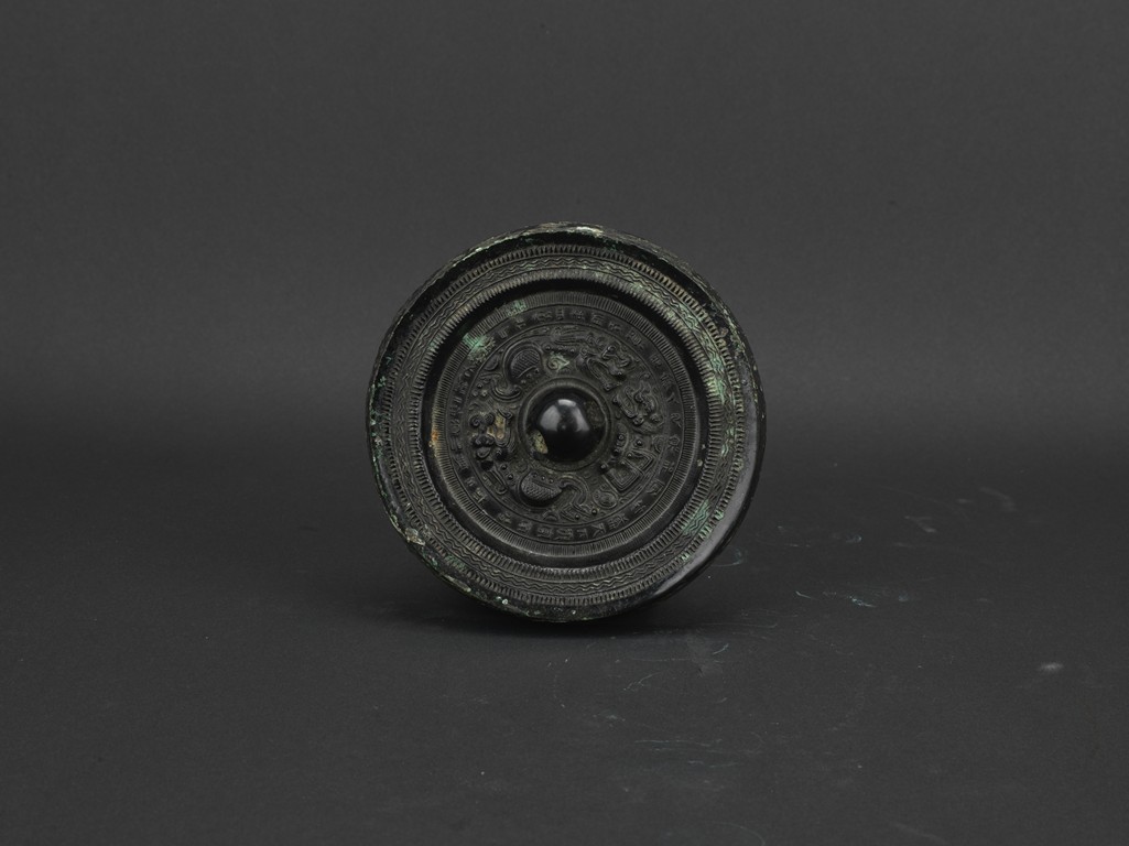 Cast in relief with a central knob, surrounded by mythical beasts within a ring of inscription, the outer field with wave like pattern, the dark grey surface with malachite encrustation. Ming Dynasty period.