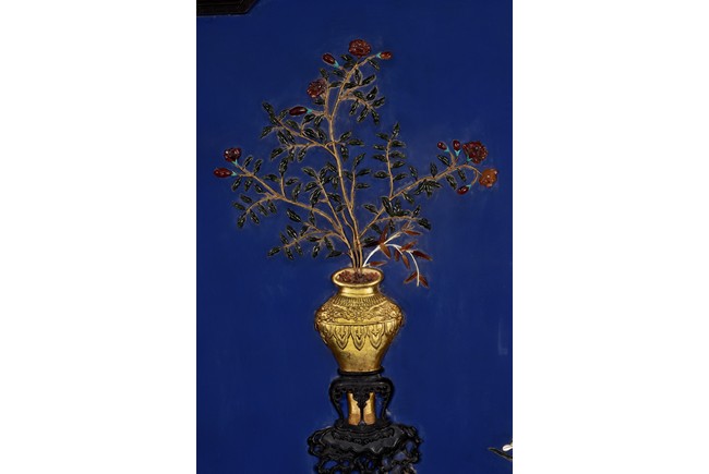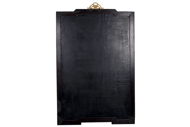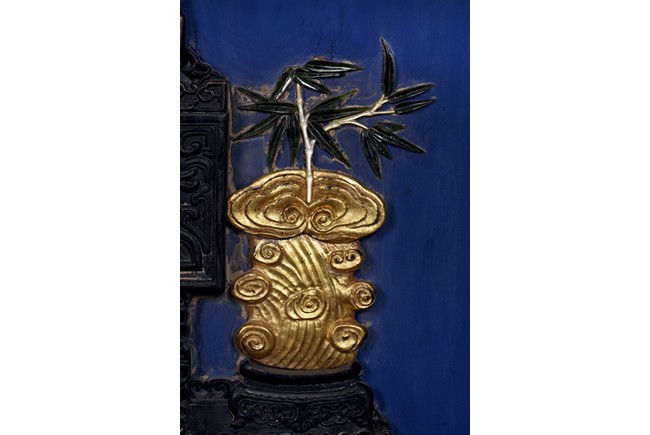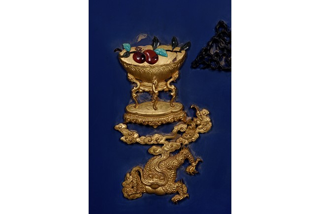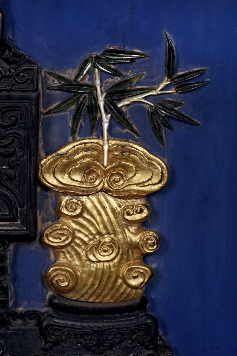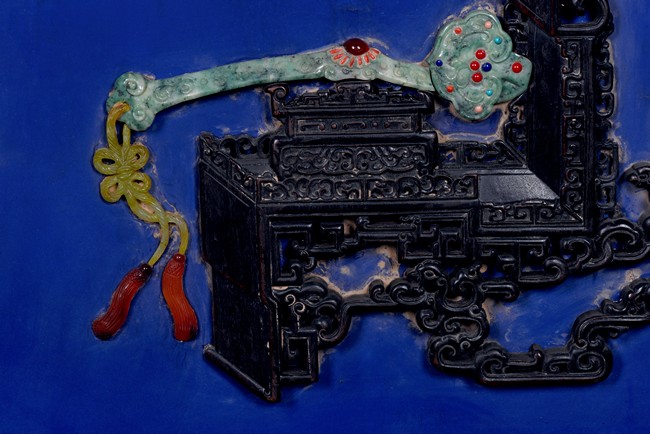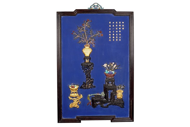 The panel carved and mounted with mother-of-pearl, amethyst, agate, quartz, gilt-metal, coral, hardstones, turquoise, spinach-green jades, depicting a bogu scene of orchids, bamboo, gourds, ruyi scepter, all above gilt-bronze or zitan stand carved in relief.