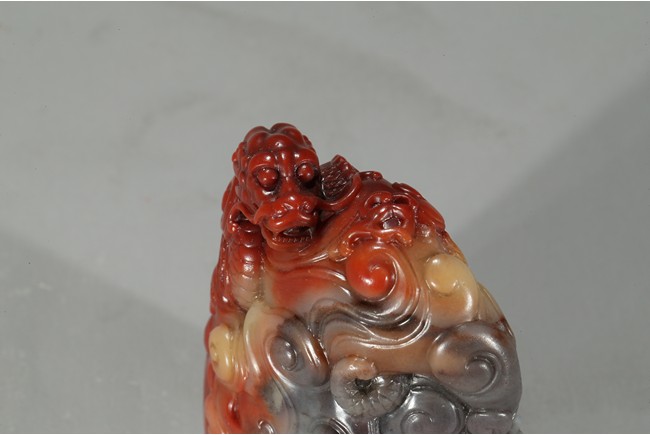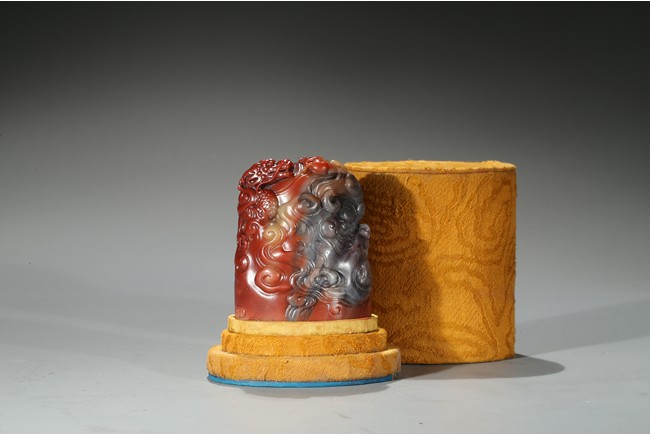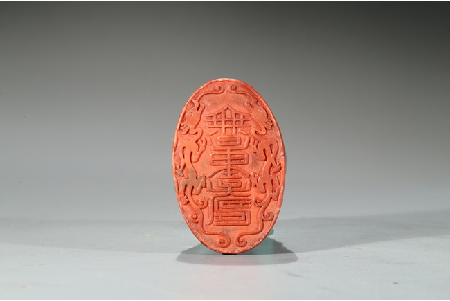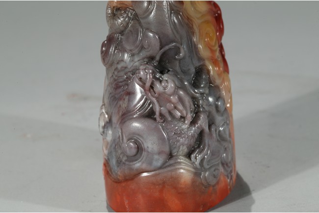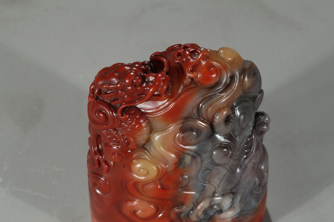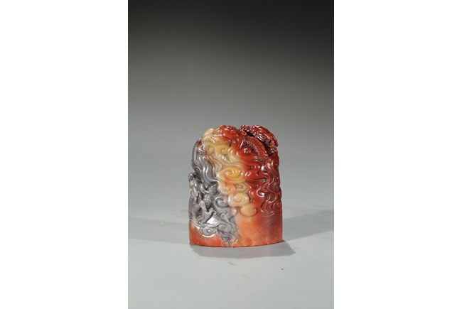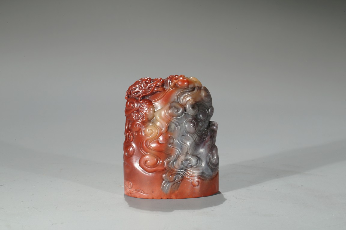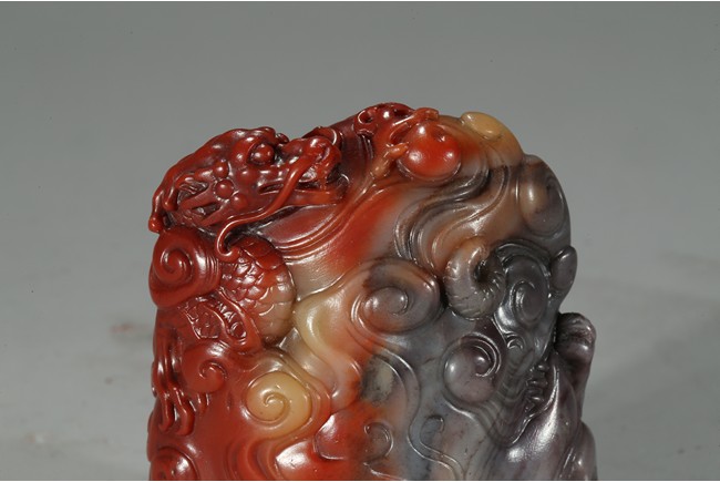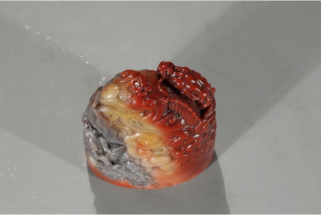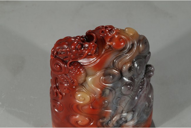Of oval section, the seal carved with two ferocious dragons emerging from auspicious clouds in pursuit of the flaming pearl, the seal face carved with three character 'Wu Liang Shou', or 'infinite longevity' in seal script, flanked by two sinuous chilong. The stone is of tricolor of red, beige, and grey tone. Qing Dynasty Qianlong period.
