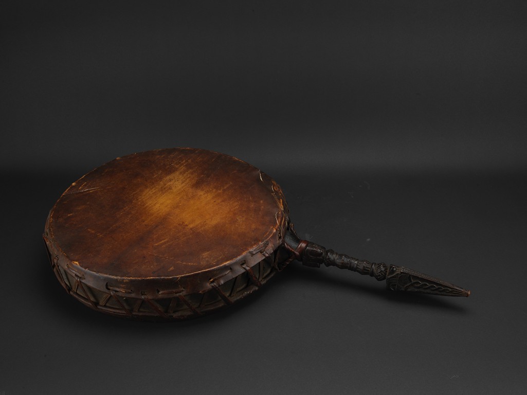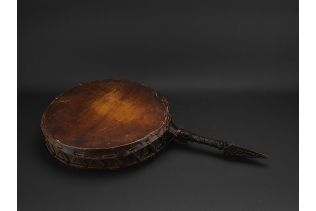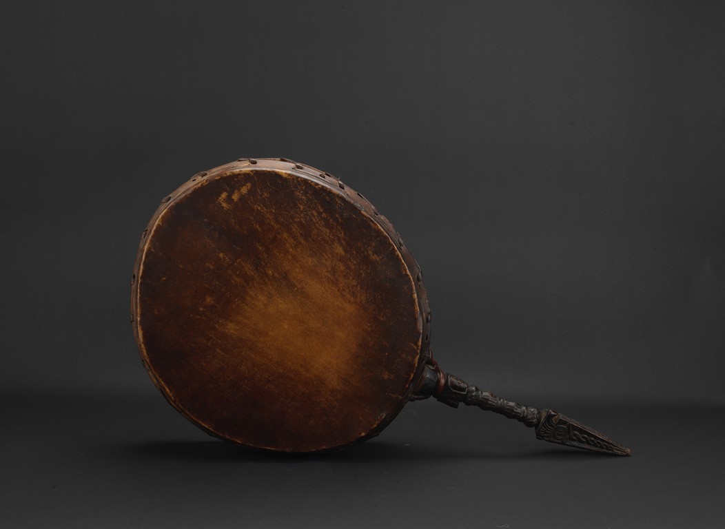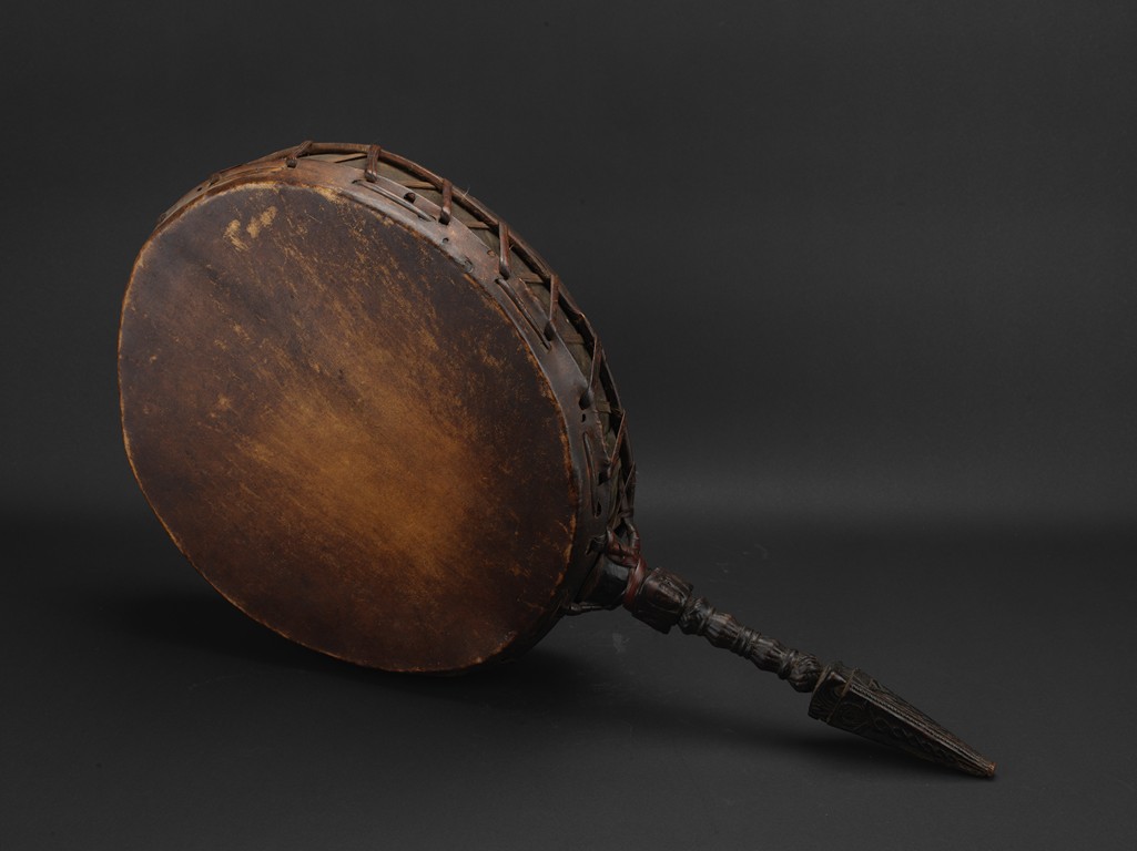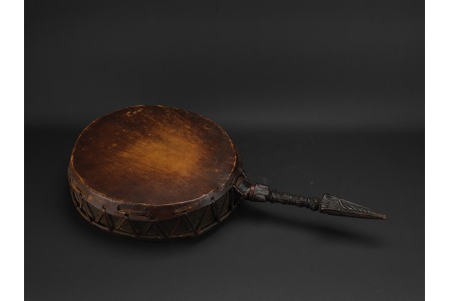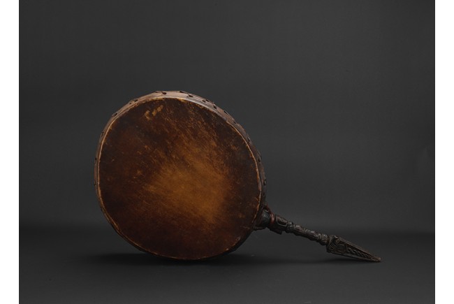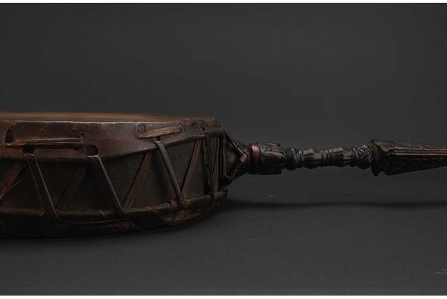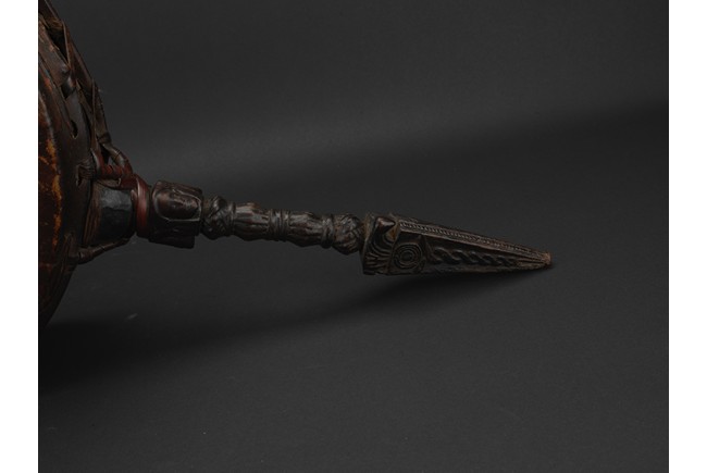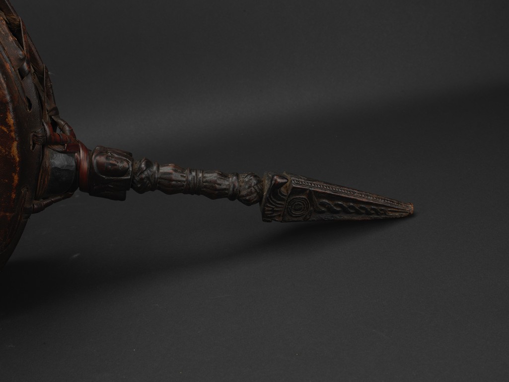 Tibetan.The large circular leather drum with a bronze vajra as handle. 15th century.