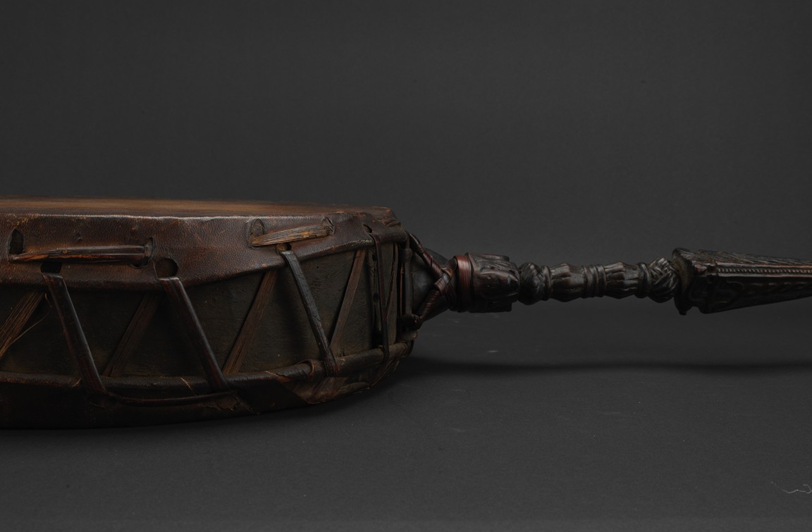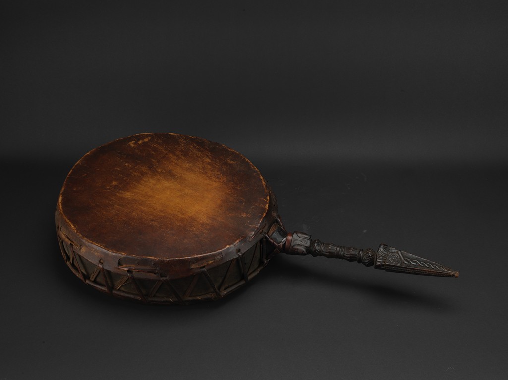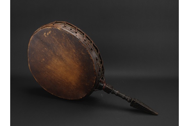 鼓為藏傳佛教中法器之一,用於寺院日常行事或臨時集會敲嗚用的器具,及唱誦、法會、各種儀式中領眾之用。此件拍品體型巨大,由西藏檀木與牛皮製成,音色沉穩,鼓柄處為金剛杵式形制,應為十五世紀西藏大型寺廟所用。