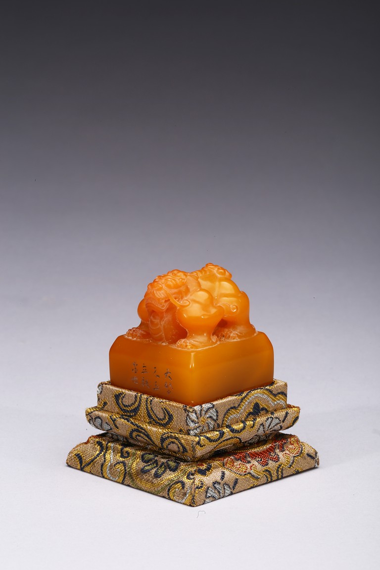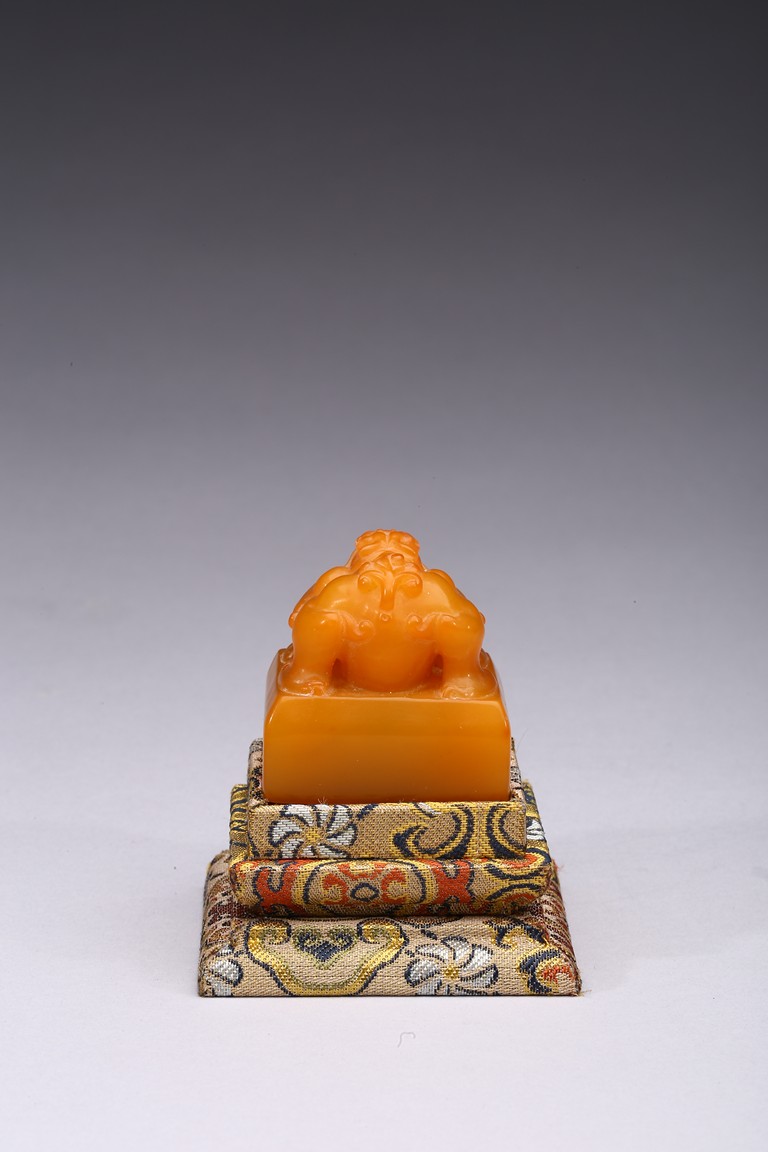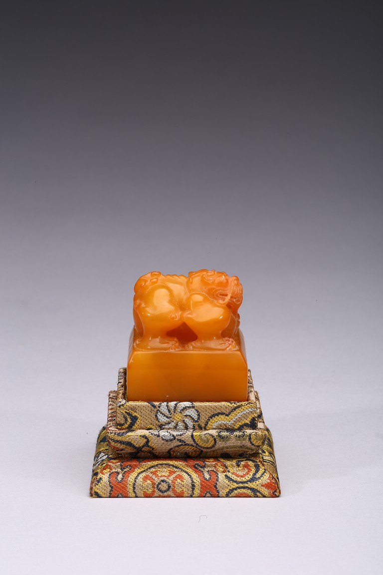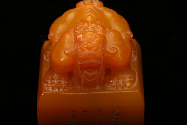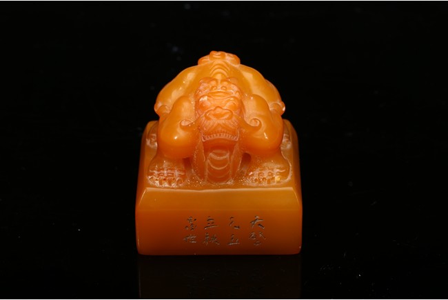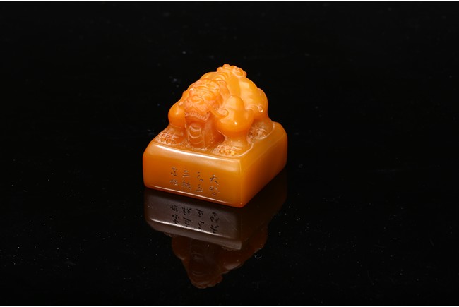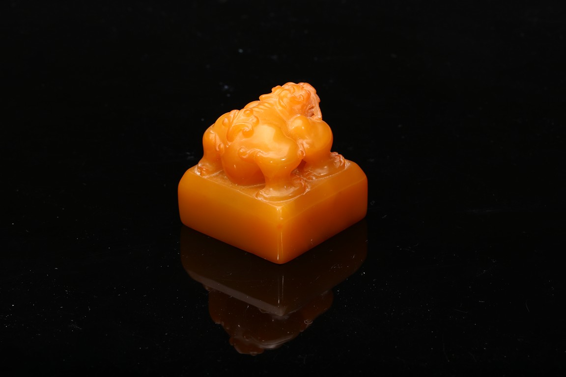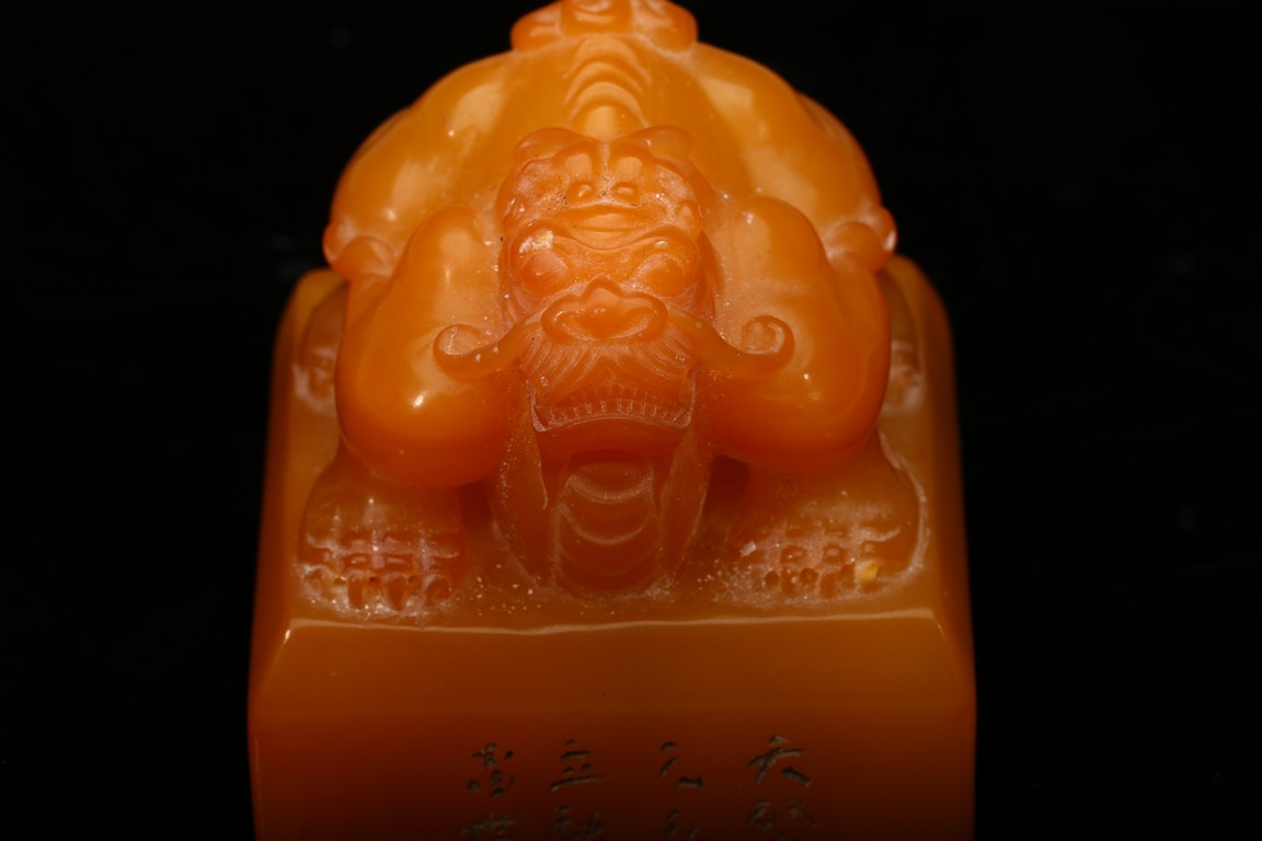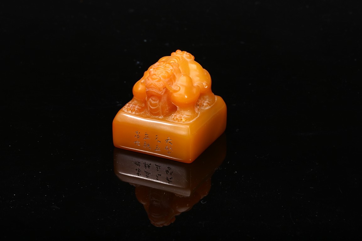 Of rectangular form, the seal top surmounted with a mythical beast standing foursquare with mouth agape, one side of the seal carved with inscription. Republic period.
