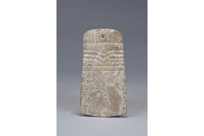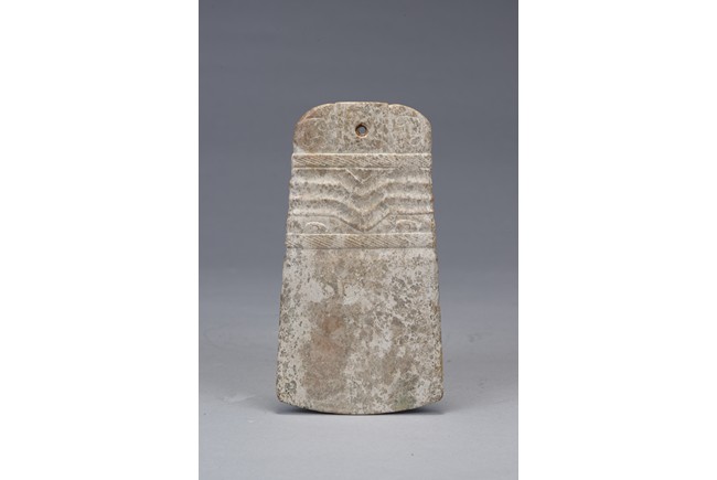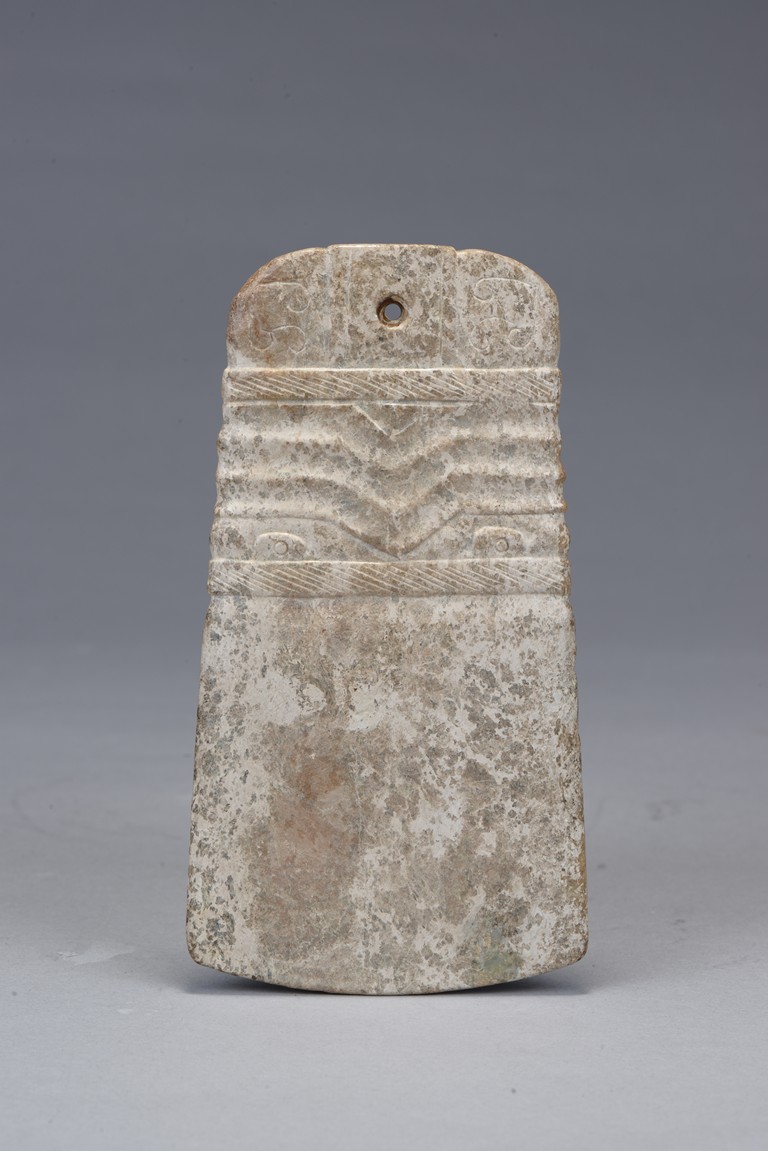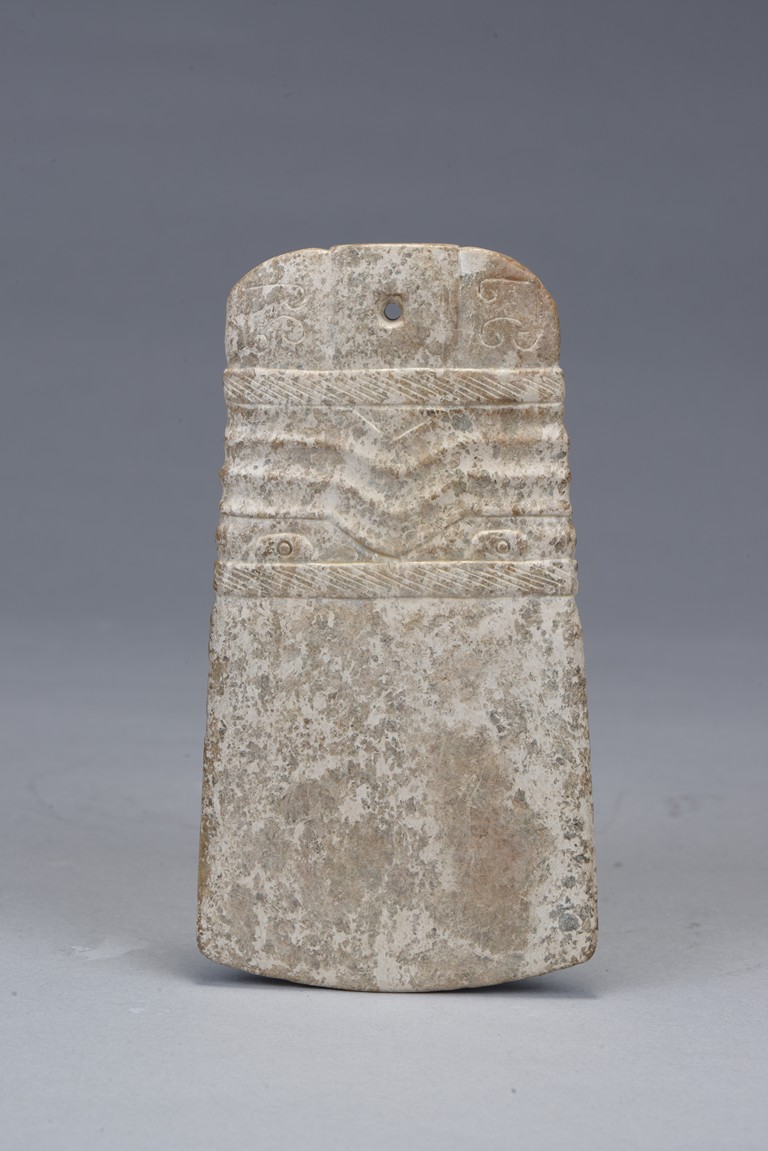整器通途呈黃褐色,有大部分白泛黑褐色斑。器物呈風字形,刃呈弧形。前 端有圓穿,用於固定器柄。斧在古代作為權力的象徵,為社會上層人士所擁有。