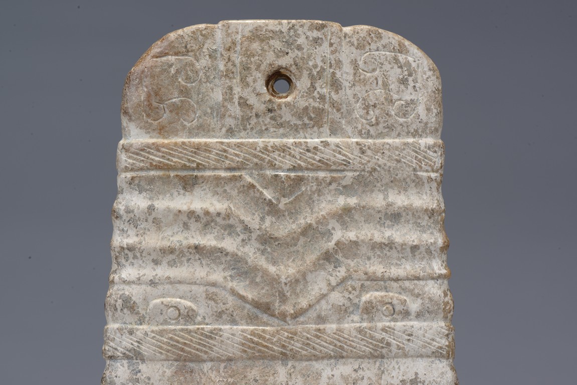 Carved in low relief with taotie mask in between two raised bands, the upper center drilled with an aperture. Shang Dynasty period.