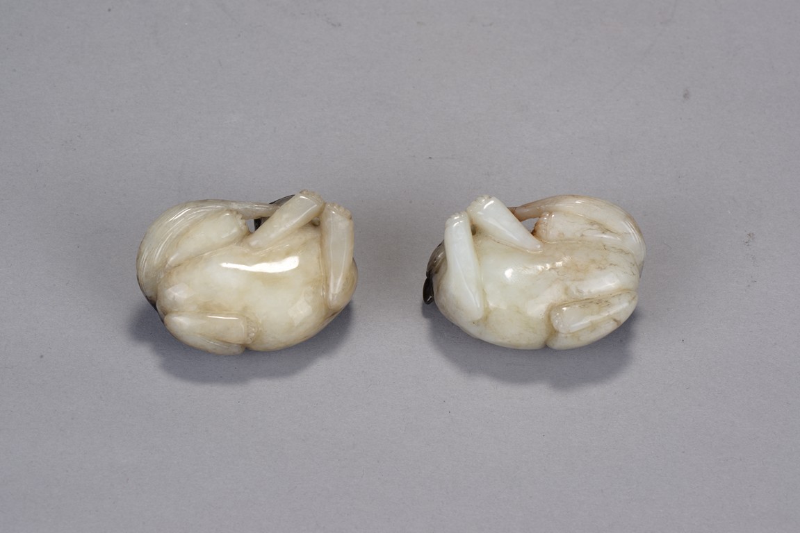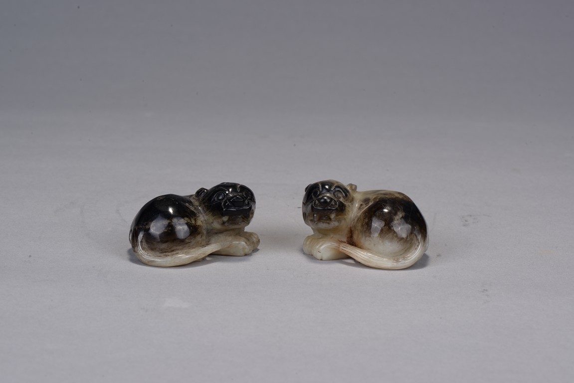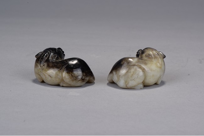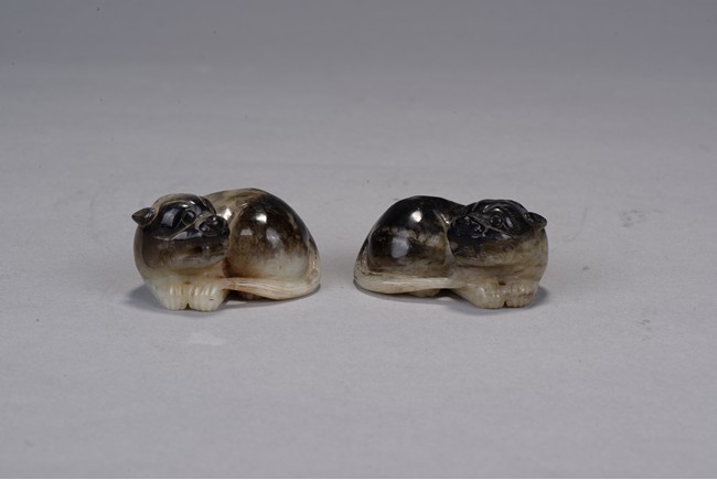 Each recumbent mythical beast shown with head turned to right and left, respectively, the stone with extensive black inclusions. Ming Dynasty period.
