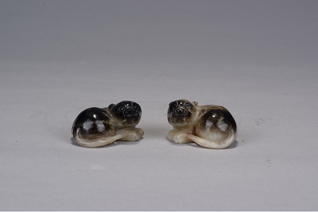 此件器物白玉帶有大片黑褐沁色。圓雕獅作臥狀,眼睛突出,大嘴、重眉、葉耳,四足伏地,尾巴用陰刻線作飾。雕工簡潔,線條流暢,玉質油潤。