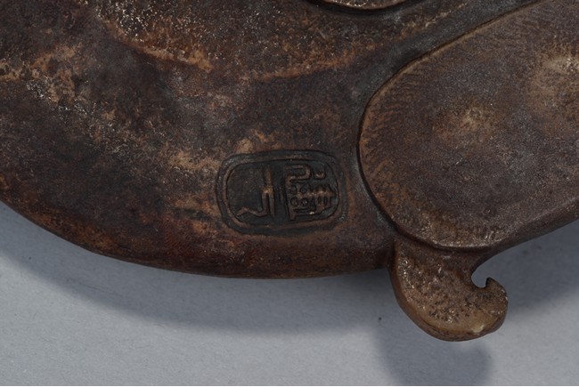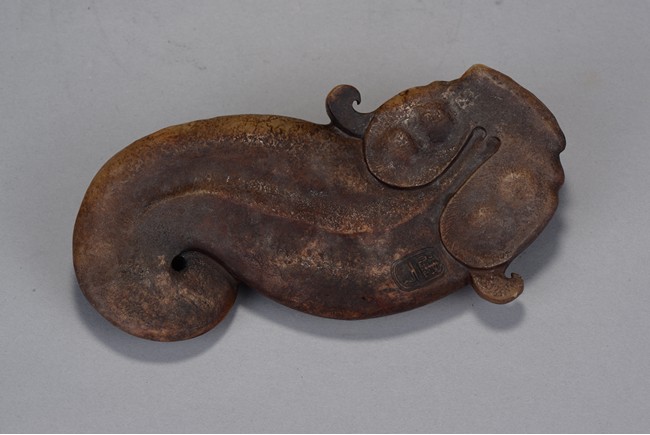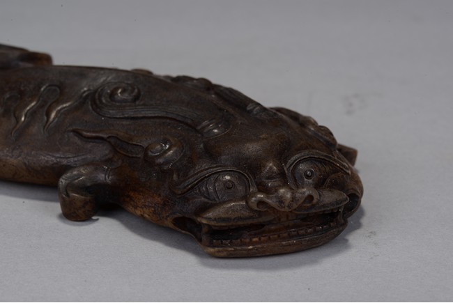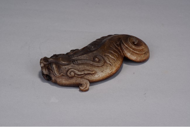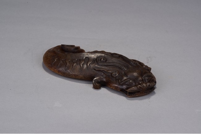 Carved with a dragon head and carp body, the belly impressed with a two character mark. Qing Dynasty period.