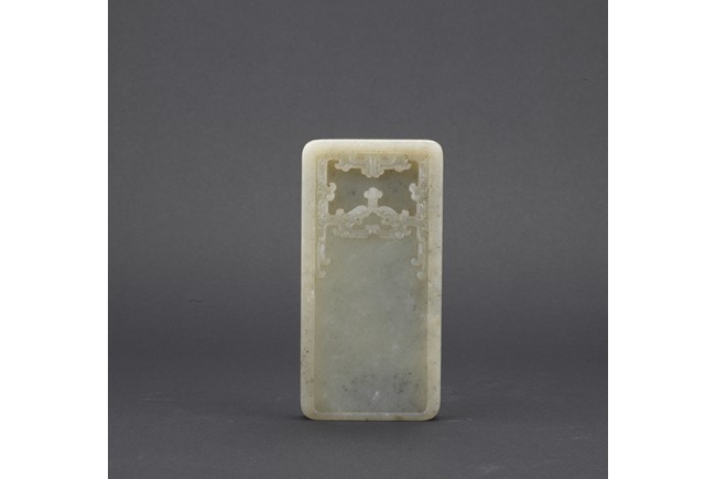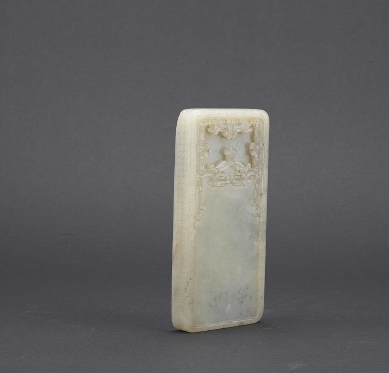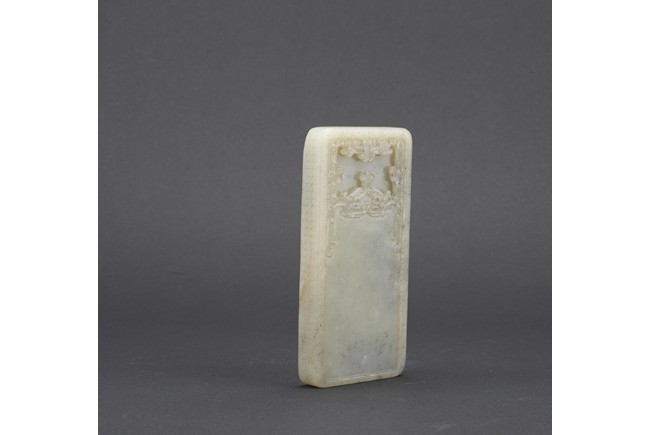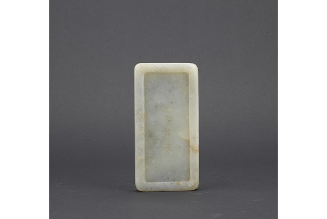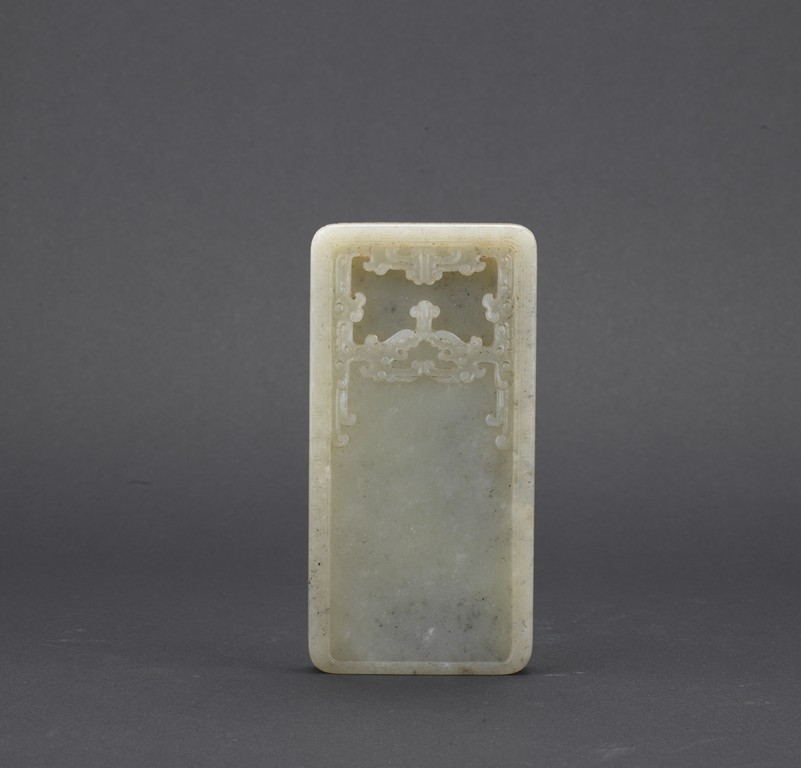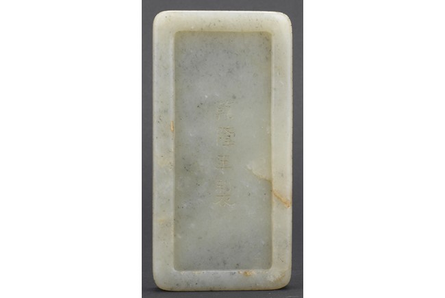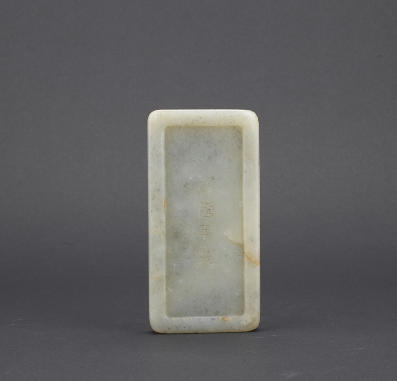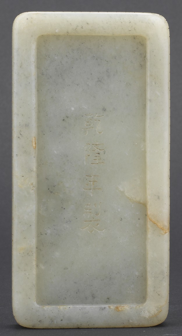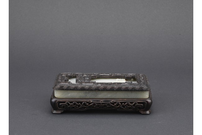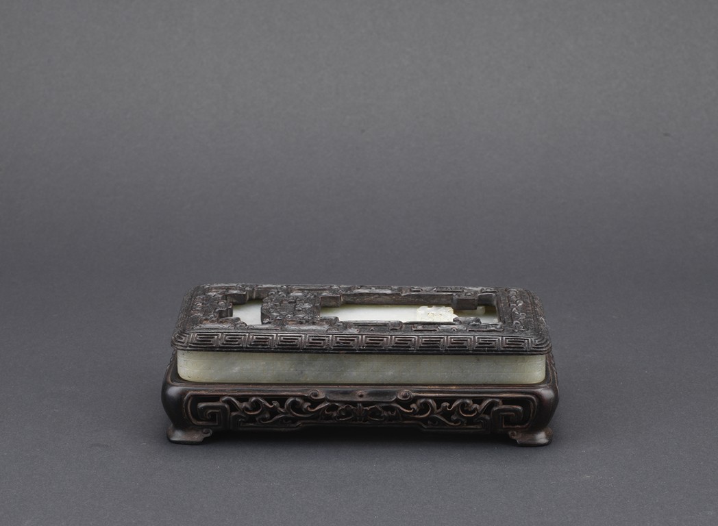Of rounded rectangular form, the inkwell enclosed within an archaistic border of confronting kui dragons, the translucent stone of a pale celadon color, the underside incised vertically with a four character Qianlong mark, all supported on zitan stand and cover. Qing Dynasty period.