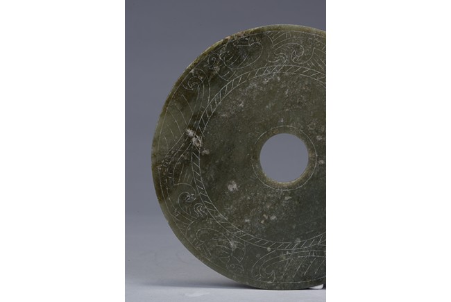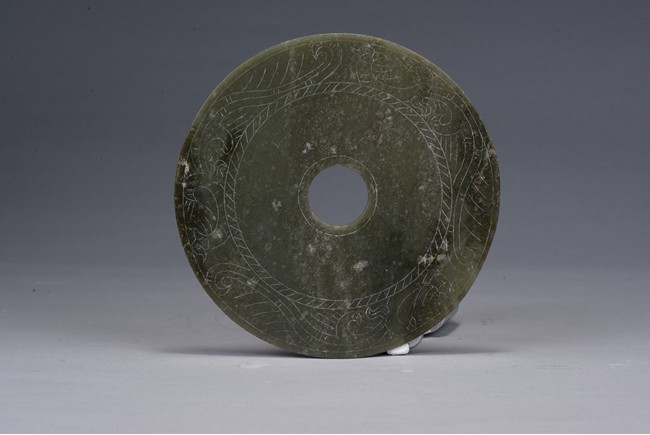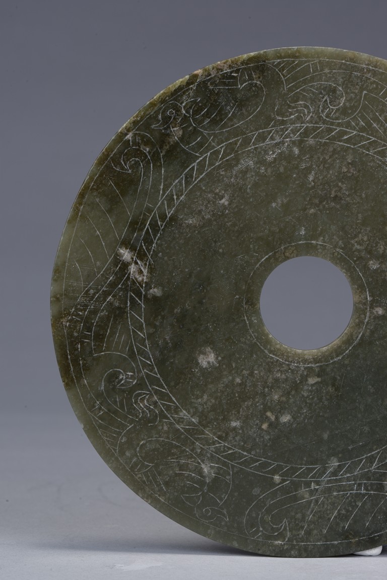 《說文》稱“璧圓像天”,《週禮》則有“以蒼璧禮天”之說。說明璧之圓 形是有仿“天圓”而作。其功能主要用於祭天的禮器,另外也有辟邪或是等級與 財富的象徵。本件器物青玉質地,質地較大。深綠色,圓整,中孔,外緣齊整, 花紋分為內外兩部分。內區飾斜格紋,外區飾鳳鳥紋。製作精美,實屬難得。