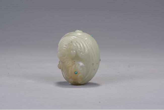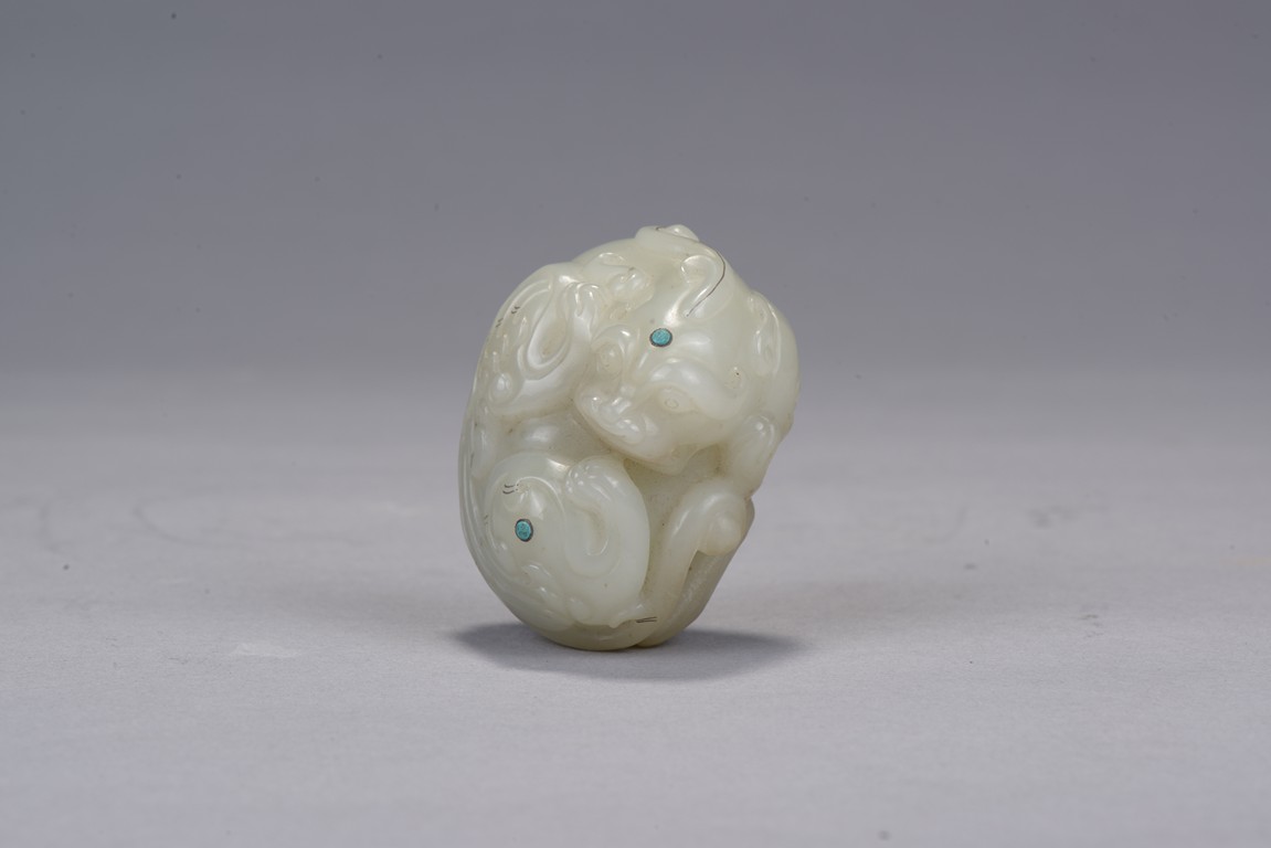 The coiled mythical beast is inlaid with turquoise beads and silver around body, the head with powerful nostril and protruding eyes, the stone is of even white polished tone. Ming Dynasty period.