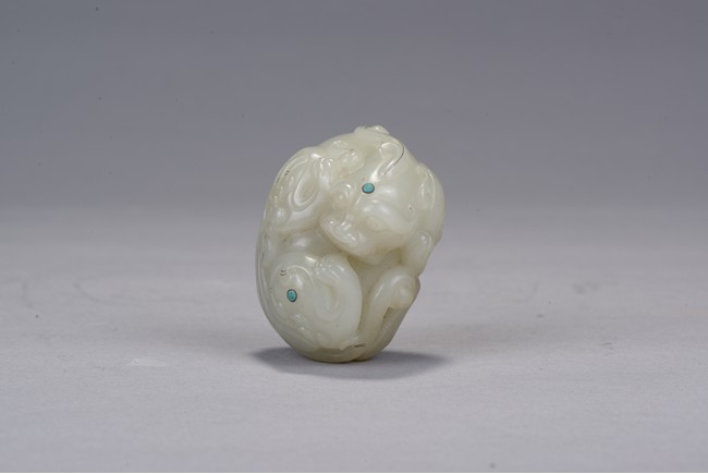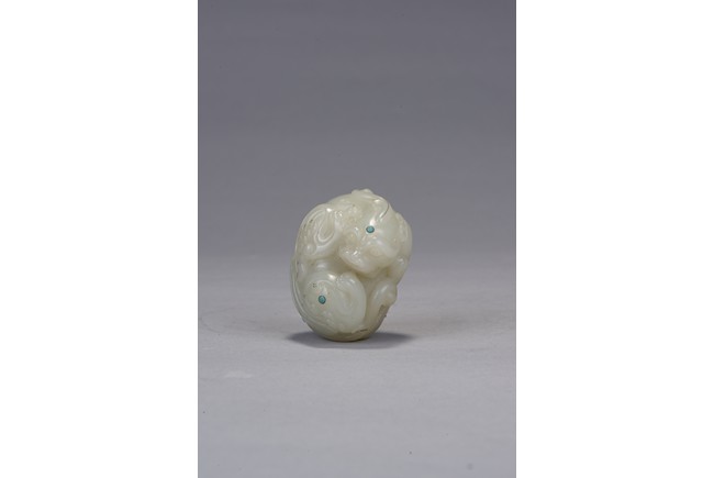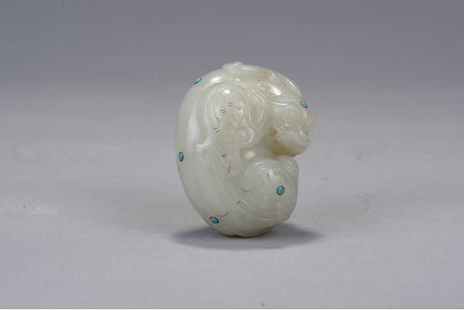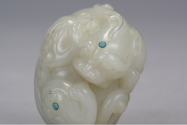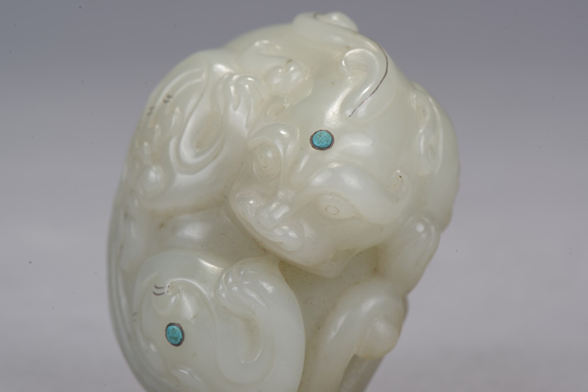 貔貅為招財神獸 ,它為帝王守護財寶,也是皇室的象徵,稱為“帝寶”。此 件器物運用上等的和田白玉雕製而成,色白瑩潤,質地細膩,形態圓潤飽滿,神 態威武。足上、頭上鑲嵌松石,有畫龍點睛之筆的作用。是一件適合把玩的精 美器物。