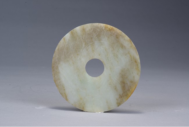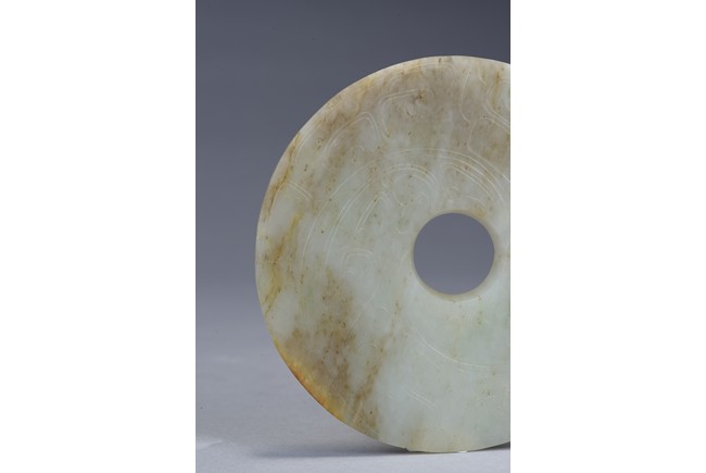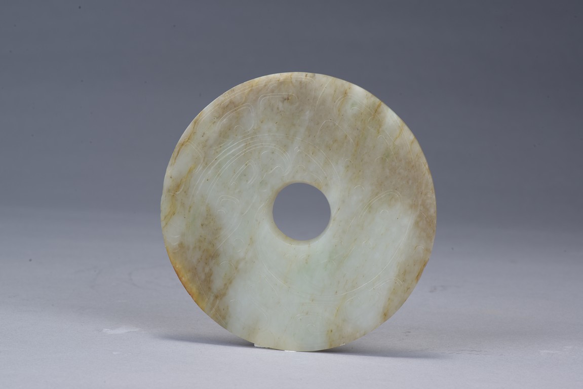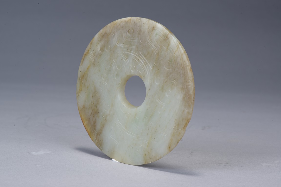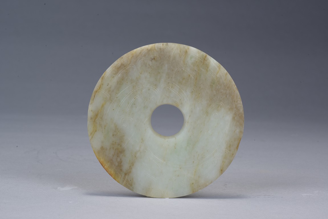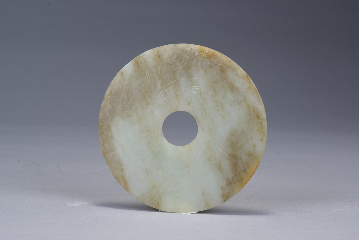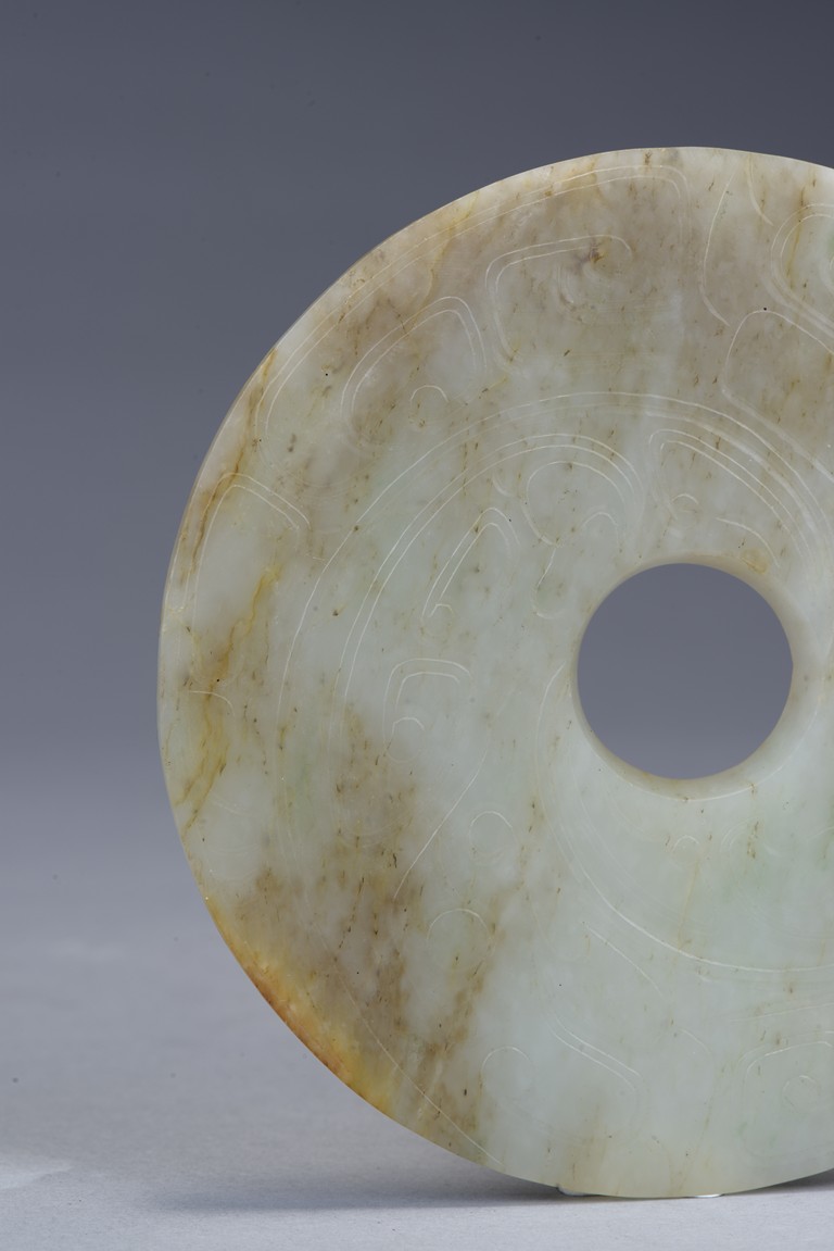 Of circular form with a central aperture, incised with stylized scrolled pattern. Warring State period.